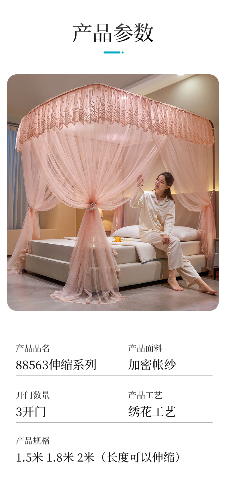 商品名称:夏彩 2024新款加柔加密长度可伸缩蚊帐-88563 88563-玉色
