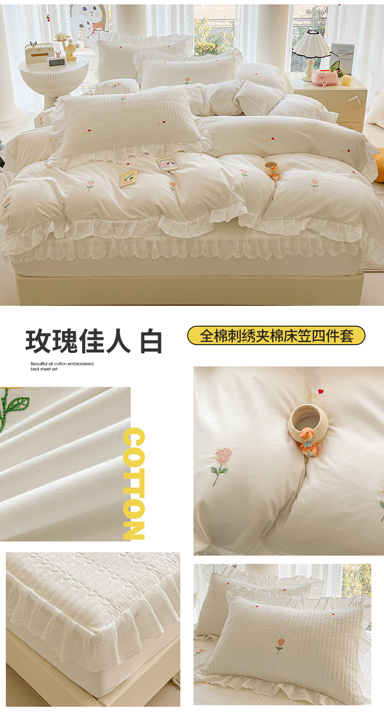 宜凡家纺 2024新款全棉夹棉绣花花边系列床笠四件套 玫瑰佳人 白