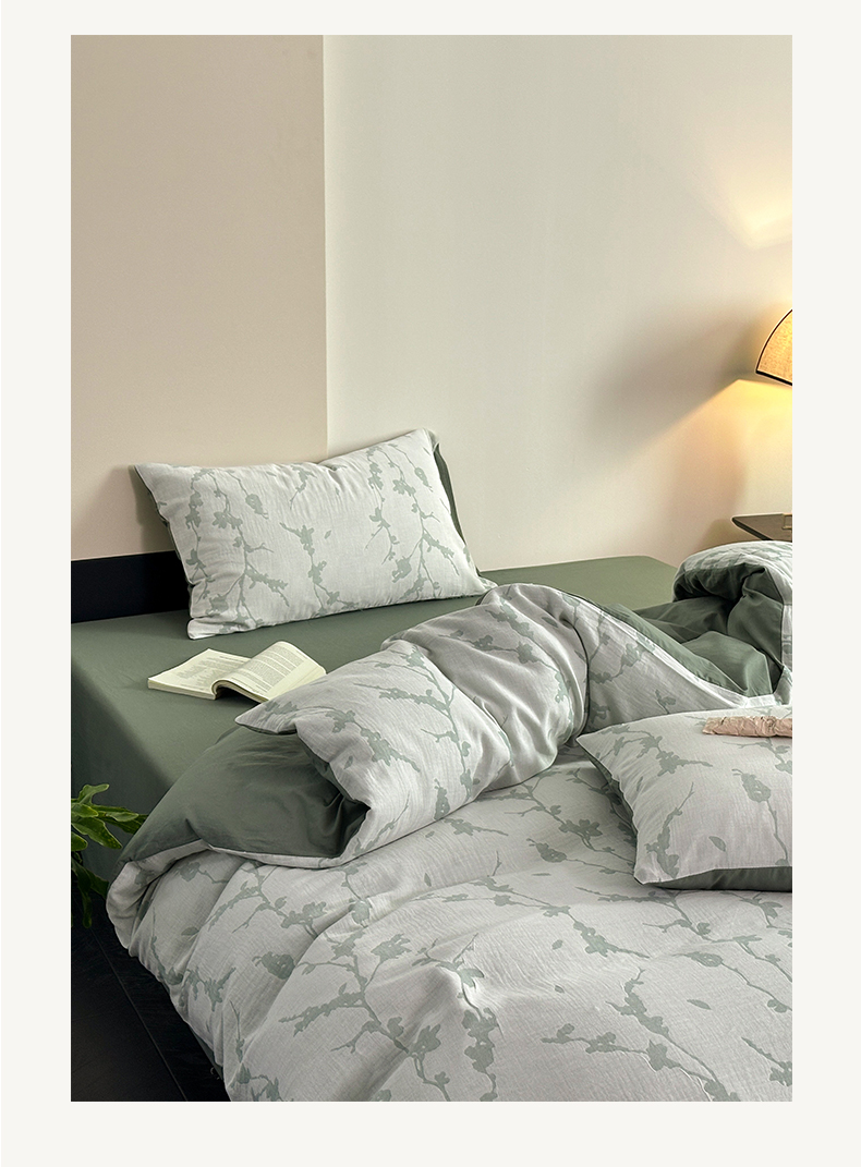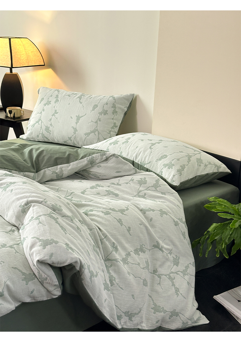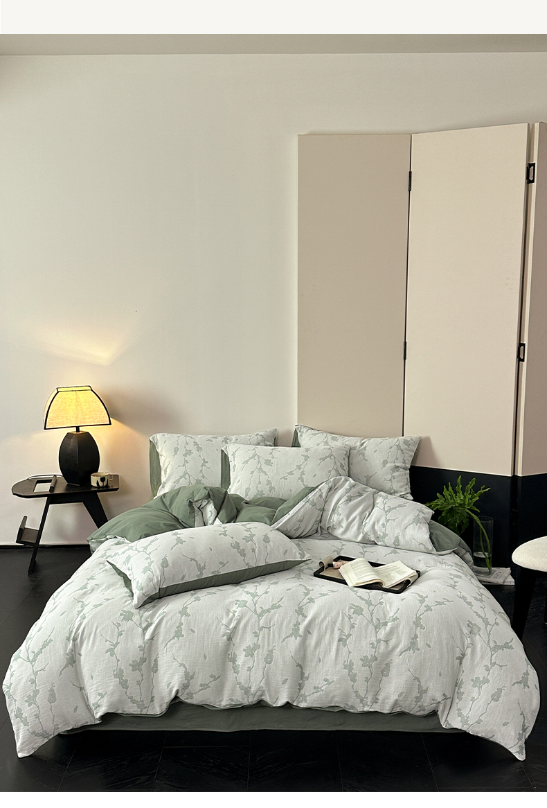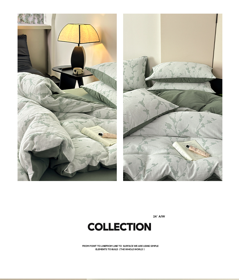 雅居纺家纺 2024新款全棉双层纱色织提花四件套 初春-绿