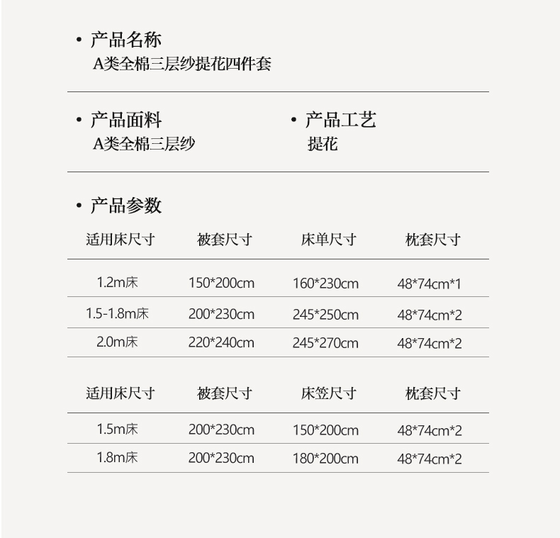 [{"sp_id":11,"sp_name":"\u989c\u8272\u5206\u7c7b","sp_format":2,"sp_list":[{"sp_value_id":657,"sp_value_name":"\u4e03\u91cc\u9999-\u7c89","sp_value_image":{"id":999,"path":"https:\/\/img3.91jf.com\/ghelp\/2024\/20240305\/0e42f57e-f5b9-41eb-9a32-bee3d5d4663a20240305150337206.jpg_30_30.jpg"},"sp_value_video":{"id":0,"img":"","path":"","time":0,"download_num":0,"play_num":0},"price":"135.00","storage":599,"weight":"1.800","is_check_weight":0,"plus_price":"","sp_sort":17}]},{"sp_id":10,"sp_name":"\u9002\u7528\u5e8a\u5c3a\u5bf8","sp_format":1,"sp_list":[{"sp_value_id":38,"sp_value_name":"1.2m\u5e8a\u5355\u6b3e\u4e09\u4ef6\u5957","sp_value_image":{"id":0,"path":""},"sp_value_video":{"id":0,"img":"","path":"","time":0,"download_num":0,"play_num":0},"price":"135.00","storage":100,"weight":"1.800","is_check_weight":0,"plus_price":"","sp_sort":2},{"sp_value_id":40,"sp_value_name":"1.5m\u5e8a\u5355\u6b3e\u56db\u4ef6\u5957","sp_value_image":{"id":0,"path":""},"sp_value_video":{"id":0,"img":"","path":"","time":0,"download_num":0,"play_num":0},"price":"165.00","storage":100,"weight":"2.200","is_check_weight":0,"plus_price":"","sp_sort":4},{"sp_value_id":41,"sp_value_name":"1.8m\u5e8a\u5355\u6b3e\u56db\u4ef6\u5957","sp_value_image":{"id":0,"path":""},"sp_value_video":{"id":0,"img":"","path":"","time":0,"download_num":0,"play_num":0},"price":"165.00","storage":100,"weight":"2.200","is_check_weight":0,"plus_price":"","sp_sort":5},{"sp_value_id":42,"sp_value_name":"2.0m\u5e8a\u5355\u6b3e\u56db\u4ef6\u5957","sp_value_image":{"id":0,"path":""},"sp_value_video":{"id":0,"img":"","path":"","time":0,"download_num":0,"play_num":0},"price":"175.00","storage":99,"weight":"2.620","is_check_weight":1,"plus_price":"","sp_sort":6},{"sp_value_id":736,"sp_value_name":"1.5m\u5e8a\u7b20\u6b3e\u56db\u4ef6\u5957","sp_value_image":{"id":0,"path":""},"sp_value_video":{"id":0,"img":"","path":"","time":0,"download_num":0,"play_num":0},"price":"170.00","storage":100,"weight":"2.200","is_check_weight":0,"plus_price":"","sp_sort":10},{"sp_value_id":766,"sp_value_name":"1.8m\u5e8a\u7b20\u6b3e\u56db\u4ef6\u5957","sp_value_image":{"id":0,"path":""},"sp_value_video":{"id":0,"img":"","path":"","time":0,"download_num":0,"play_num":0},"price":"170.00","storage":100,"weight":"2.200","is_check_weight":0,"plus_price":"","sp_sort":14}]}]