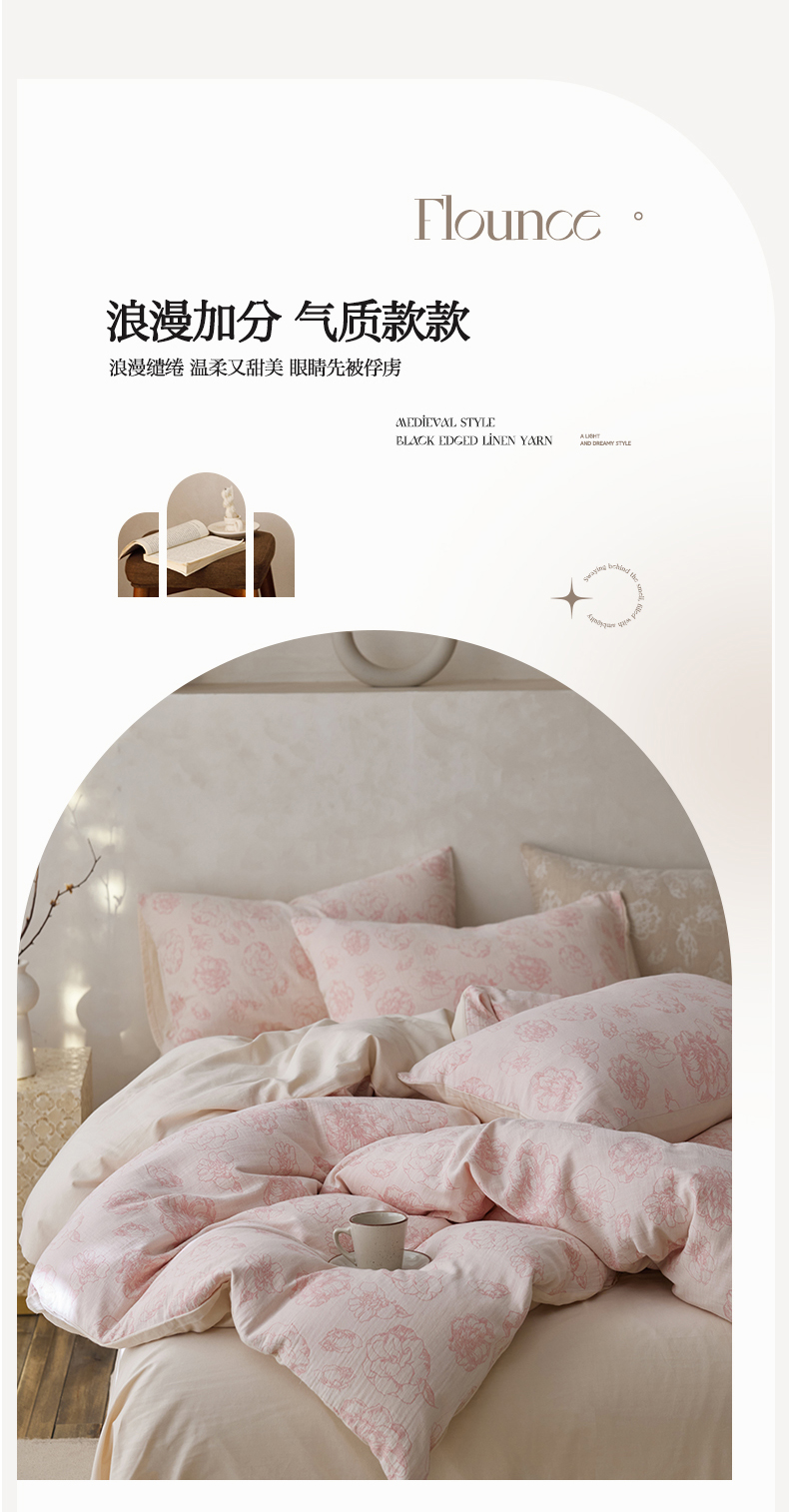 (总)卡巴伦家纺 2025新款棉麻色织一字针提花四件套(会员:-20元 控价:298元),草木笙-灰,草木笙-咖,芳叶红,花间语-红,花间语-咖
