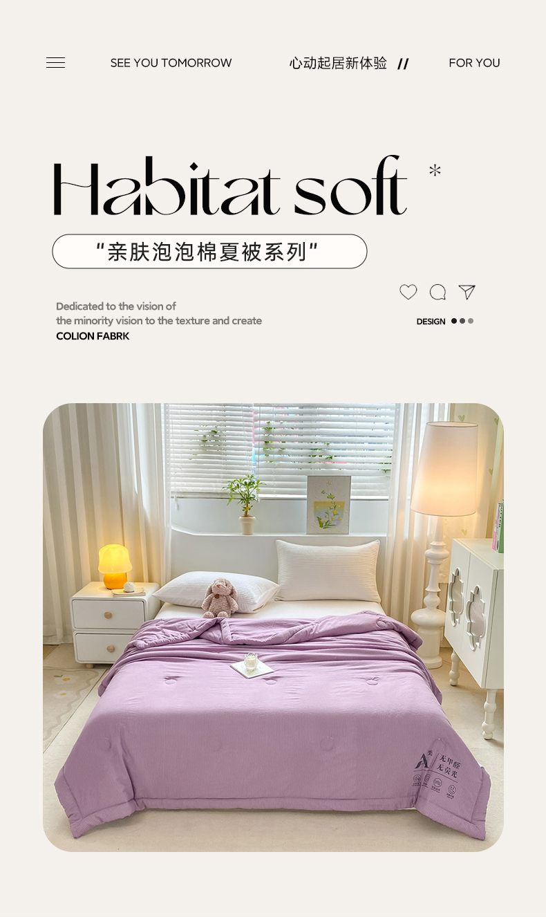 当前位置: 91家纺网 > 商品网购 > 床品套件 > 四件套 > 夏被四件套 > 恋之巢2024新款泡泡棉夏被四件套 单夏被 纯色夏被大豆蛋白抗菌纤维棉被 华丽紫