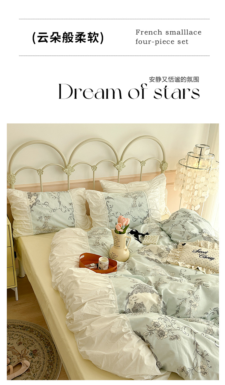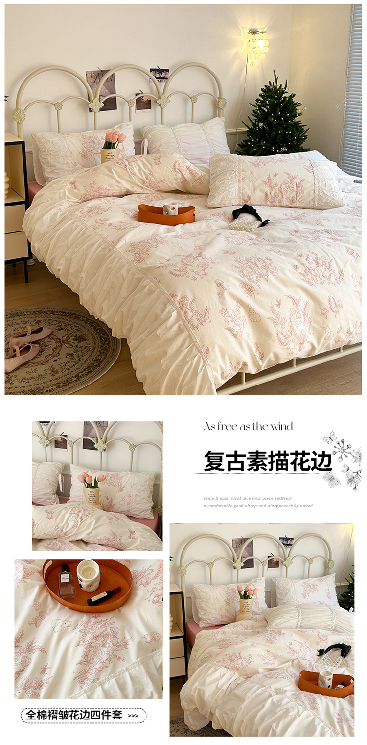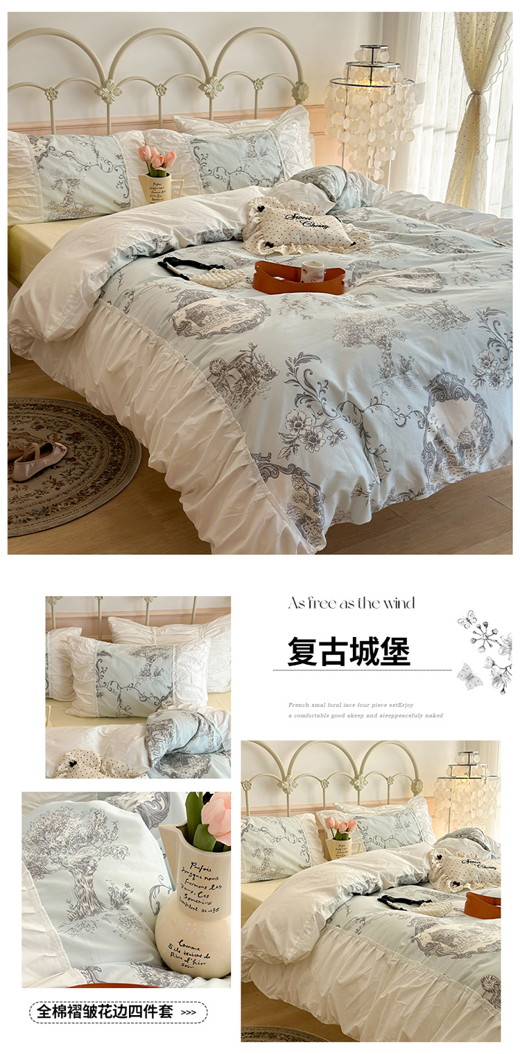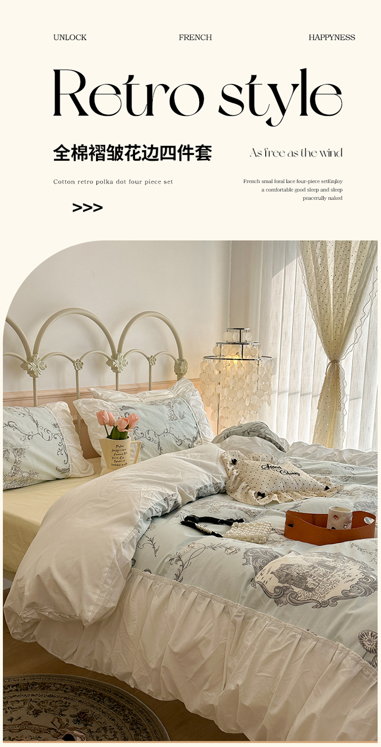 (总)昔可 新款褶皱花边全棉复古风四件套