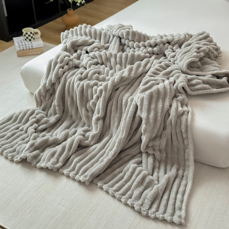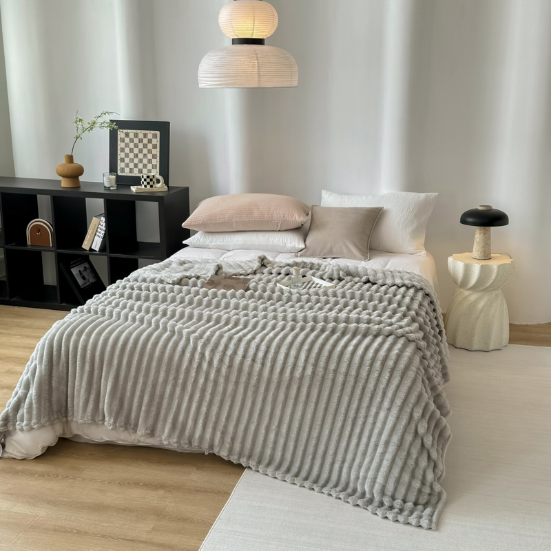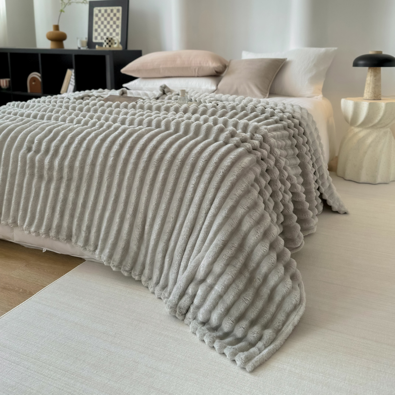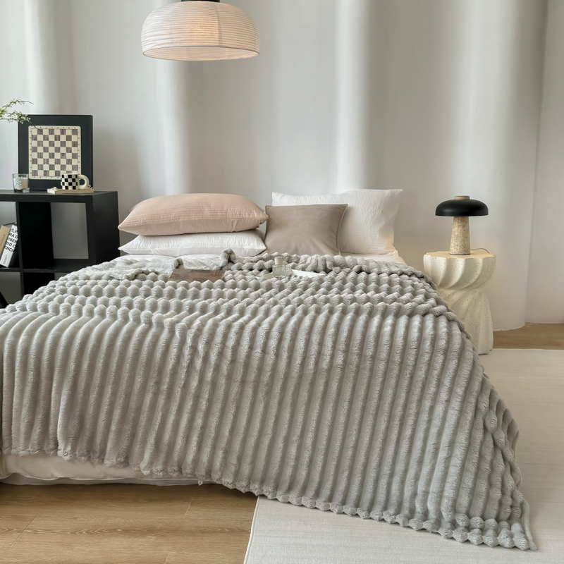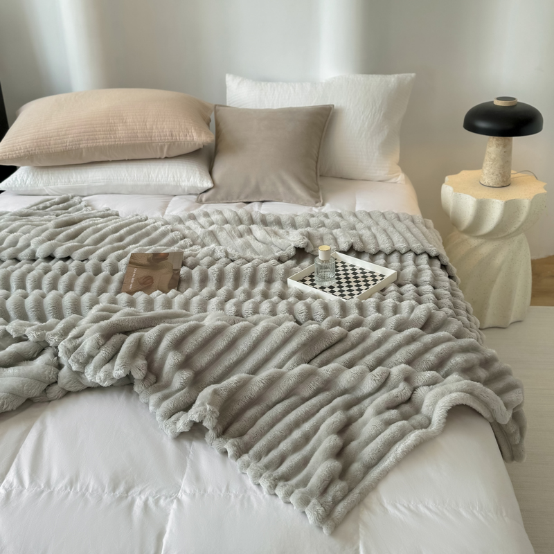 羋多 2024新款跨境仿兔毛绒多功能毛毯高克重魔法绒4公分宽抽条毛毯 玛瑙灰
