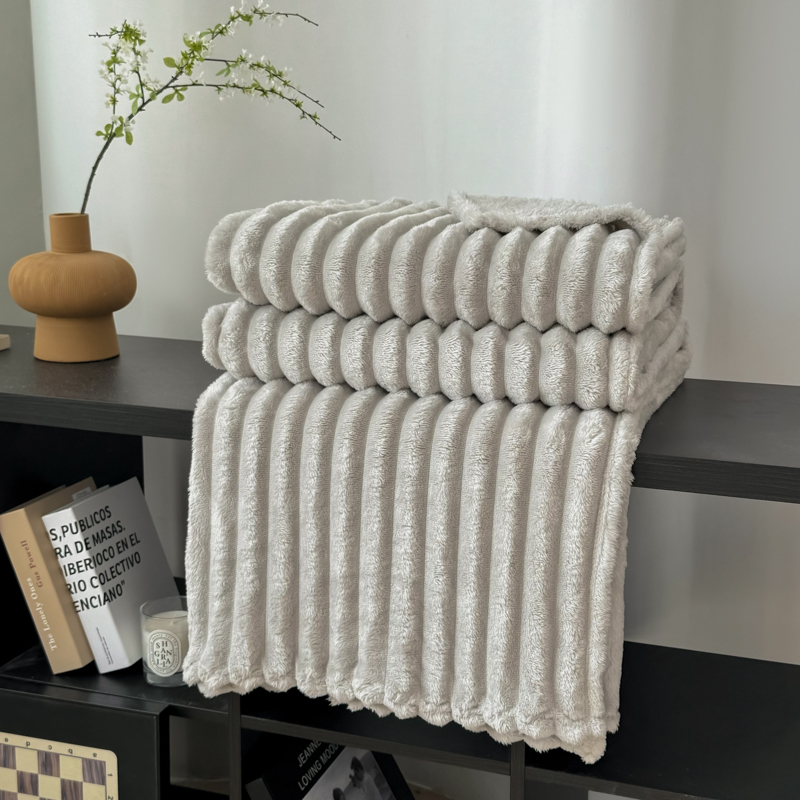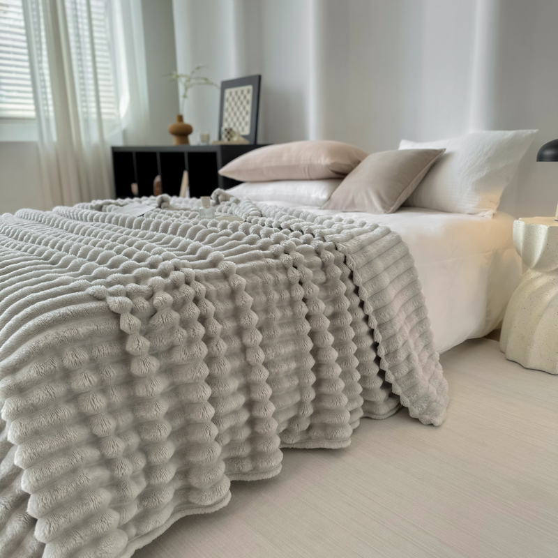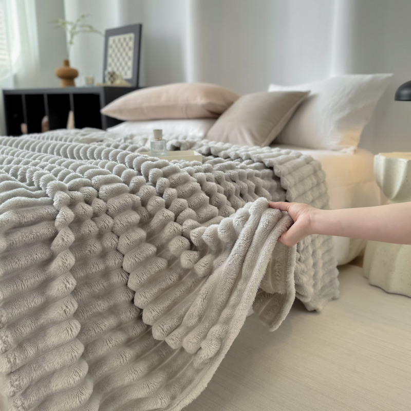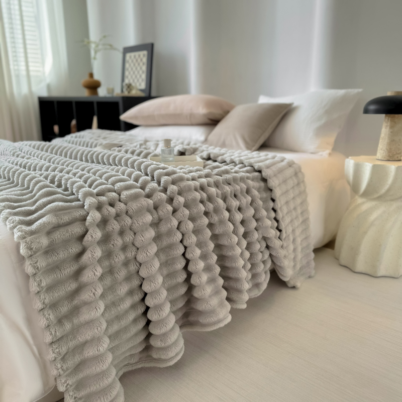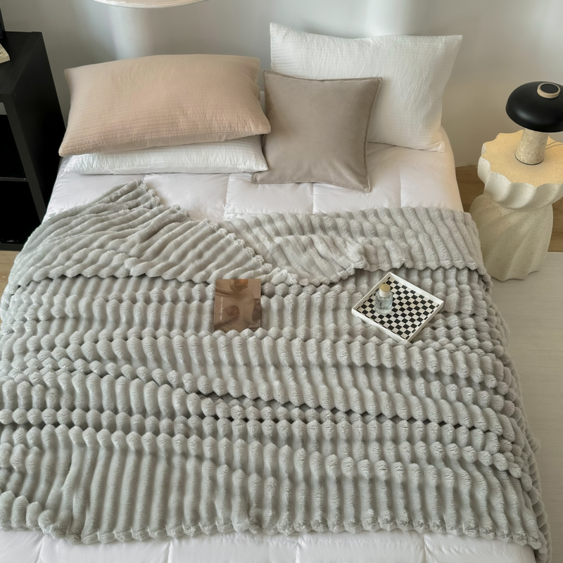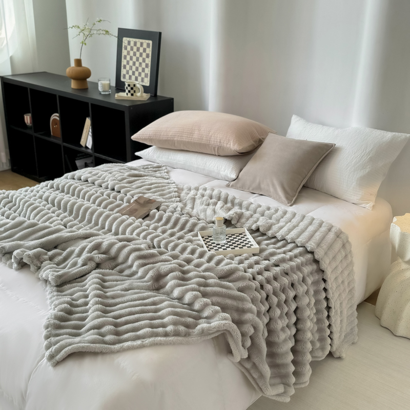 羋多 2024新款跨境仿兔毛绒多功能毛毯高克重魔法绒4公分宽抽条毛毯 玛瑙灰