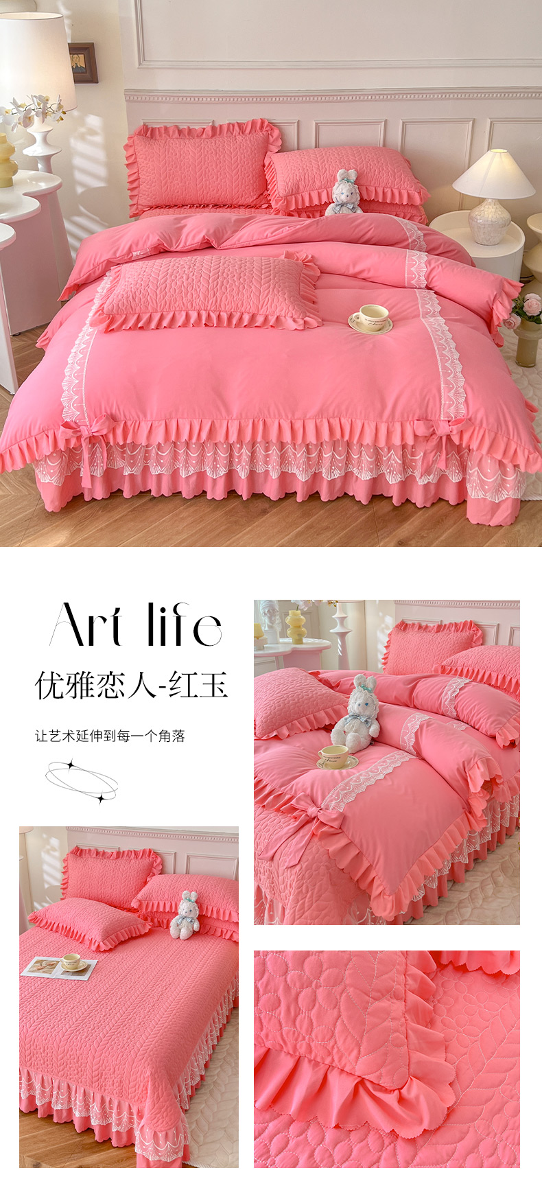 商品名称:唐人居 2025新款韩式花边蝴蝶结床盖四件套-优雅恋人 优雅恋人-红玉