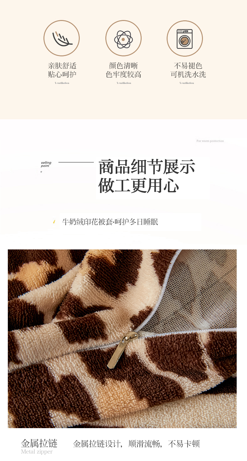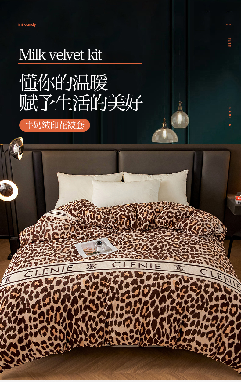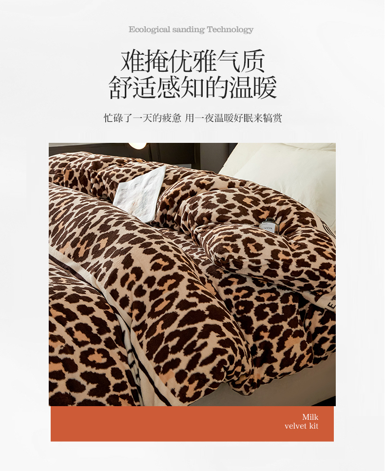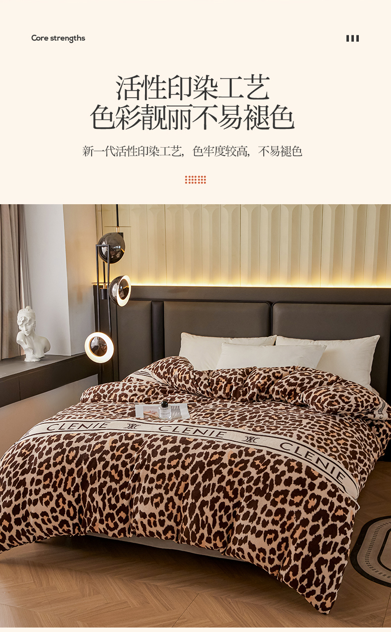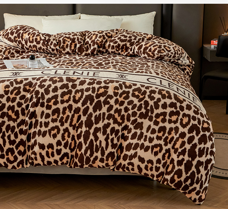商品名称:董韵家纺 2025新款高克重全消光牛奶绒法莱绒金貂绒印花单品被套床裙四件套(提供买家秀) 豹纹元素