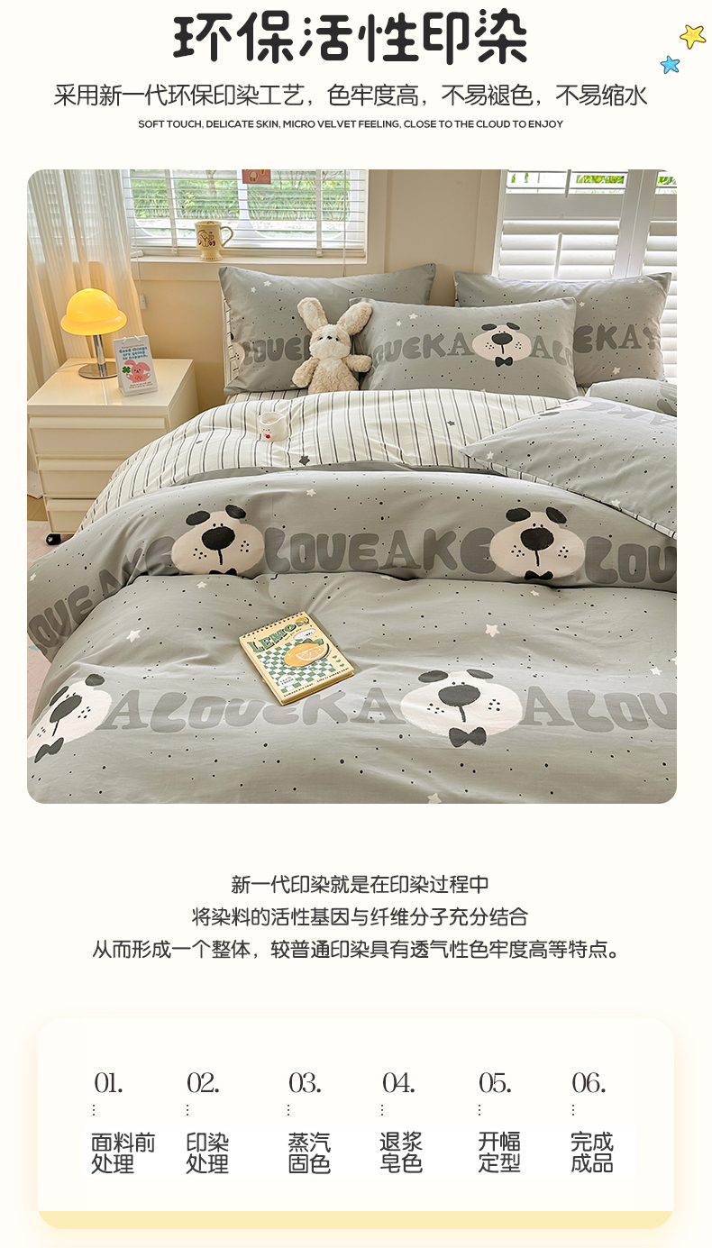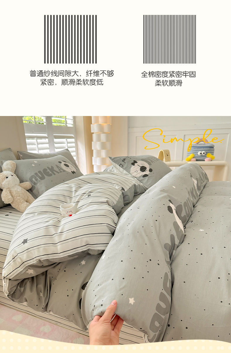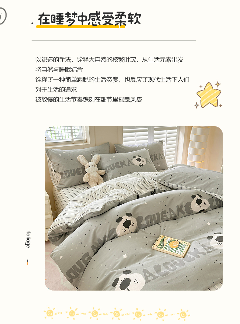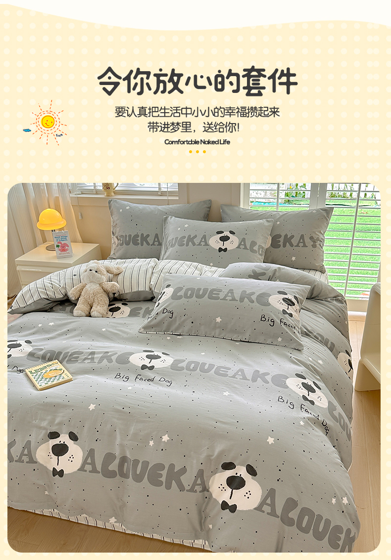 当前位置: 91家纺网 > 商品网购 > 床品套件 > 四件套 > 全棉普通四件套 > 小懒猪 2024春夏新款全棉卡通印花四件套斑点狗