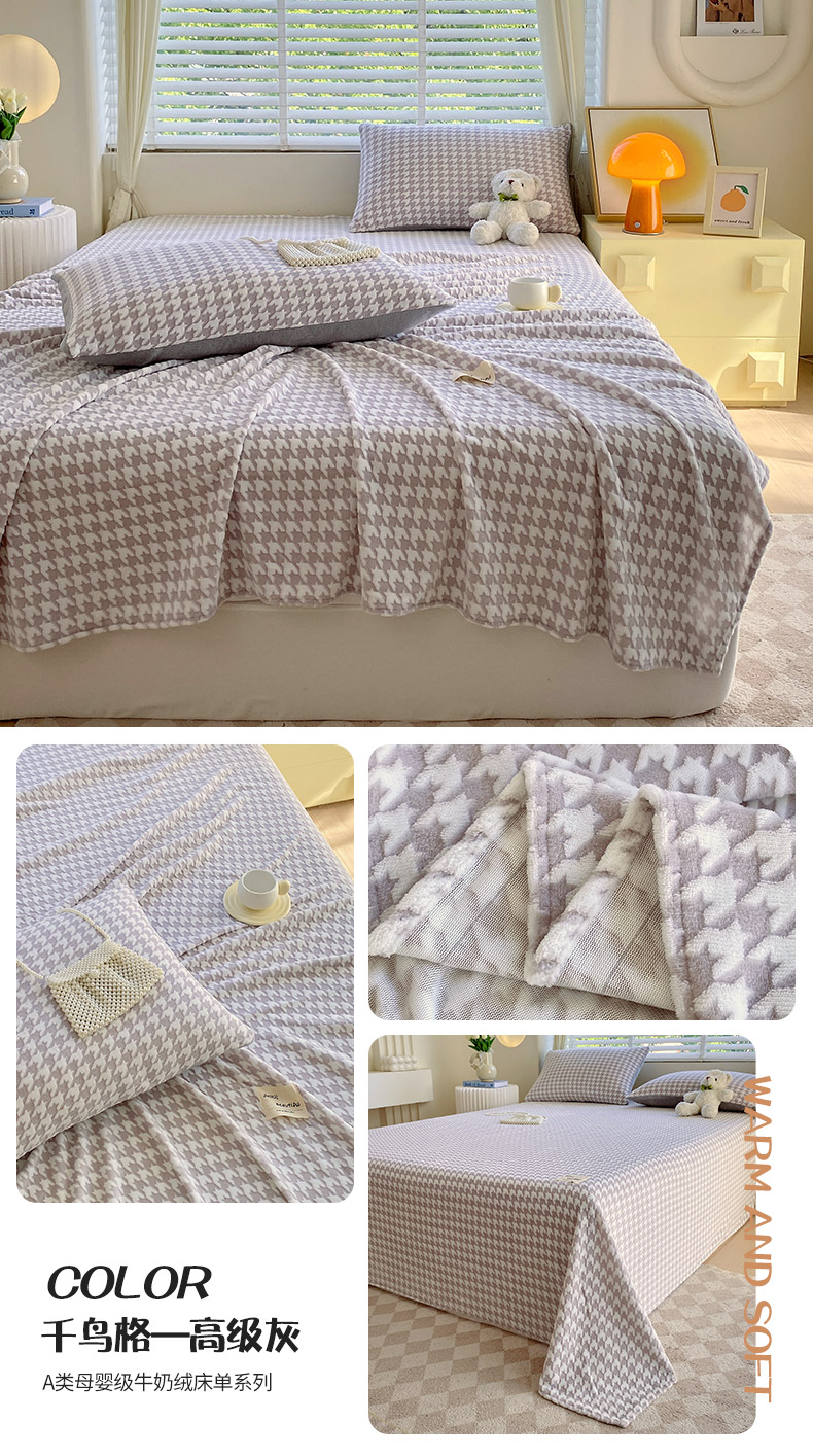 莱米家纺 2024新款秋冬华夫格加密千鸟格牛奶绒床单 千鸟格-高级灰