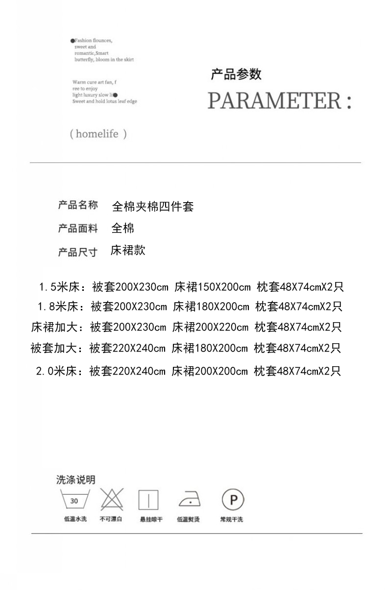 1.5m床单款四件套【被套200*230+床裙150*200+枕套2只】 | ¥225.00 |