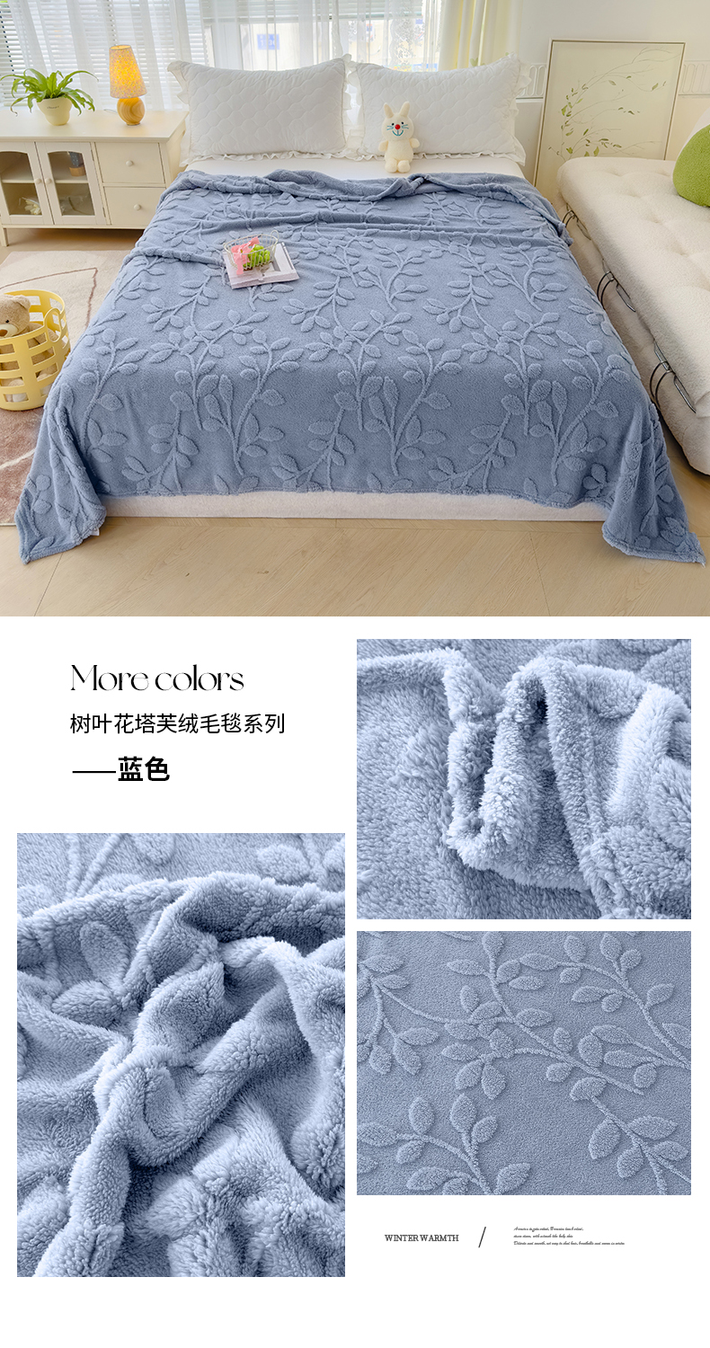 商品名称:枋梢家纺 2024新款跨境电商发财树塔芙绒纯色发财树提花多功能盖毯午睡毯子办公毛毯 蓝色