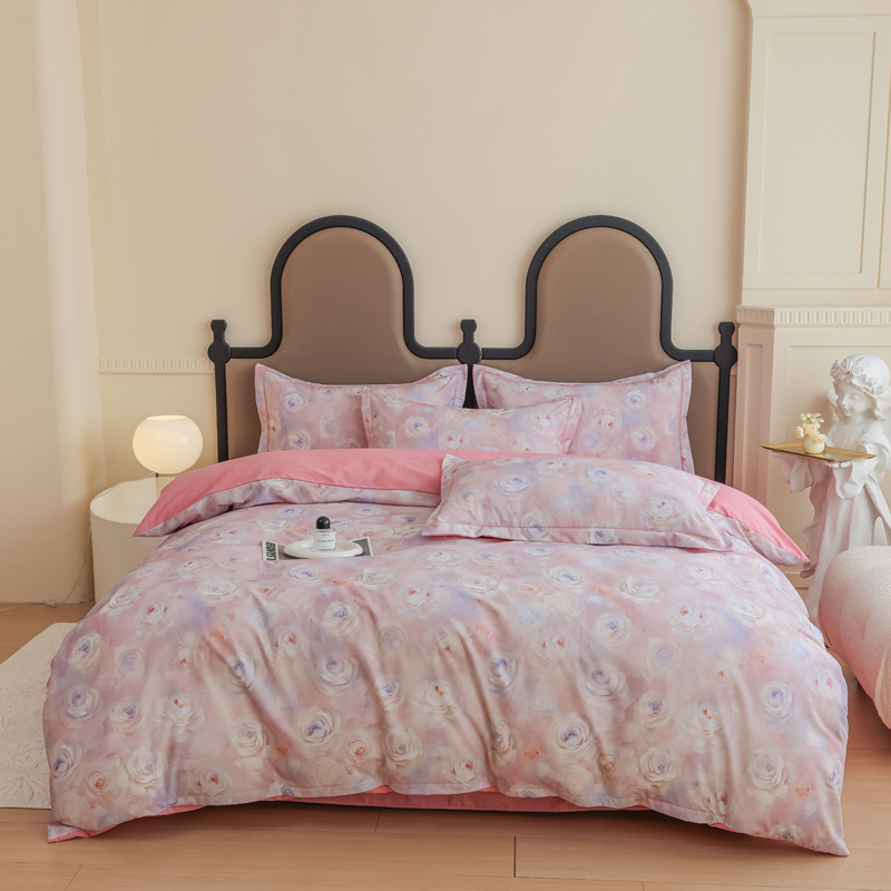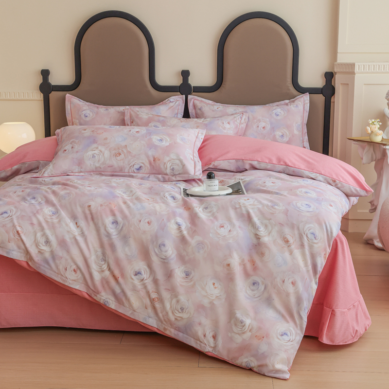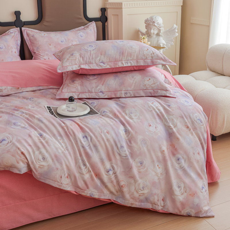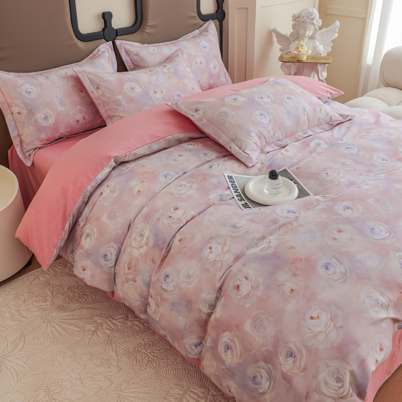 2024新款全棉加厚长绒棉数码印花四件套 花田物语-粉