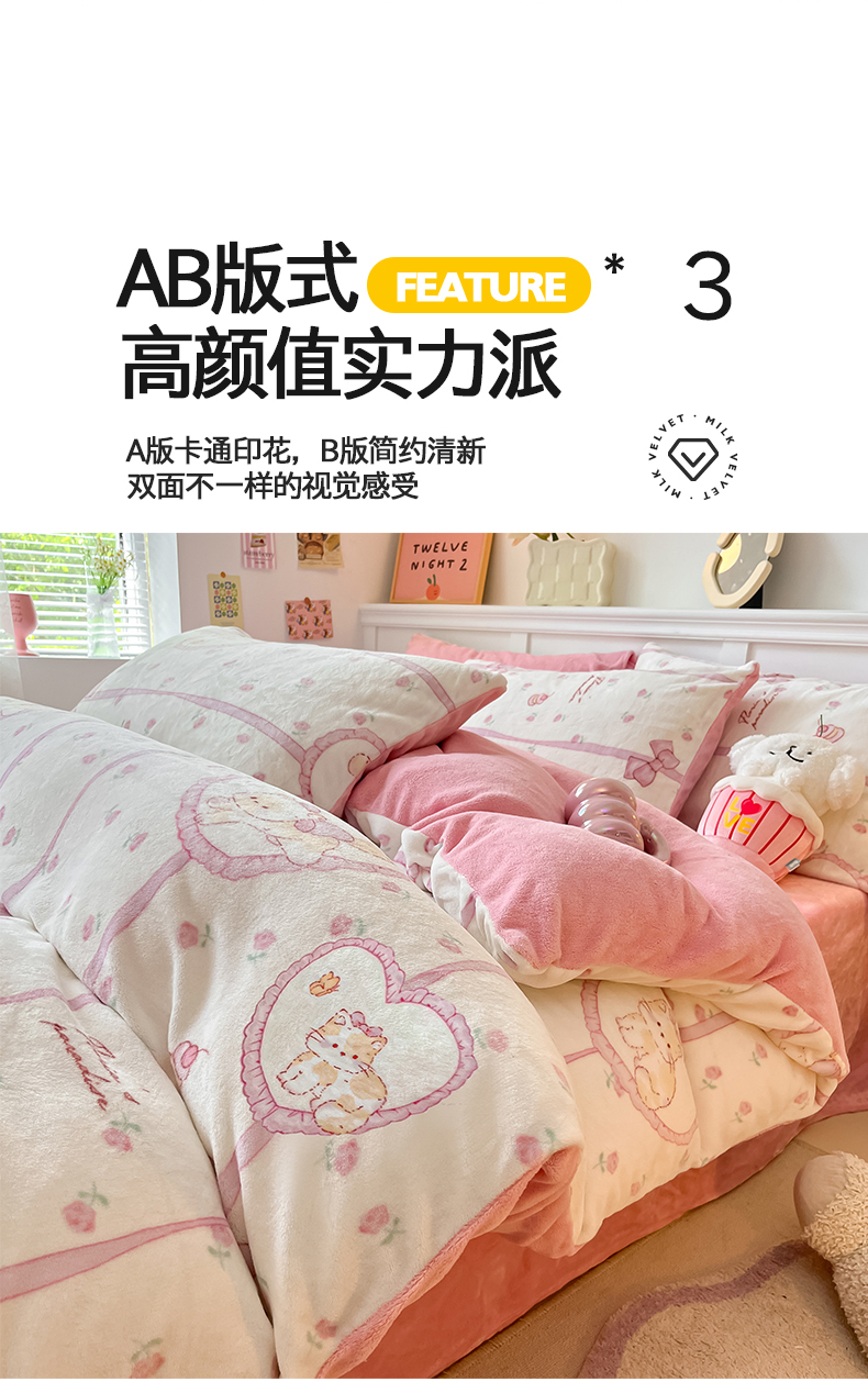 桃子家居 2024新款小清新卡通加厚牛奶绒全工艺200克印花牛奶绒系列四件套 绒-公主喵