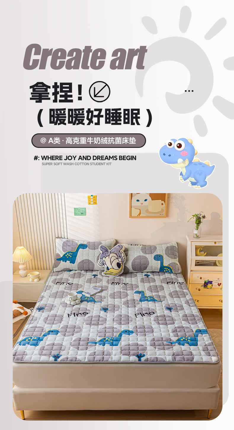 商品名称:卡伦家纺 2025新款A类牛奶绒夹棉加厚床垫单人双人床垫保护垫 星幻恐龙