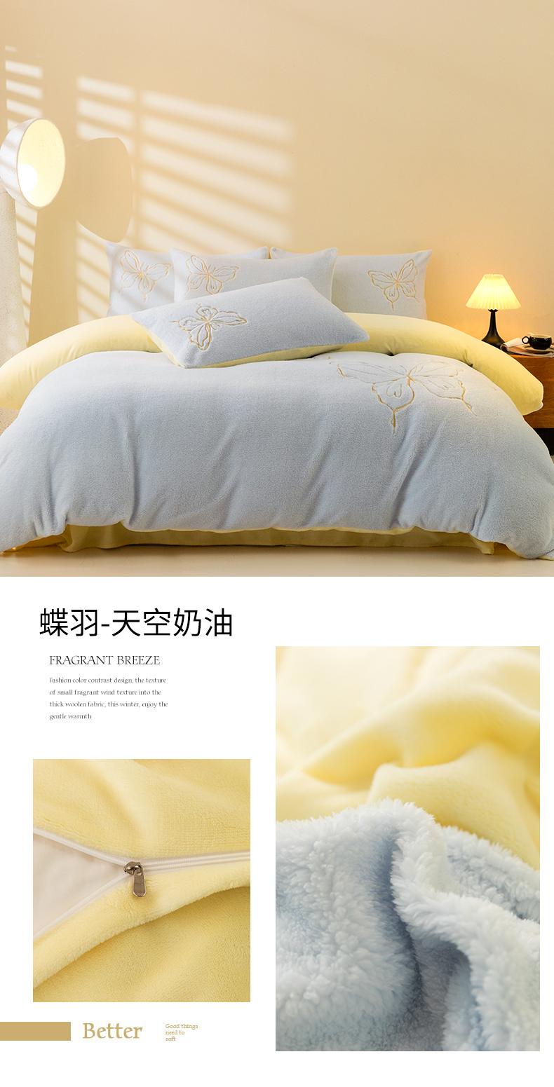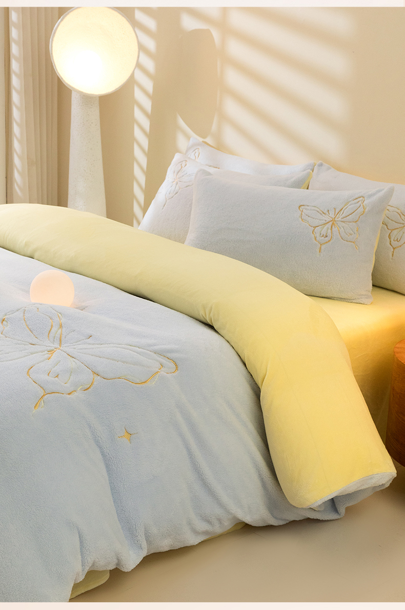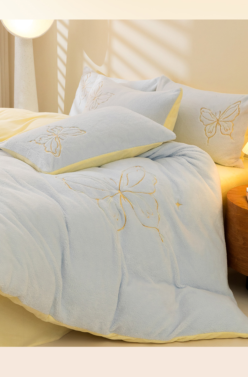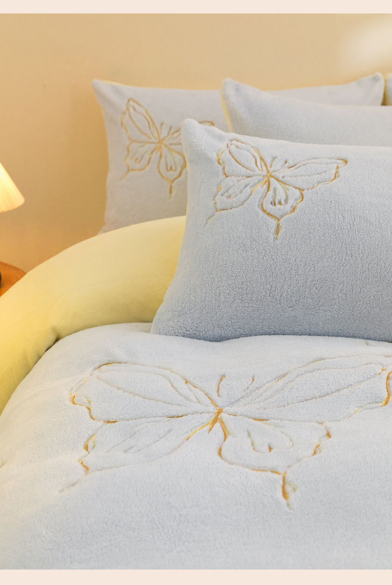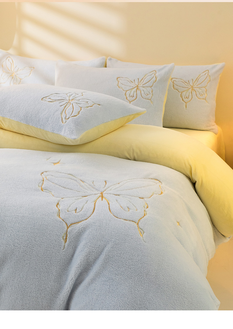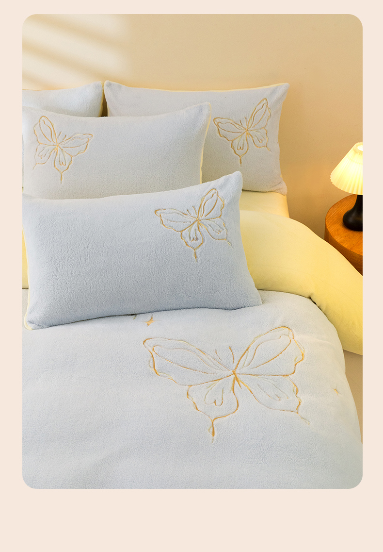 商品名称:2024新保暖-秋冬A类南极绒刺绣四件套-蝶羽系列 蝶羽-天空奶油