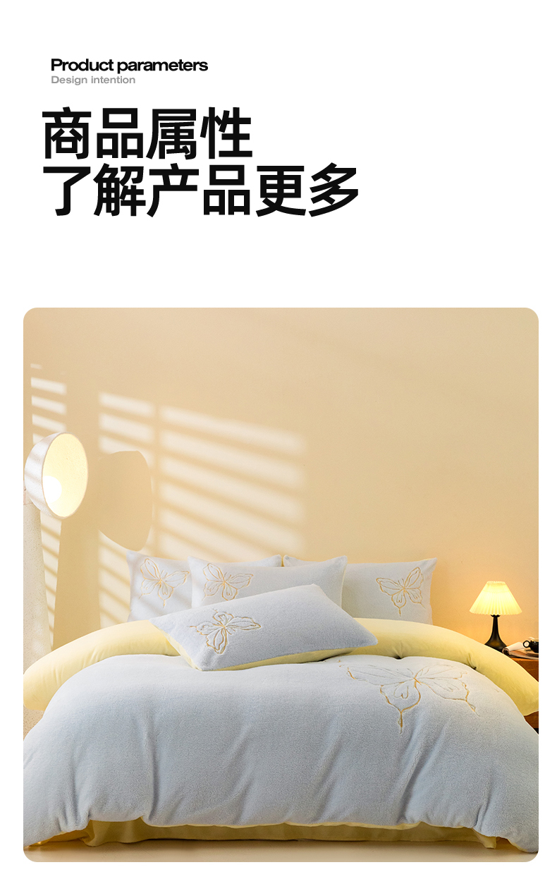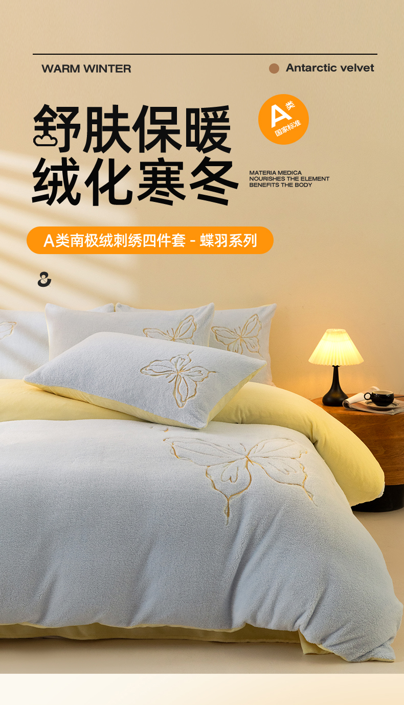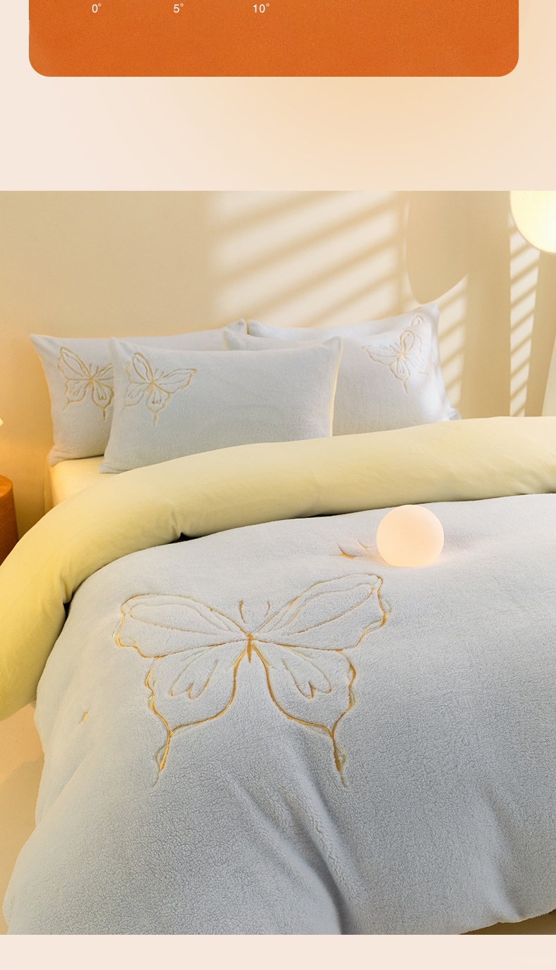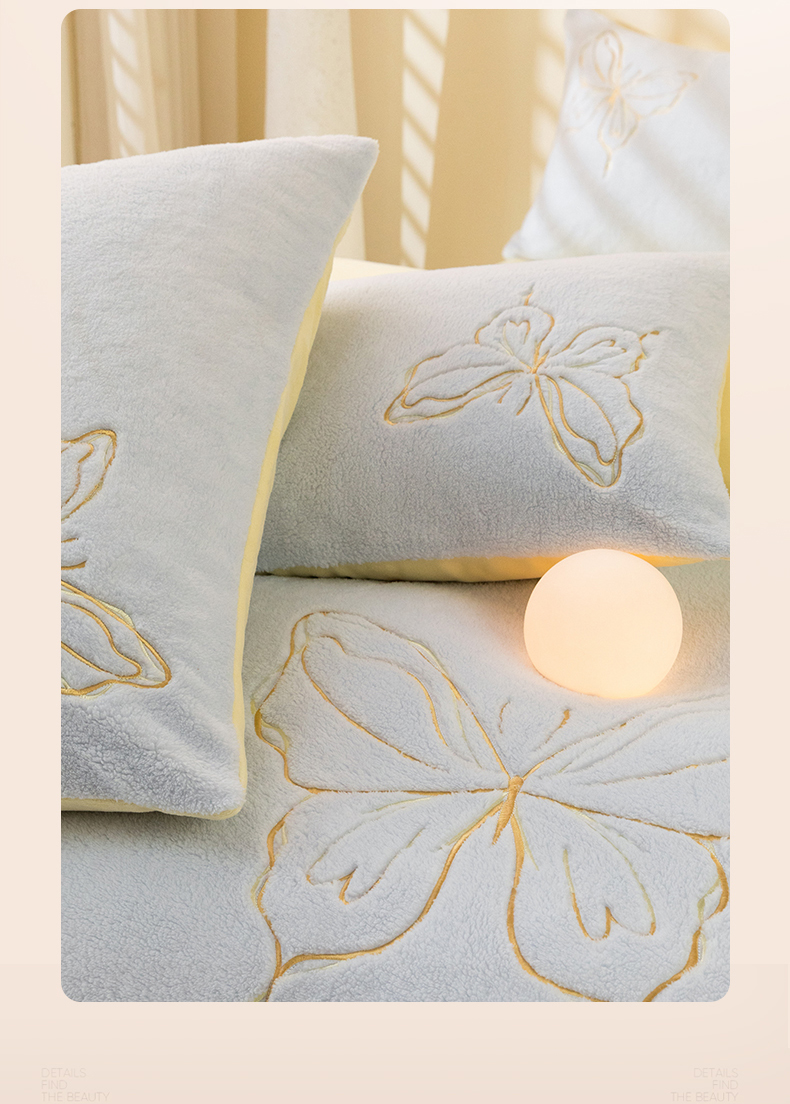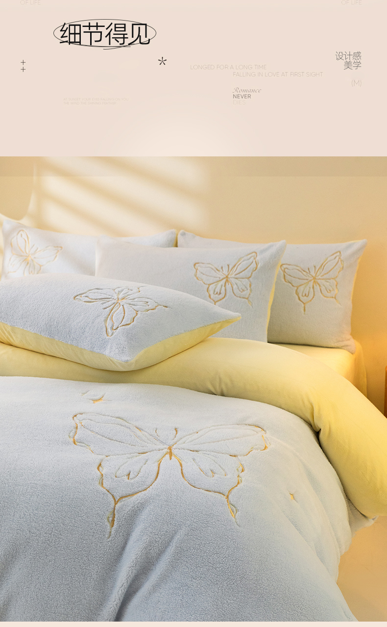 商品名称:2024新保暖-秋冬A类南极绒刺绣四件套-蝶羽系列 蝶羽-天空奶油