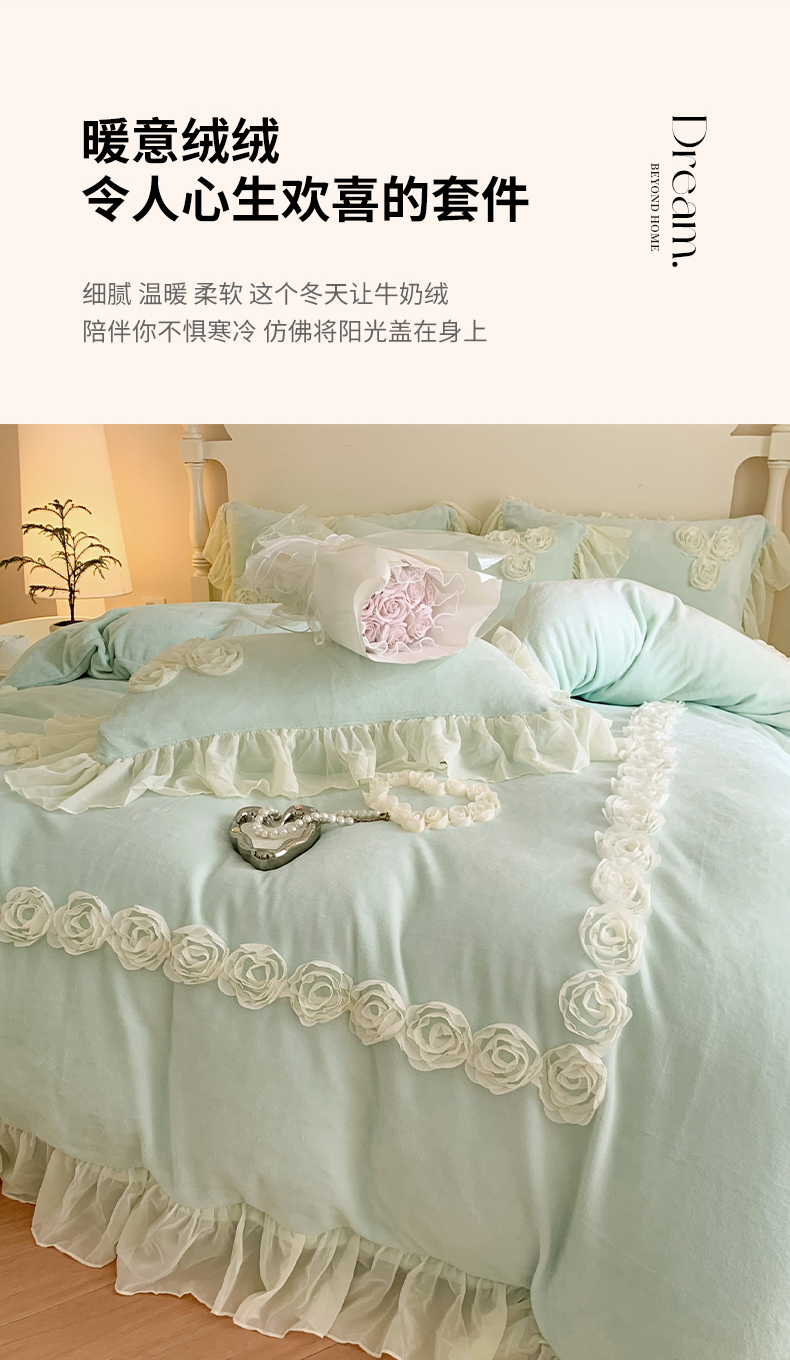 富盛家纺 2024新款牛奶绒盘花刺绣四件套-玫瑰花园 玫瑰花园-绿