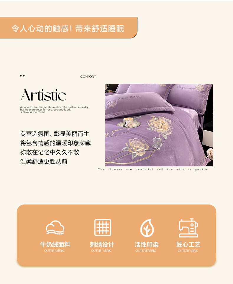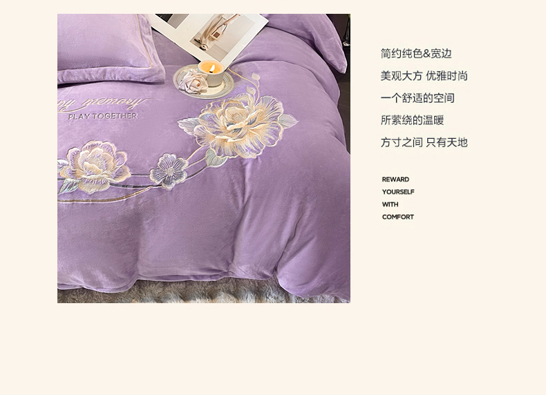 商品名称:畅畅家纺 2024秋冬新款牛奶绒绣花四件套 芳华-伊莉莎系列 芳华-紫
