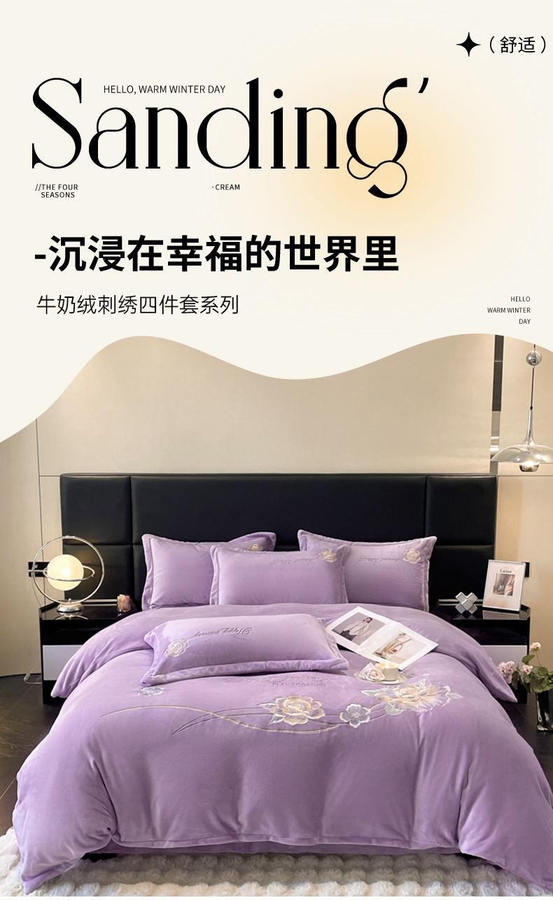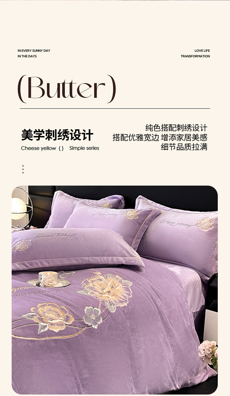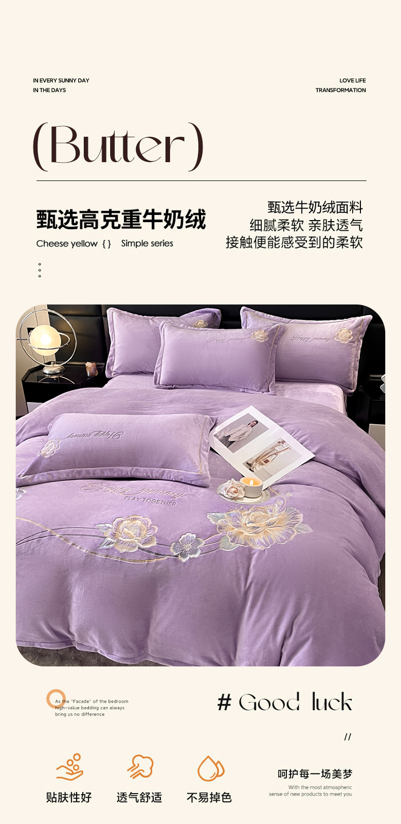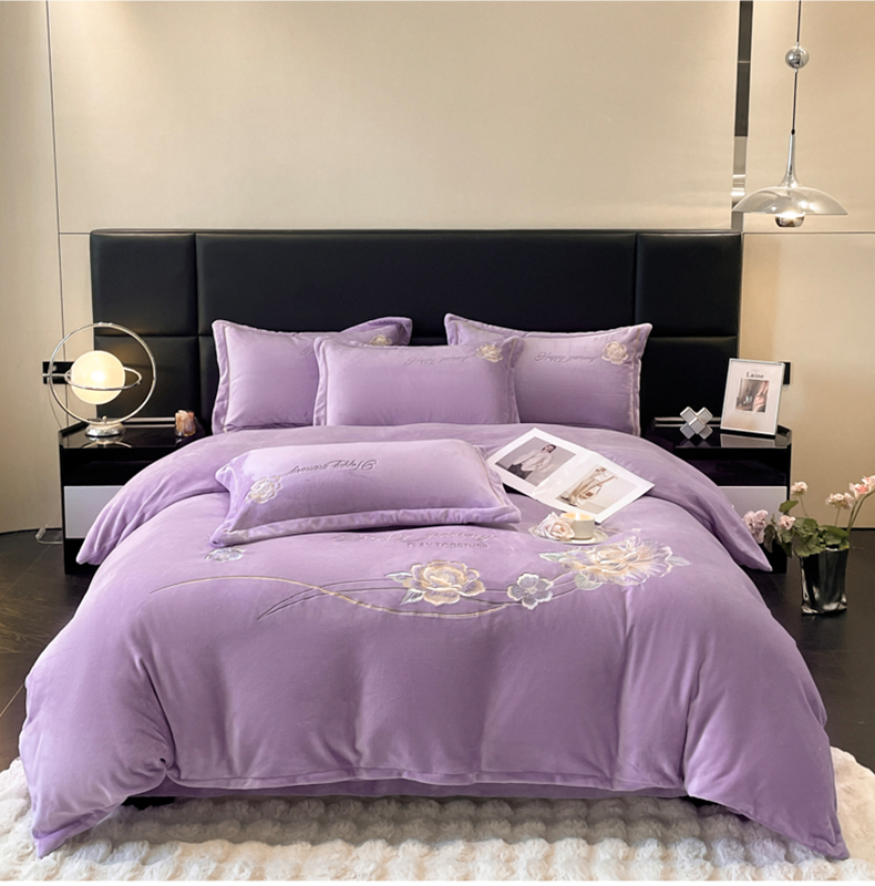 畅畅家纺 2024秋冬新款牛奶绒绣花四件套 芳华-伊莉莎系列 芳华-紫