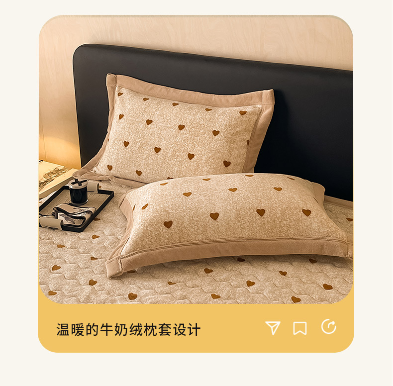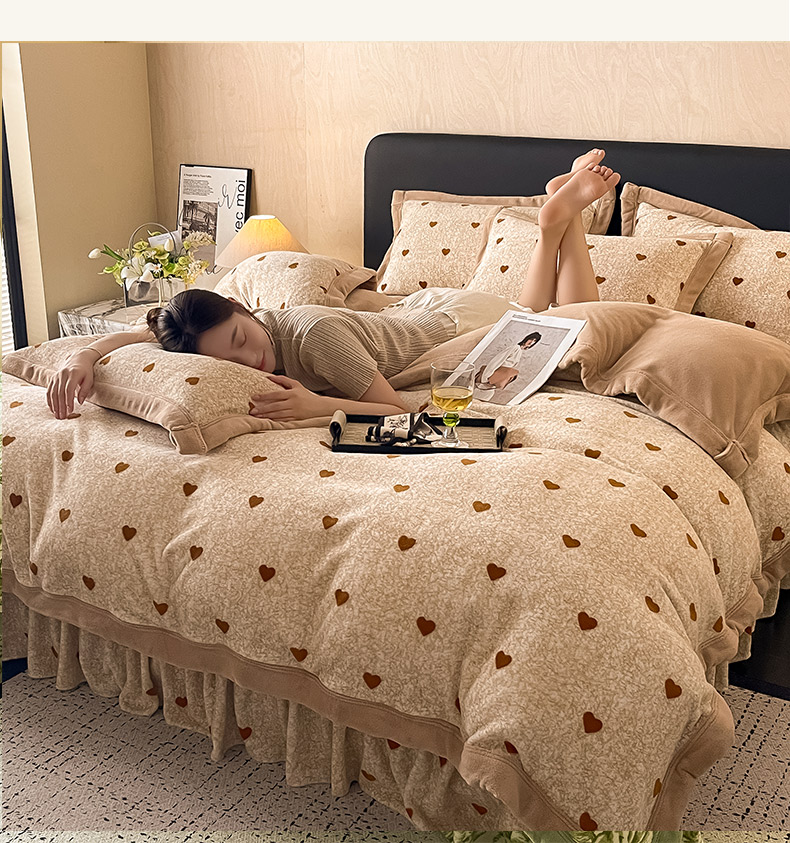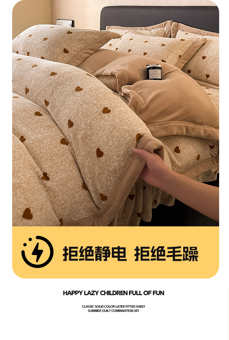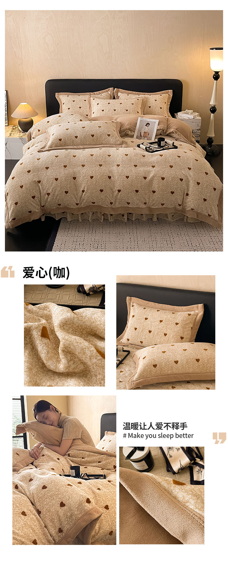 当前位置: 91家纺网 > 商品网购 > 床品套件 > 四件套 > 牛奶绒四件套 > 茉保家纺 2025新款花边款牛奶绒床盖四件套 爱心(咖)