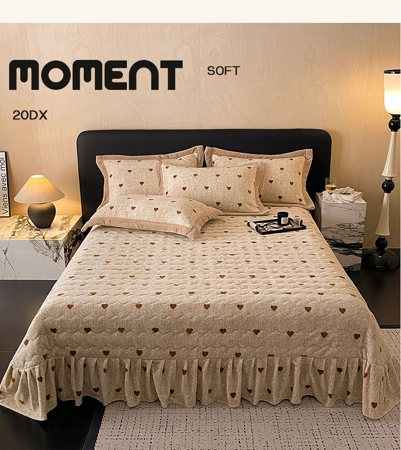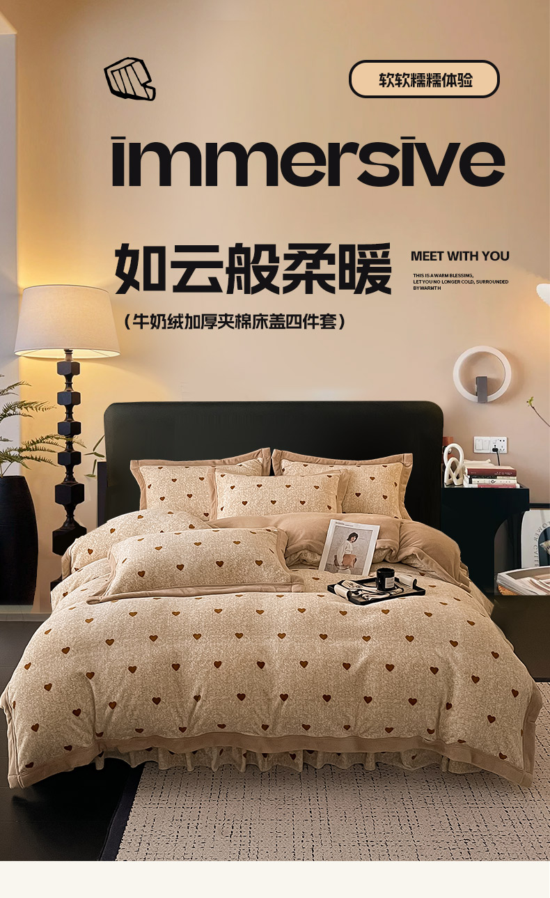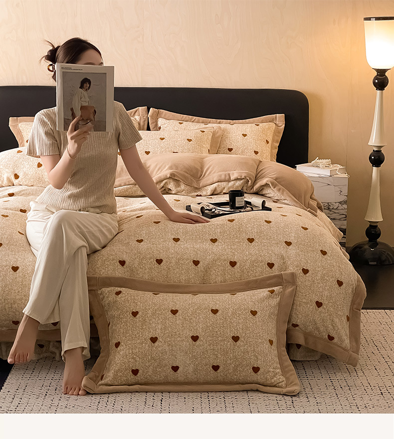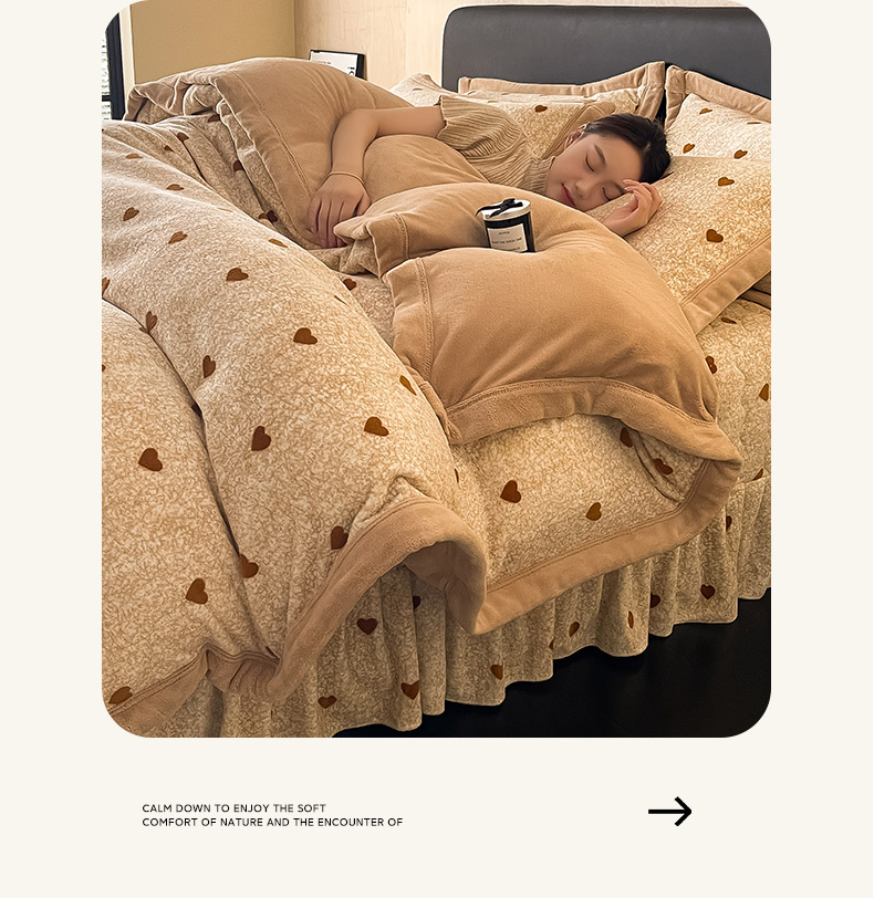 当前位置: 91家纺网 > 商品网购 > 床品套件 > 四件套 > 牛奶绒四件套 > 茉保家纺 2025新款花边款牛奶绒床盖四件套 爱心(咖)