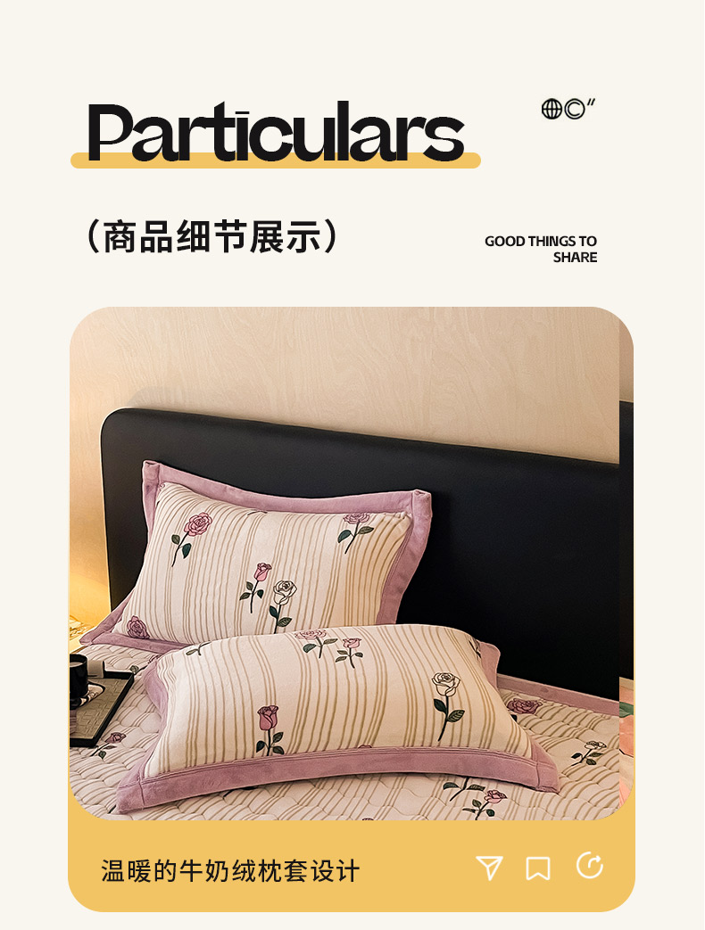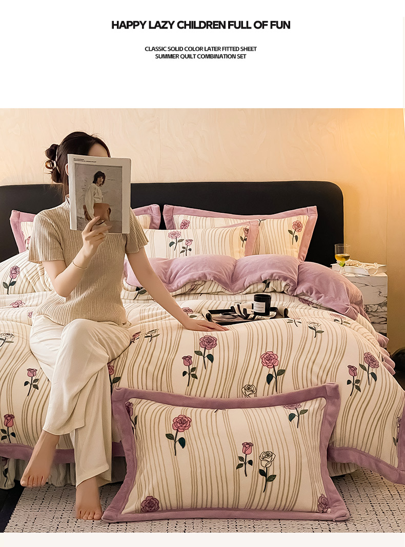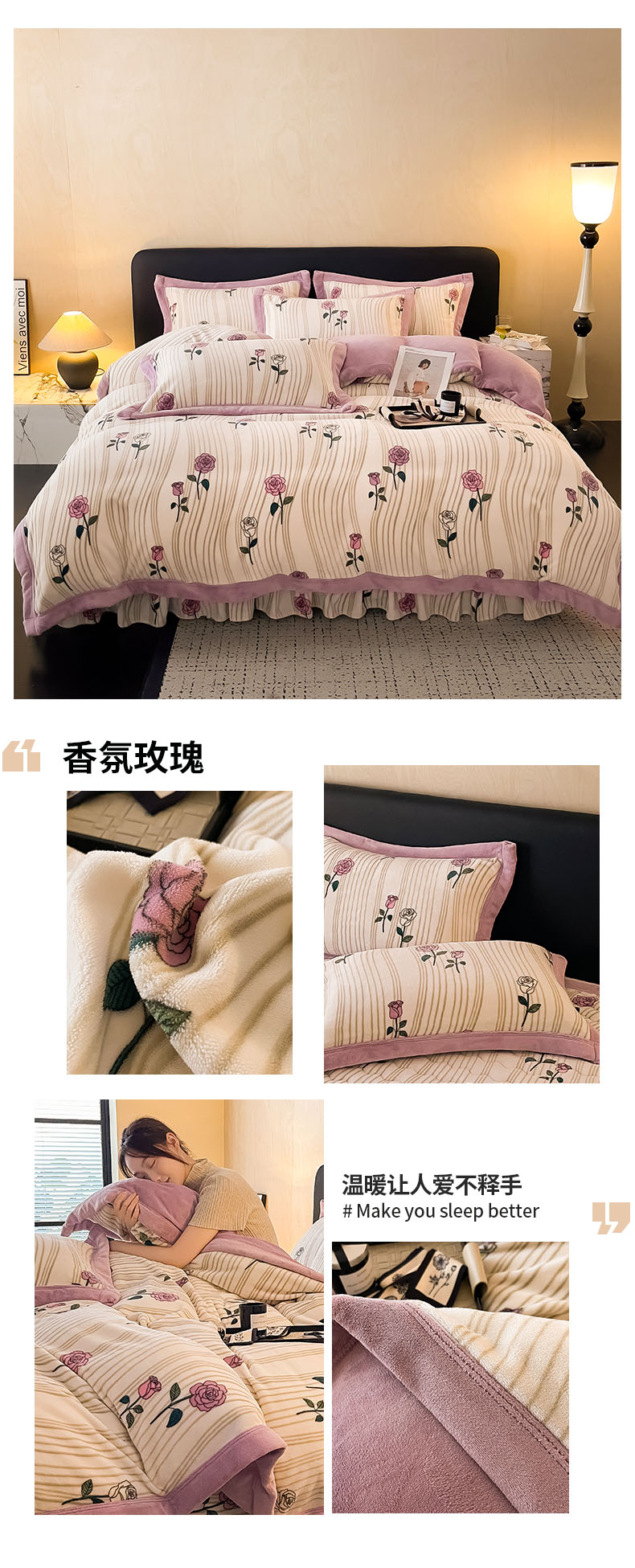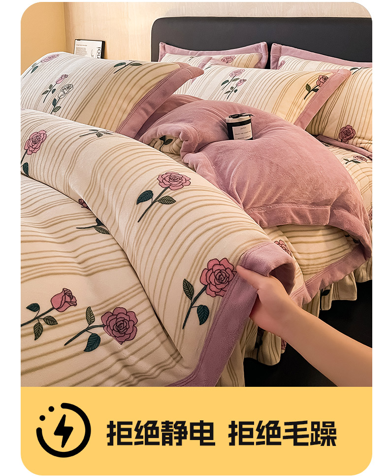 当前位置: 91家纺网 > 商品网购 > 床品套件 > 四件套 > 牛奶绒四件套 > 茉保家纺 2025新款花边款牛奶绒床盖四件套 香氛玫瑰