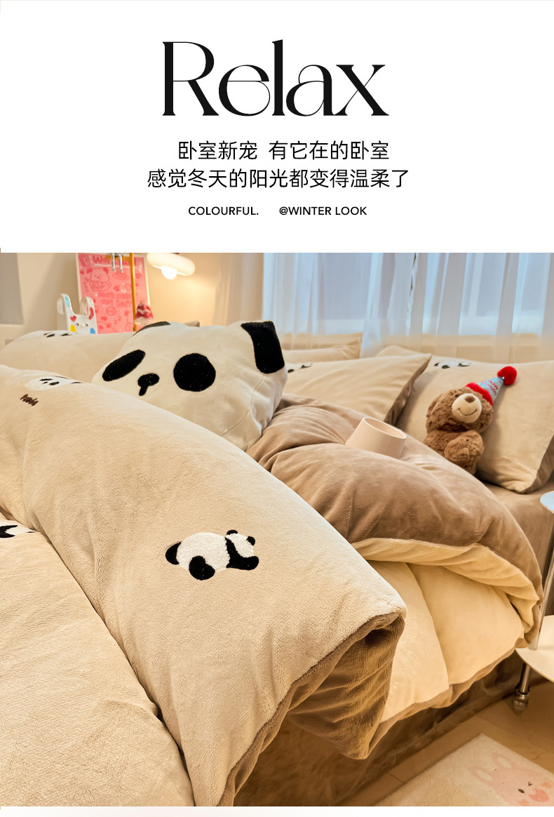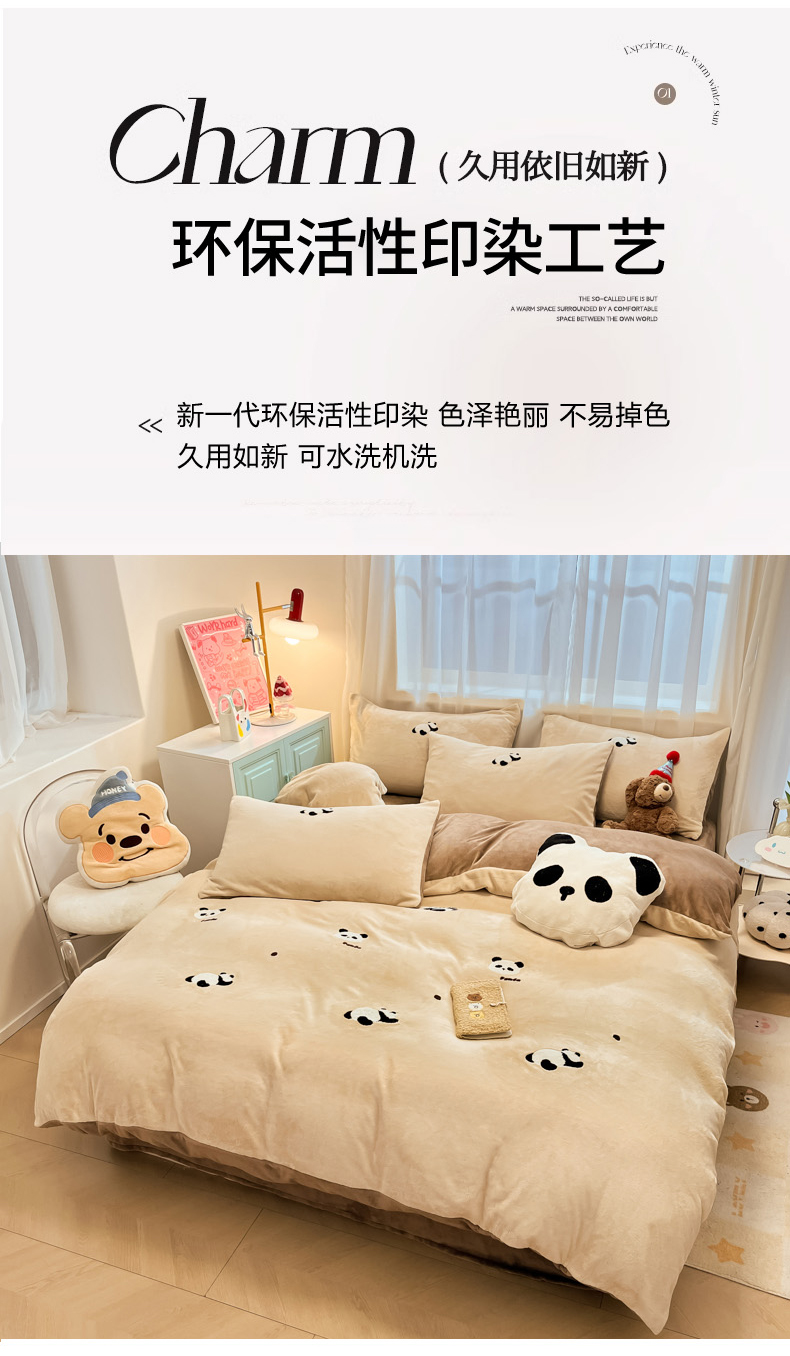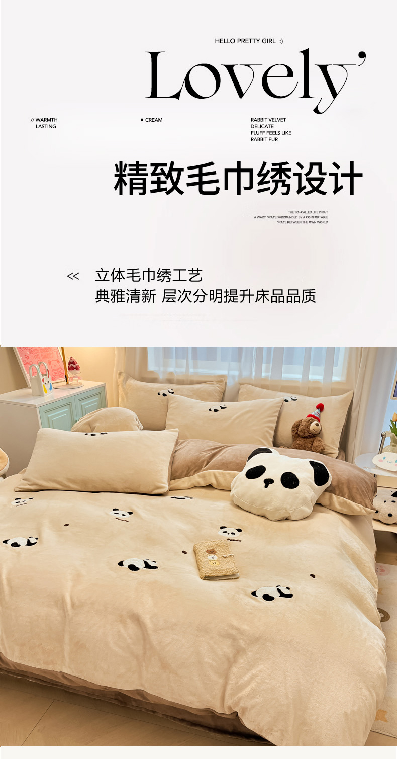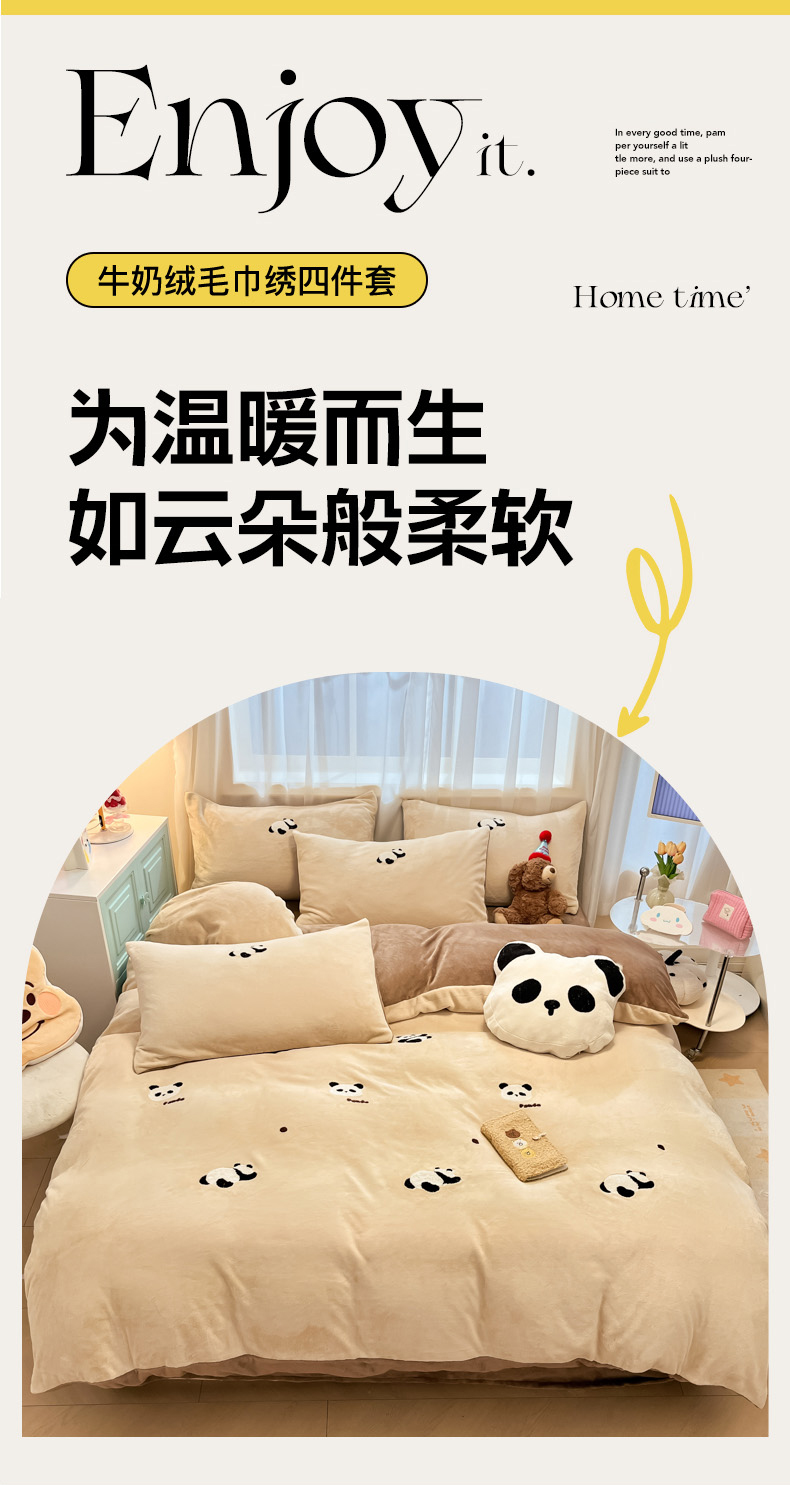当前位置: 91家纺网 > 商品网购 > 床品套件 > 四件套 > 牛奶绒四件套 > 慕尚家纺 2025新款牛奶绒毛巾绣刺绣四件套 熊猫天下 咖