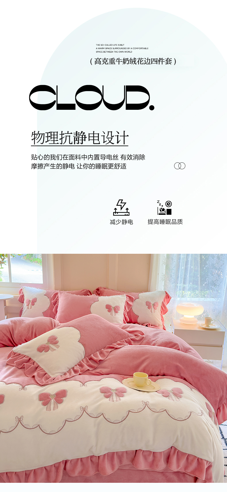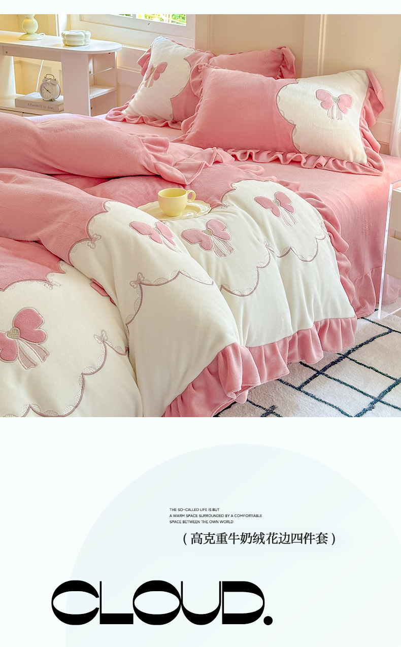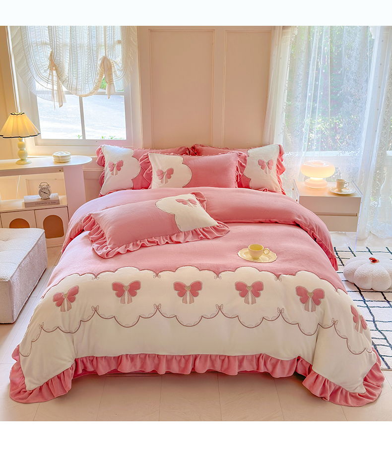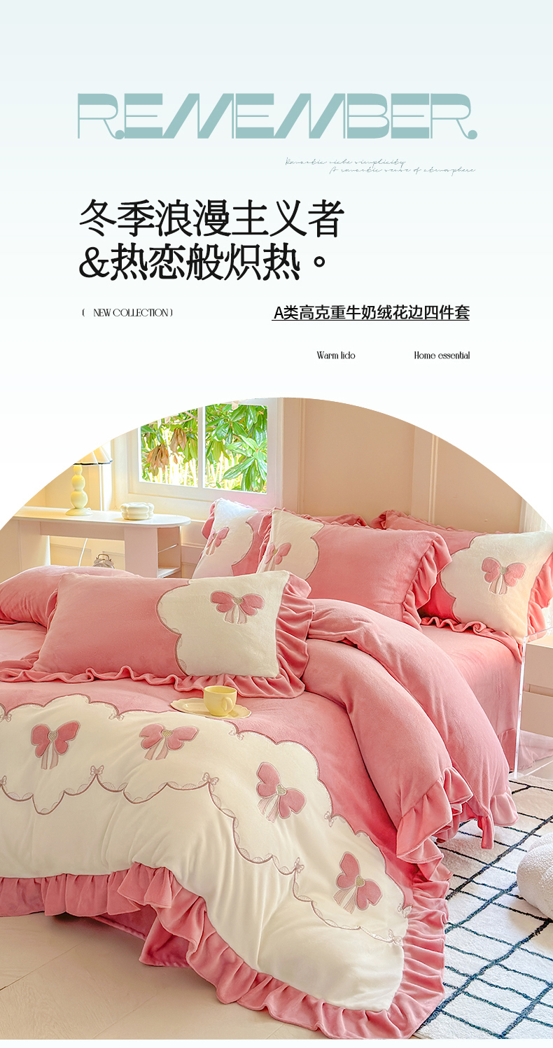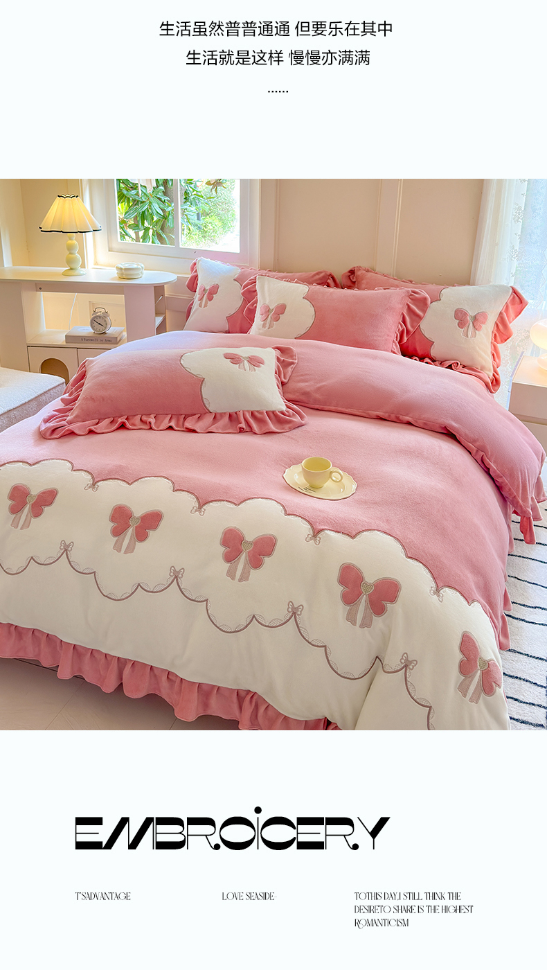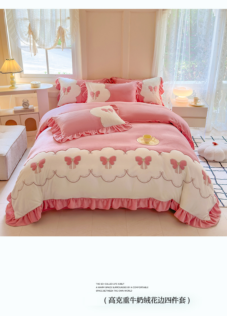 当前位置: 91家纺网 > 商品网购 > 床品套件 > 四件套 > 牛奶绒四件套 > 豪美鑫 2025新款牛奶绒刺绣韩版花边四件套-蝴蝶仙子 蝴蝶仙子-玉粉