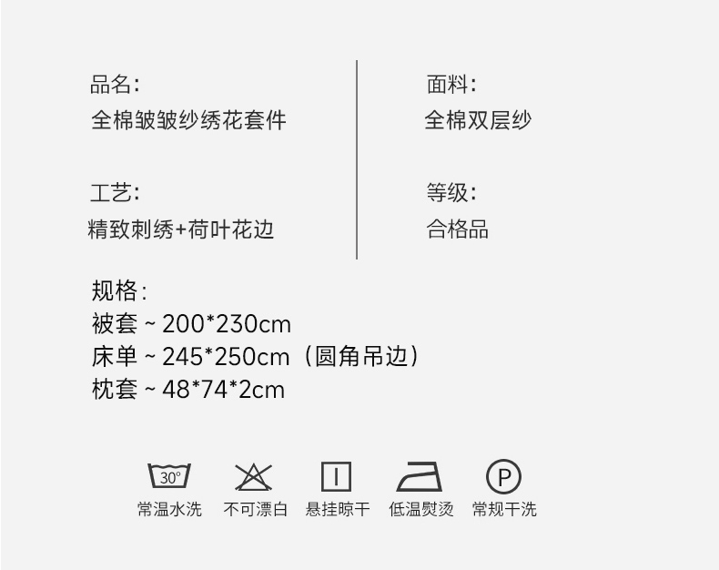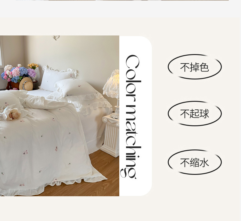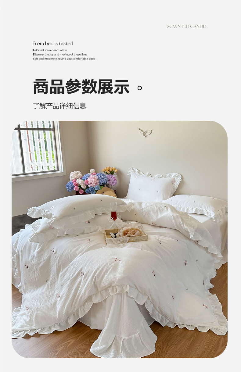 商品名称:木楌 2024全棉皱皱纱荷叶边刺绣工艺款四件套 米菲
