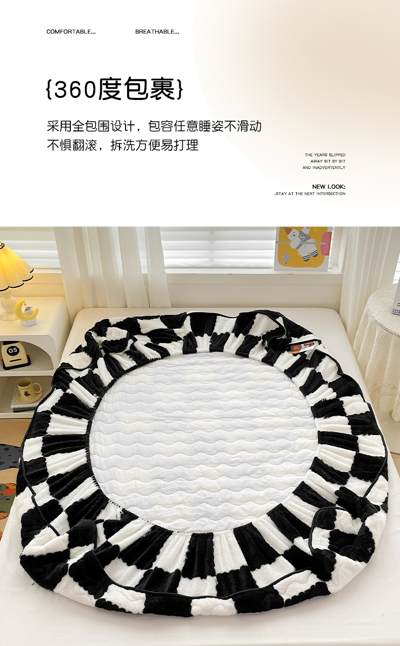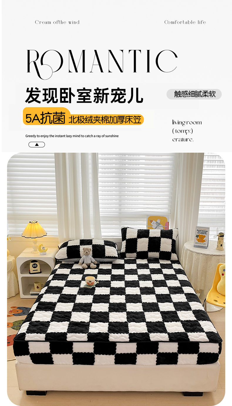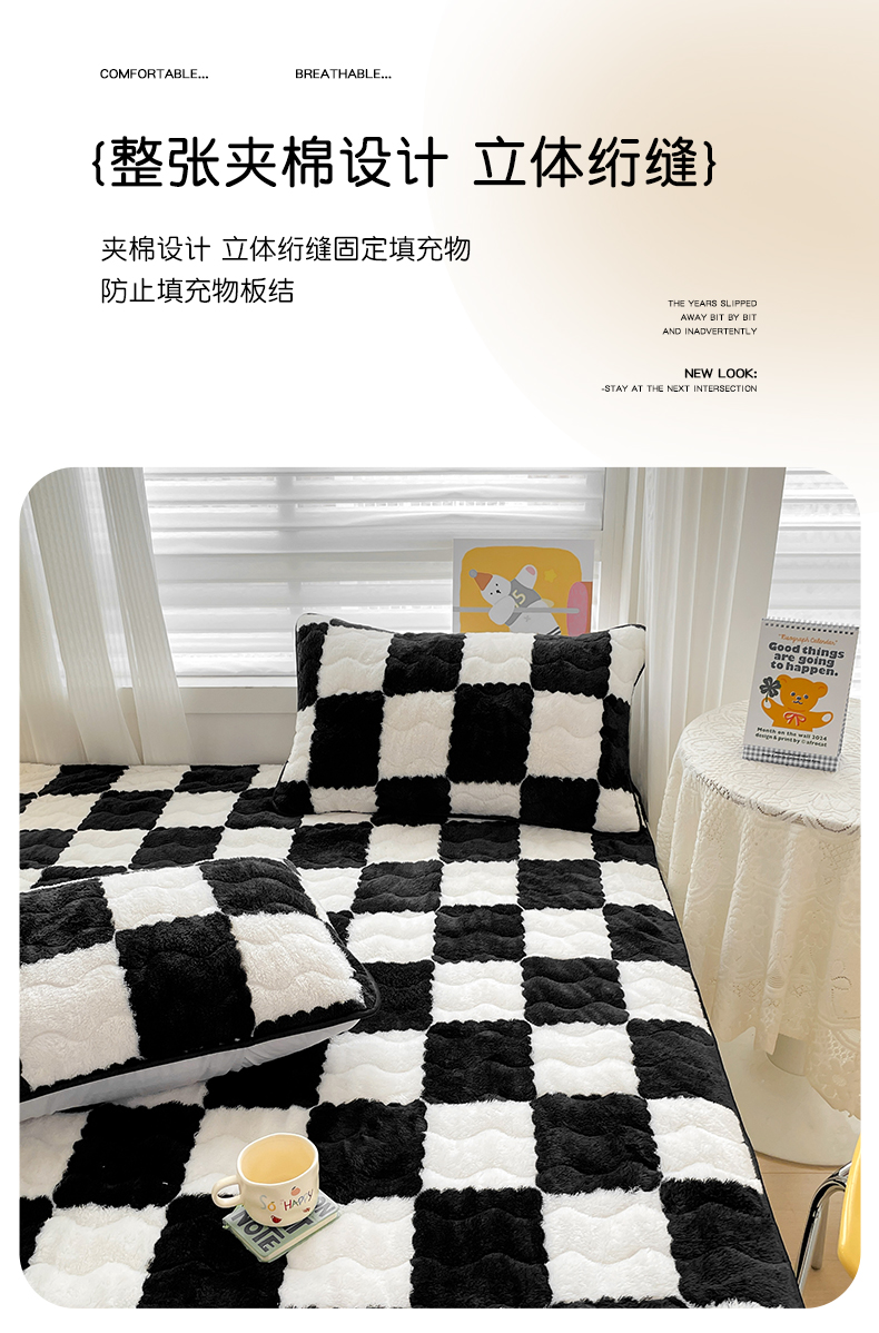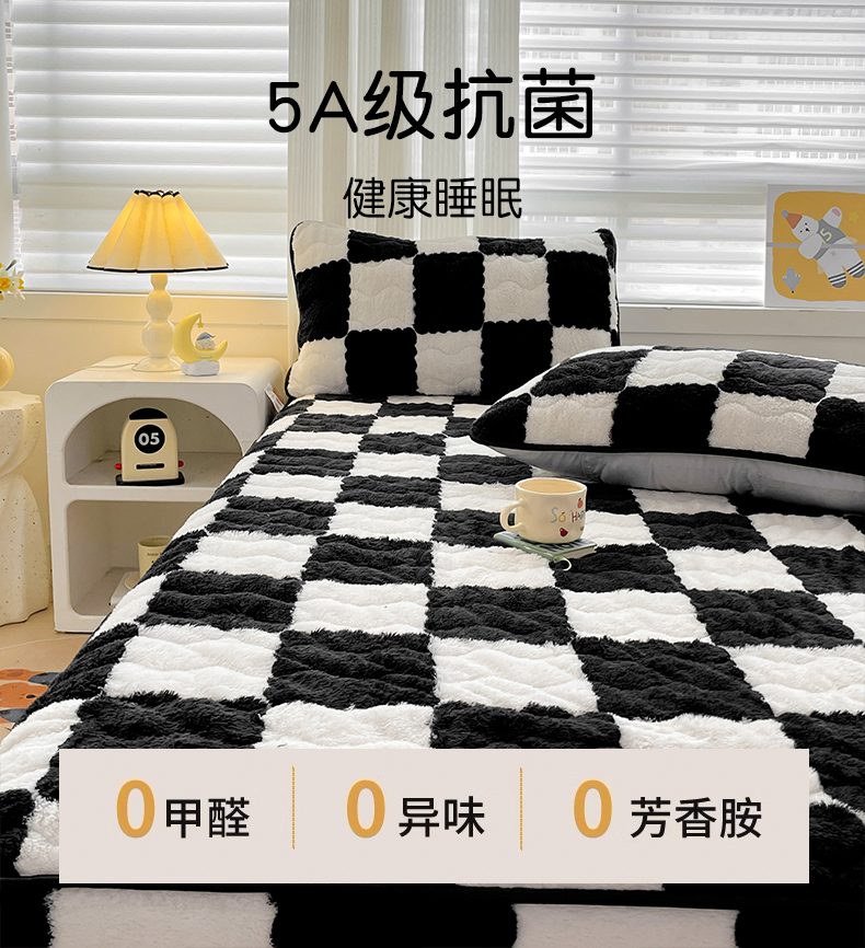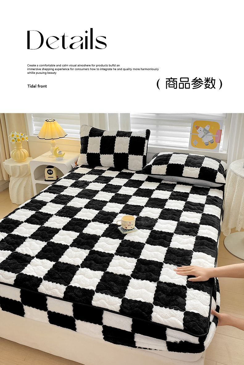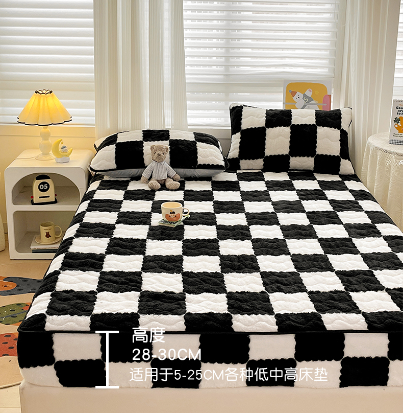 • 91家纺网 家纺一手货源 找家纺 叠派家纺 2024款秋冬北极绒加厚夹棉床笠三件套印花泰迪绒床垫保护罩-格子系列 黑