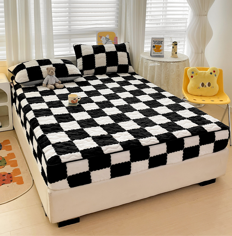 叠派家纺 2024款秋冬北极绒加厚夹棉床笠三件套印花泰迪绒床垫保护罩-格子系列 黑