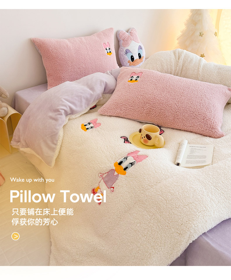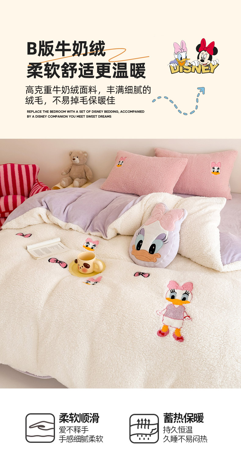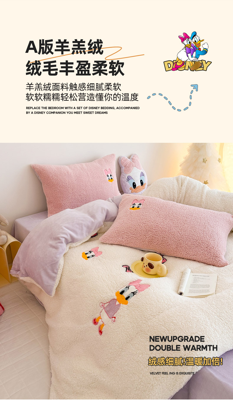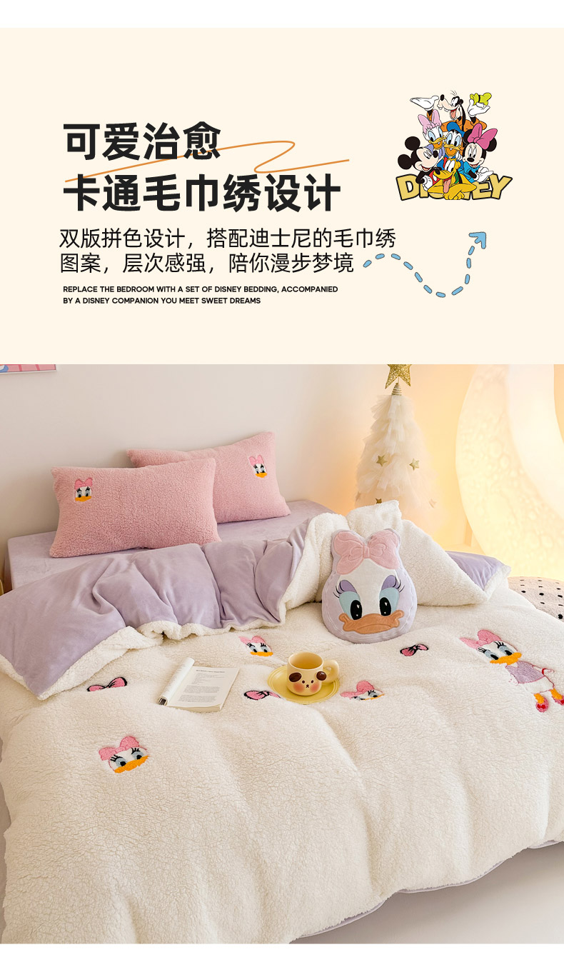 商品名称:乐坊 2024新款羊羔绒毛巾绣牛奶绒四件套冬季加厚保暖 紫色大嘴鸭
