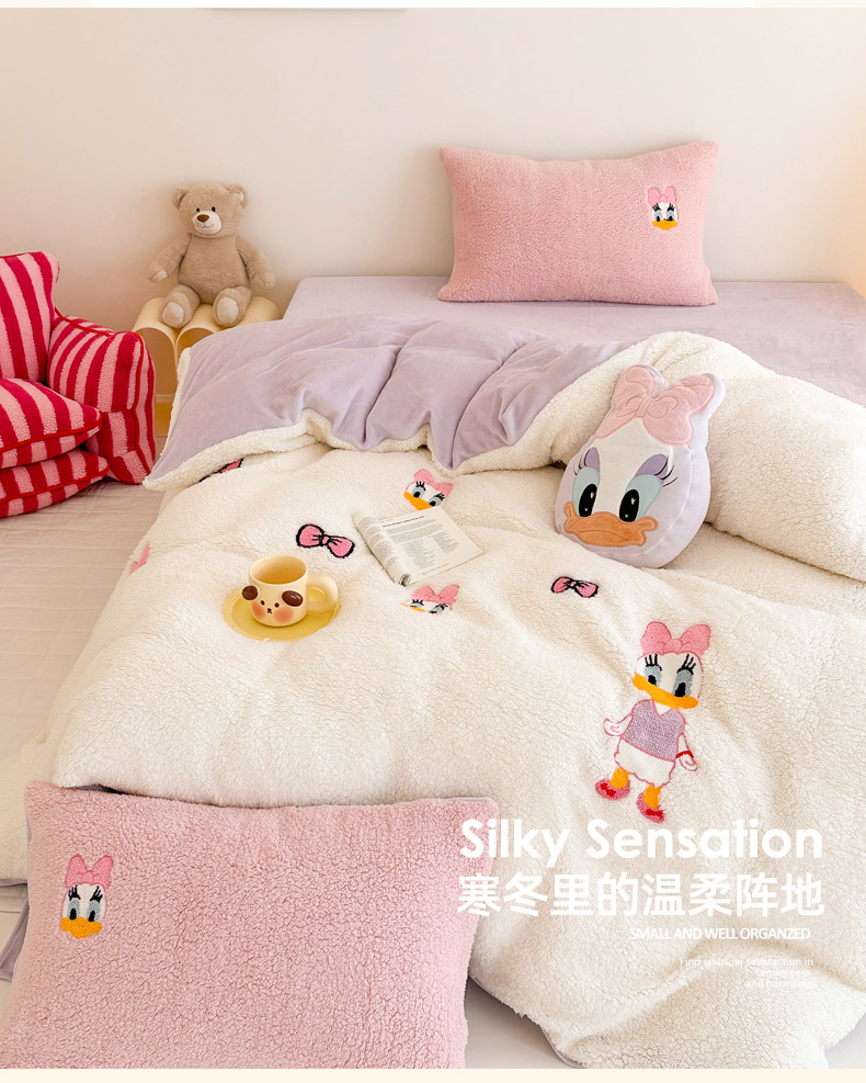 乐坊 2024新款羊羔绒毛巾绣牛奶绒四件套冬季加厚保暖 紫色大嘴鸭