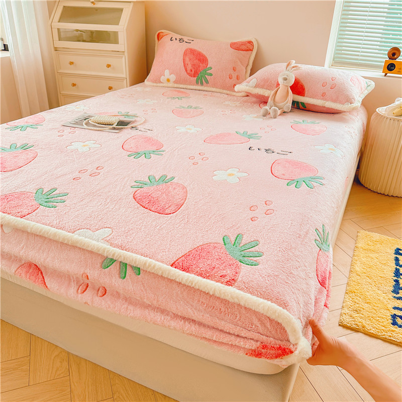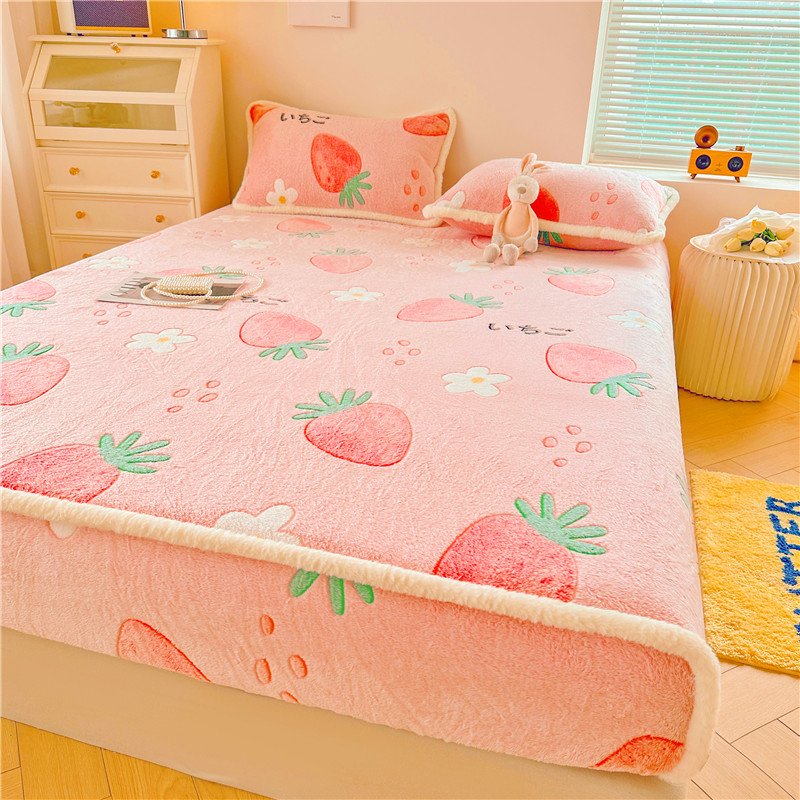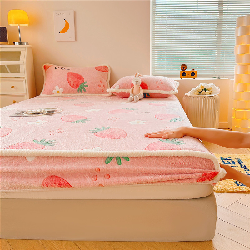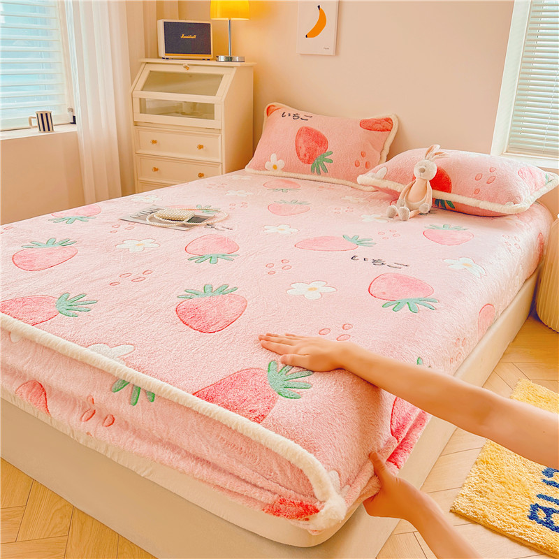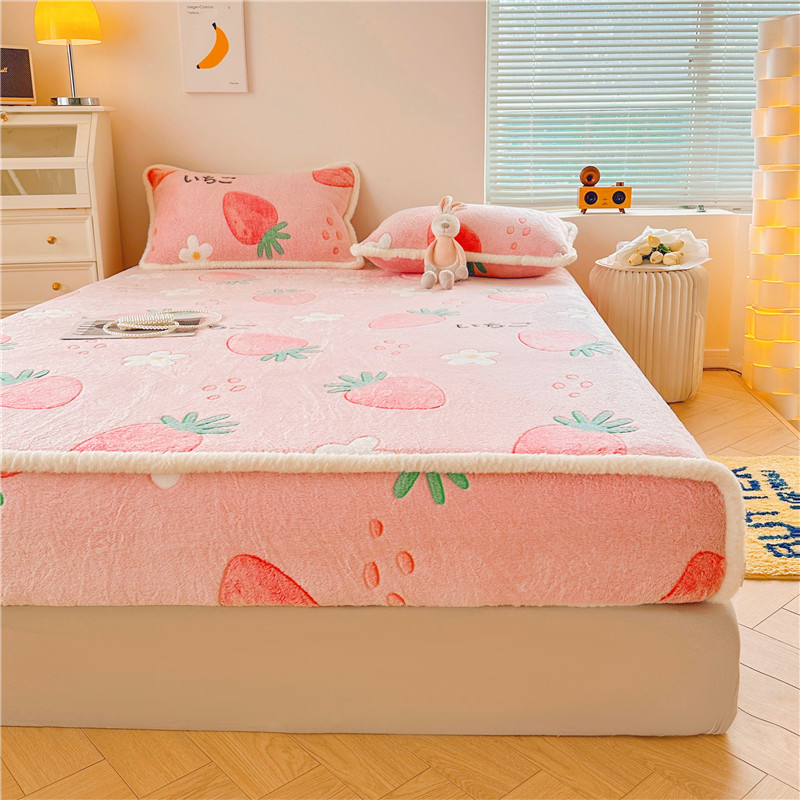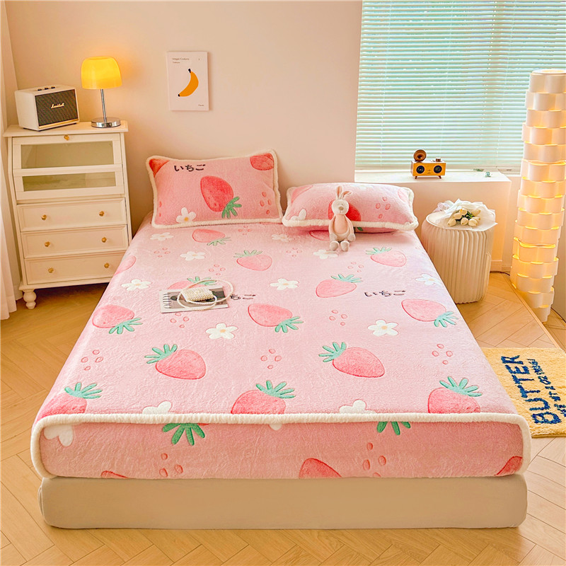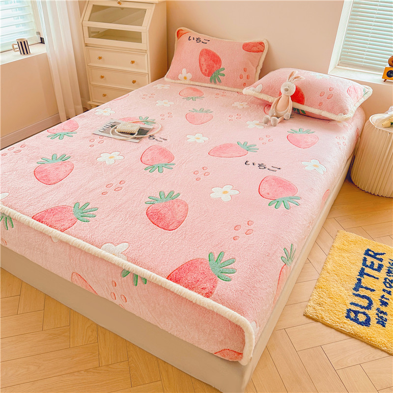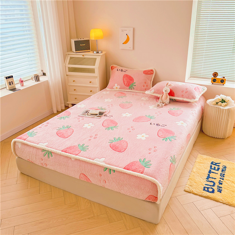 喜居 2024新款雪花绒床笠印花牛奶绒床笠三件套单床笠 草莓布丁