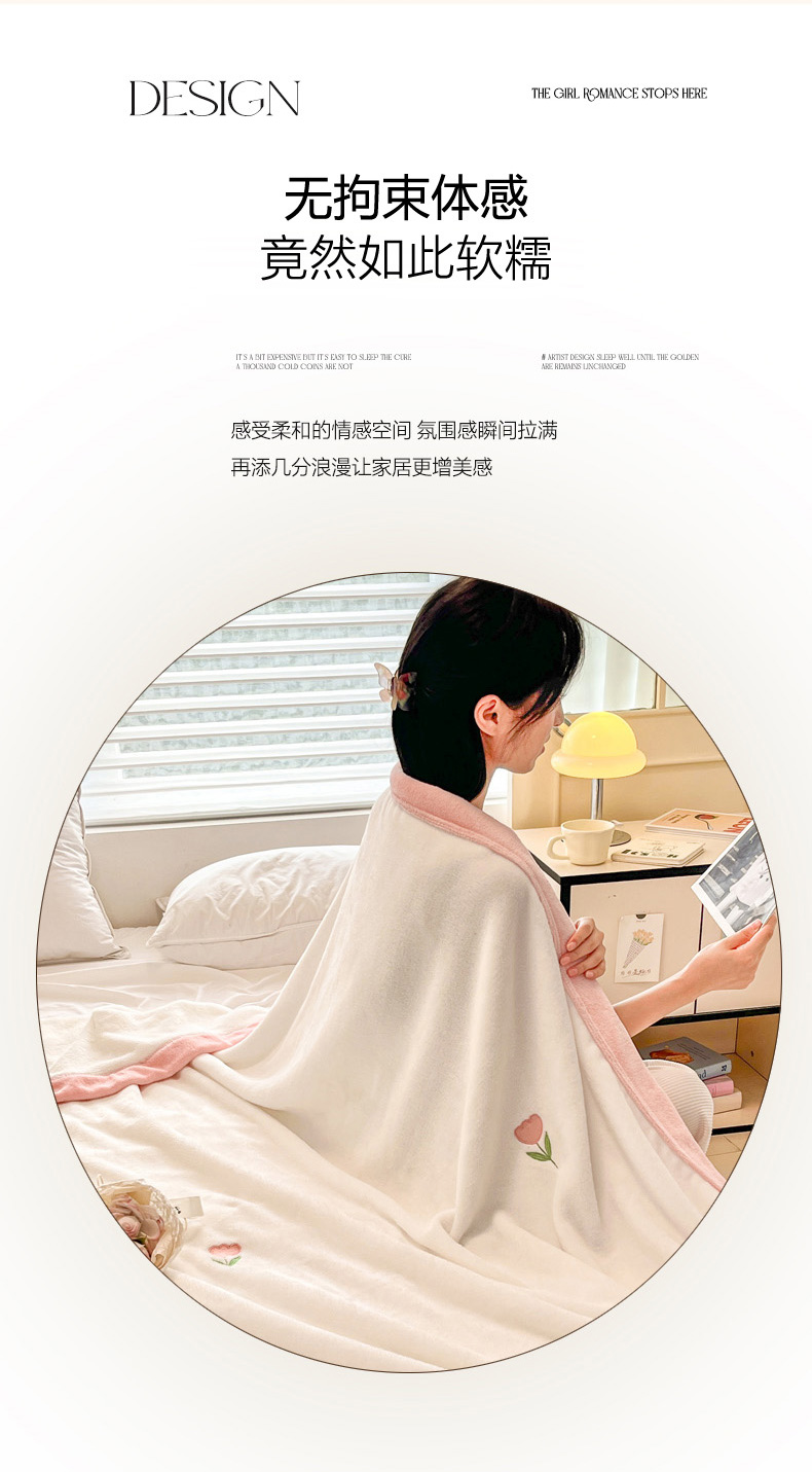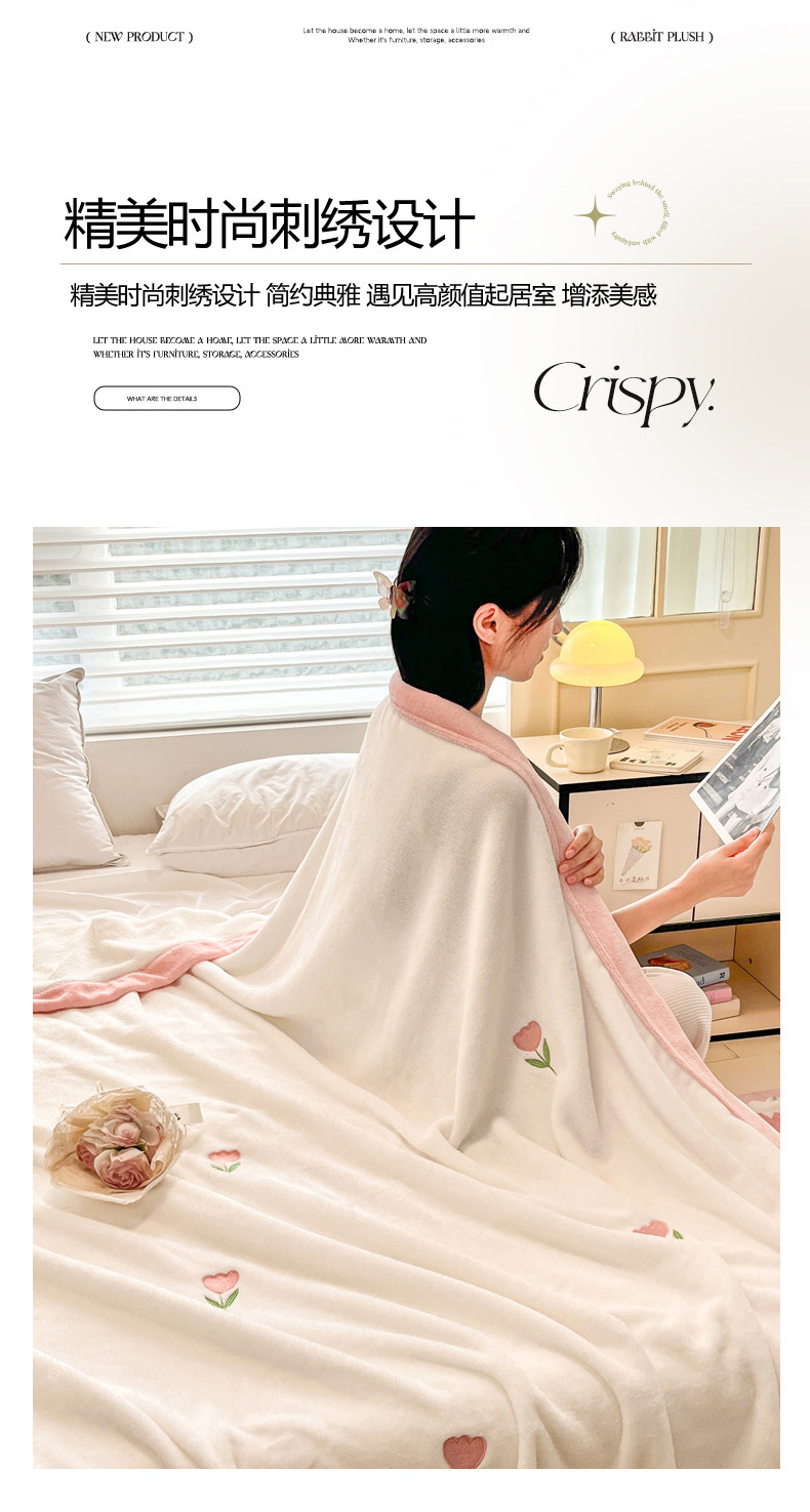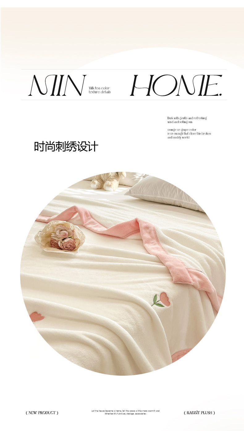 慕尚 2025新款简约双面牛奶绒刺绣多功能盖毯-郁金香 郁金香-白粉