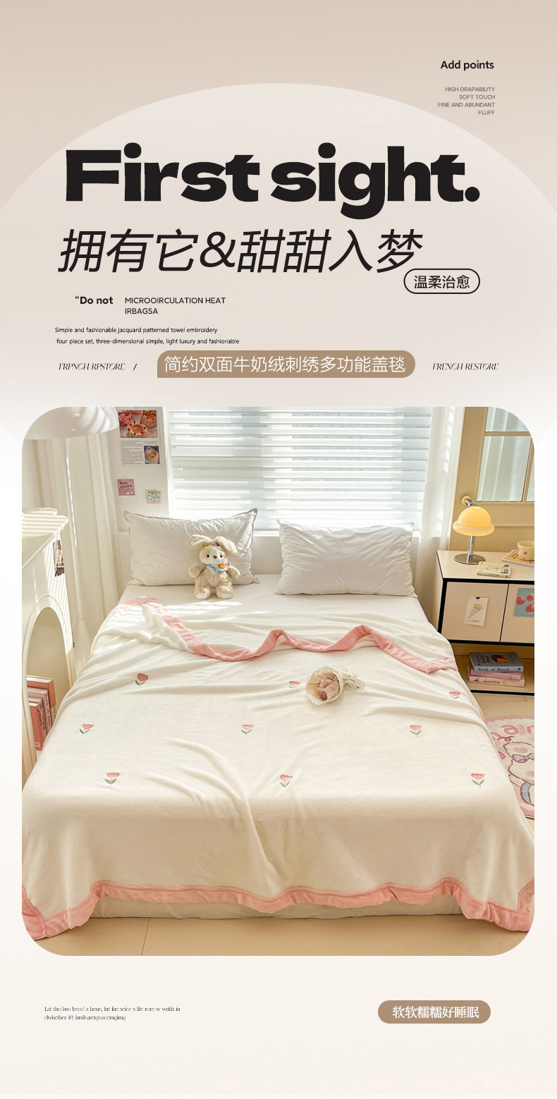 商品名称:慕尚 2025新款简约双面牛奶绒刺绣多功能盖毯-郁金香 郁金香-白粉