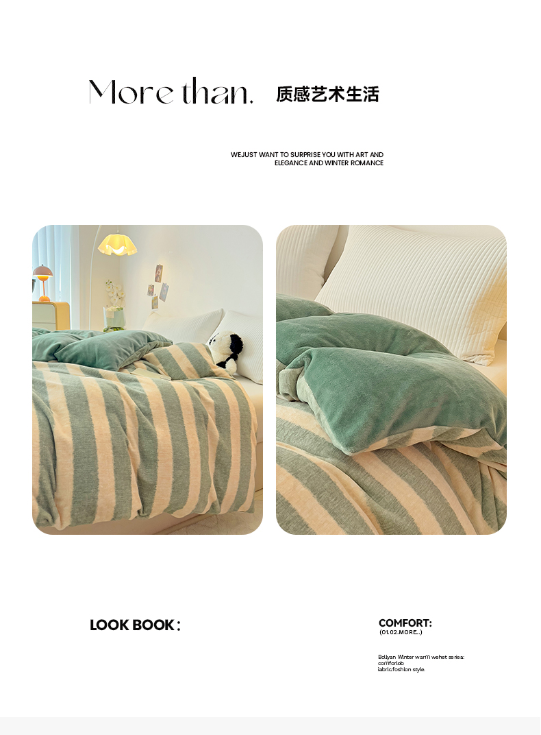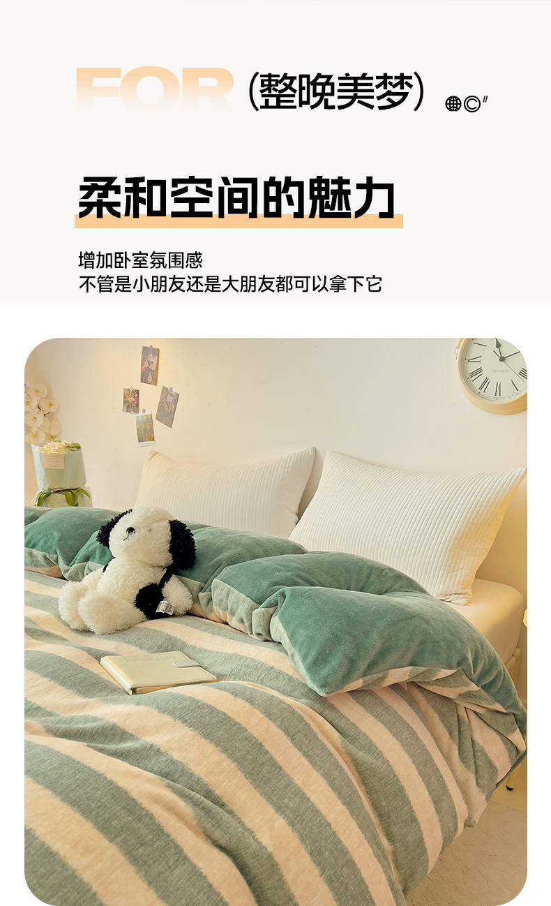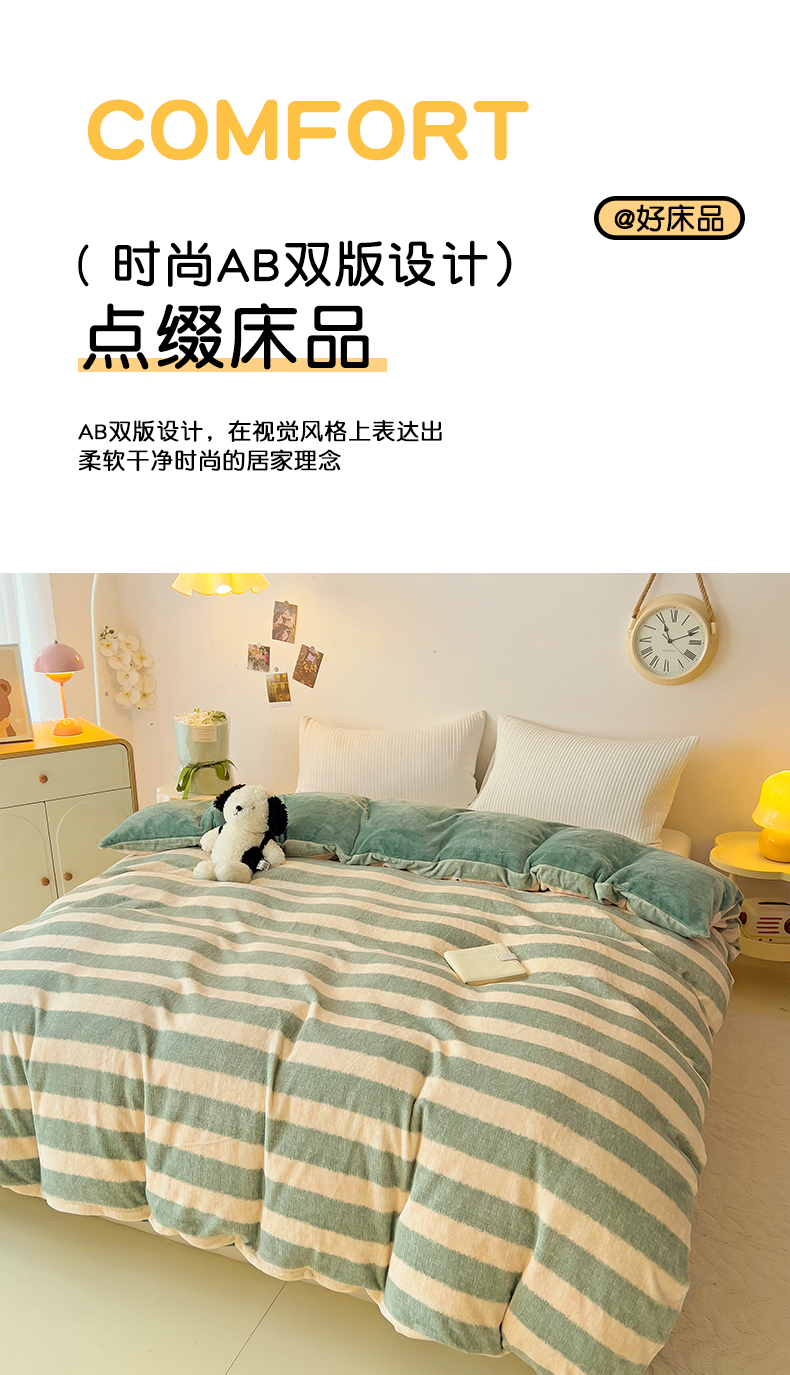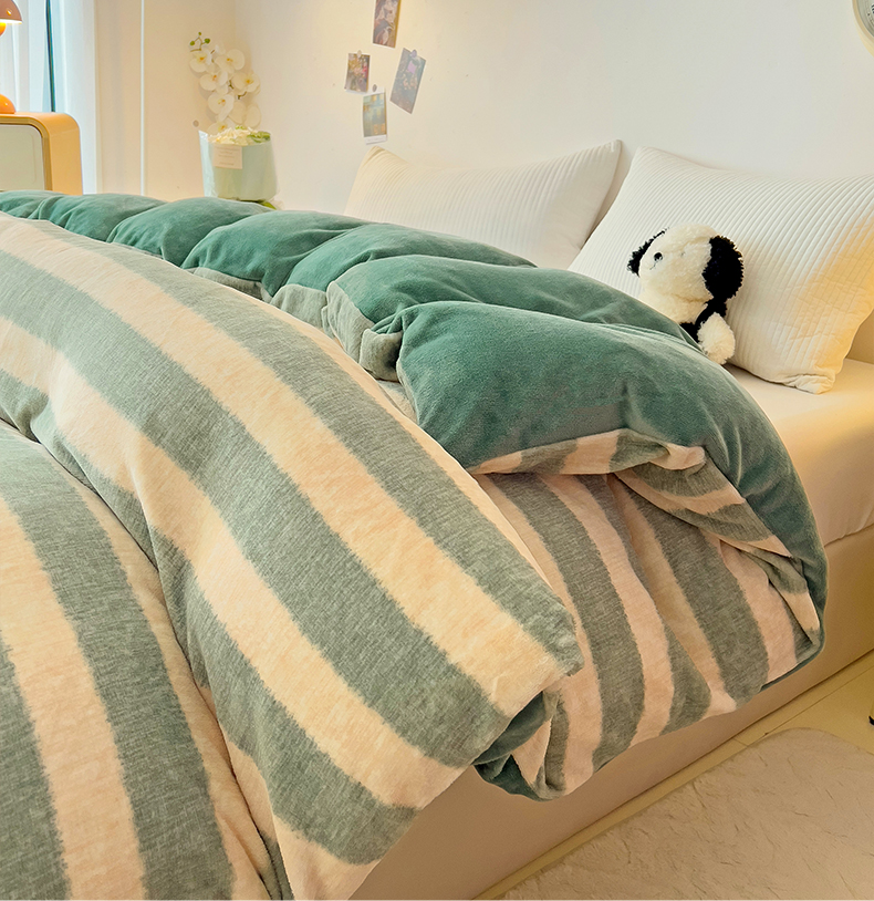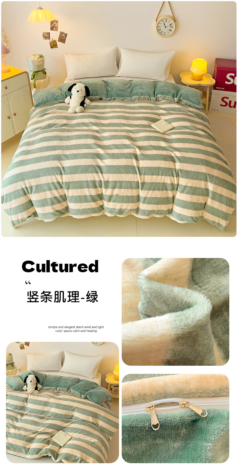 • 91家纺网 家纺一手货源 找家纺 大柏树 2025新款A类高克重亲肤舒适牛奶绒印花四件套-单被套可定制 竖条肌理-绿