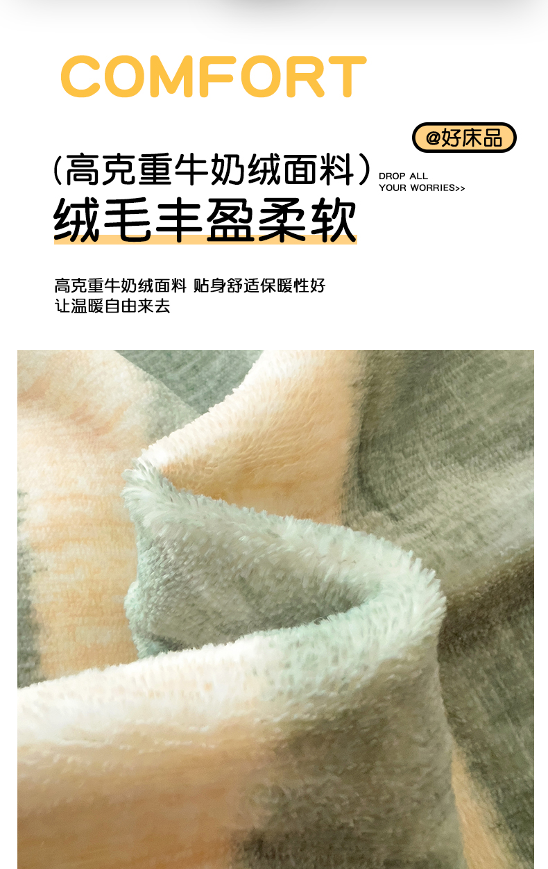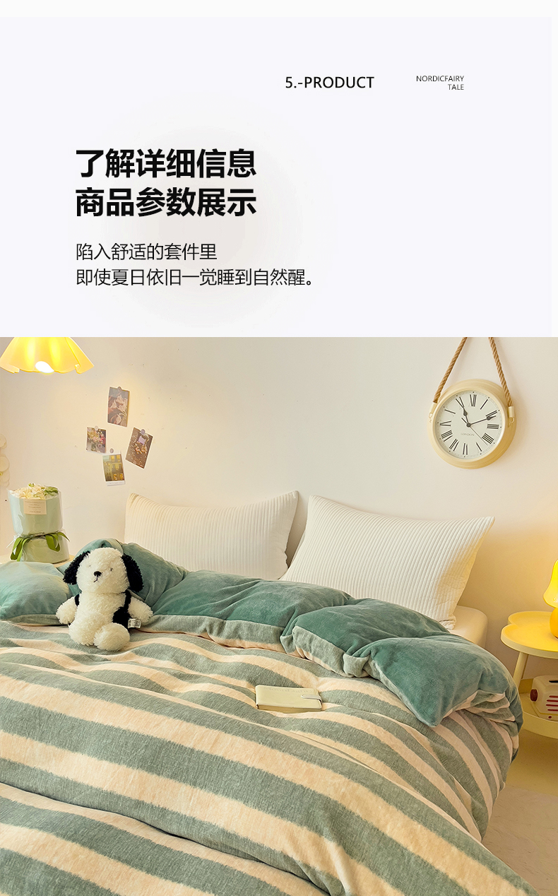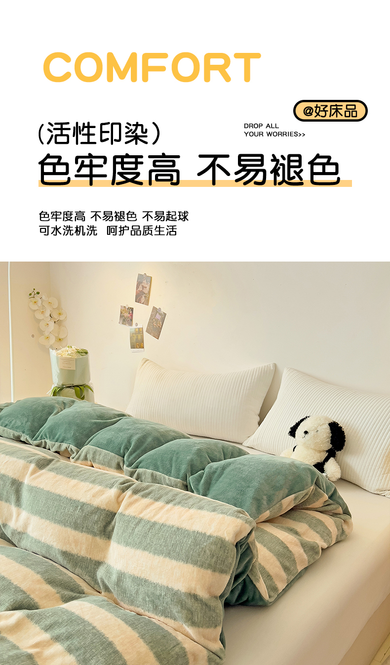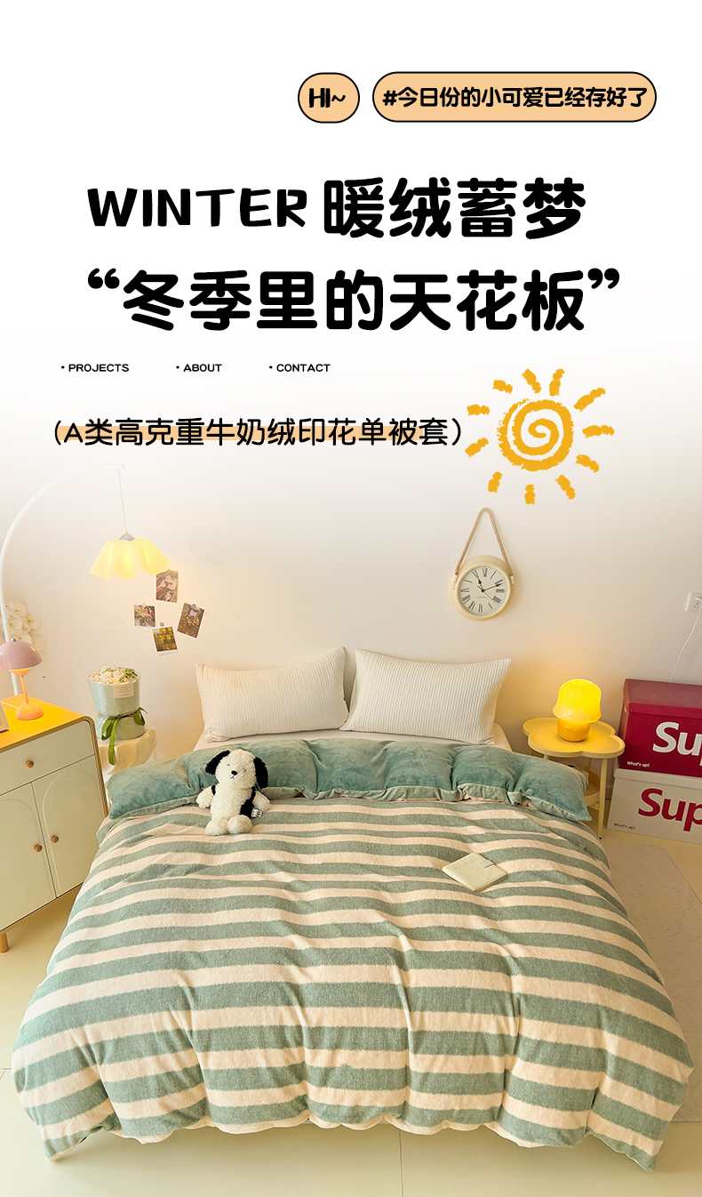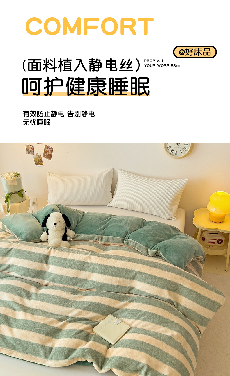 • 91家纺网 家纺一手货源 找家纺 大柏树 2025新款A类高克重亲肤舒适牛奶绒印花四件套-单被套可定制 竖条肌理-绿