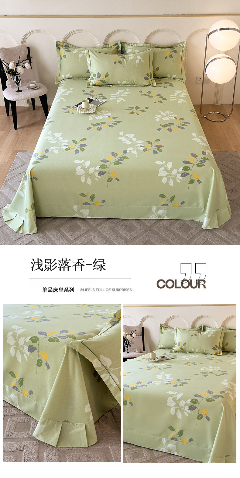 铭成 2024新款全棉生态喷气加厚磨毛单品床单浅影落香-绿