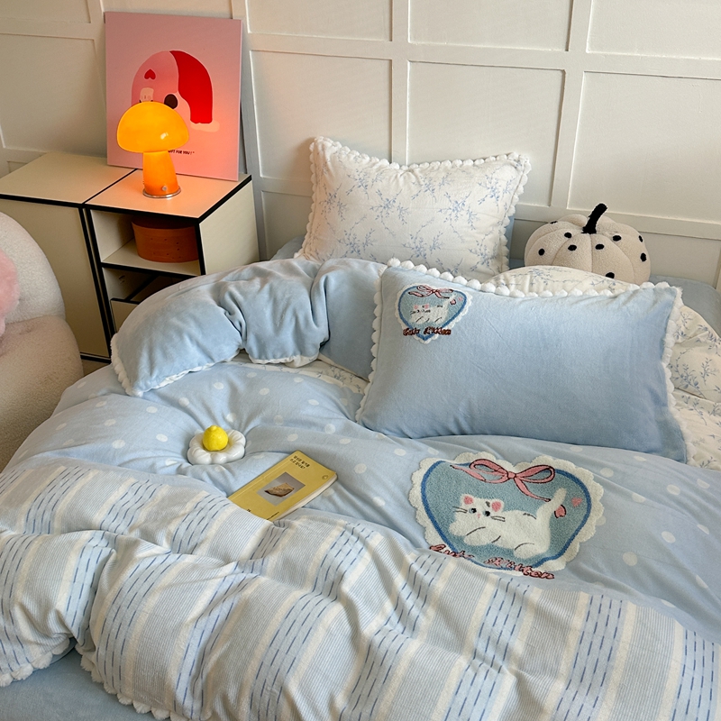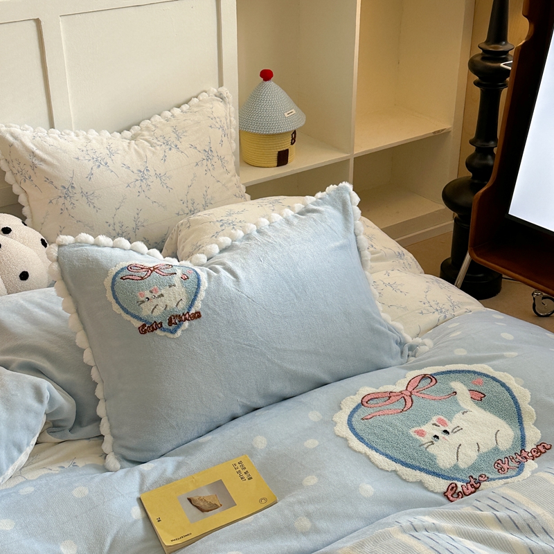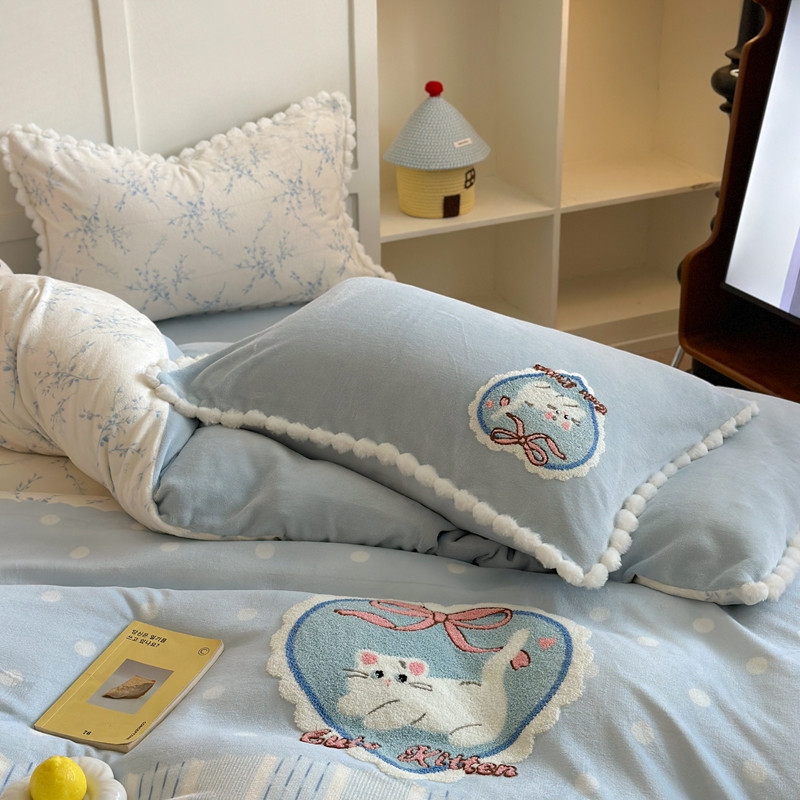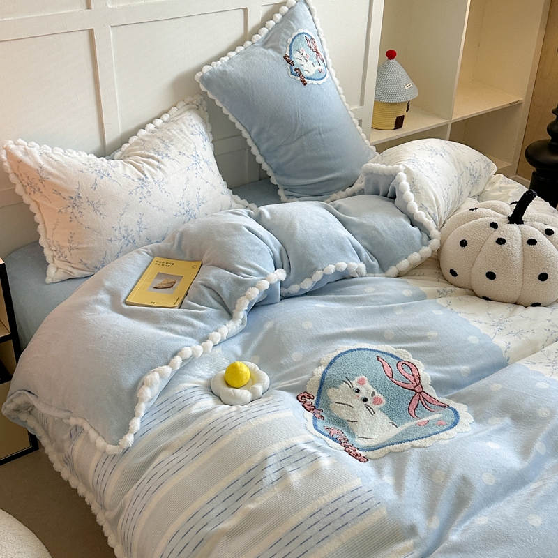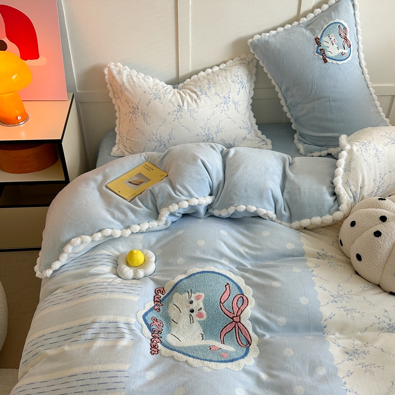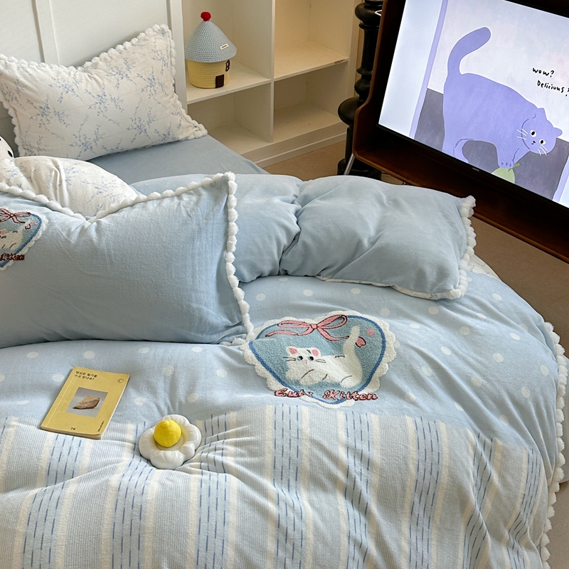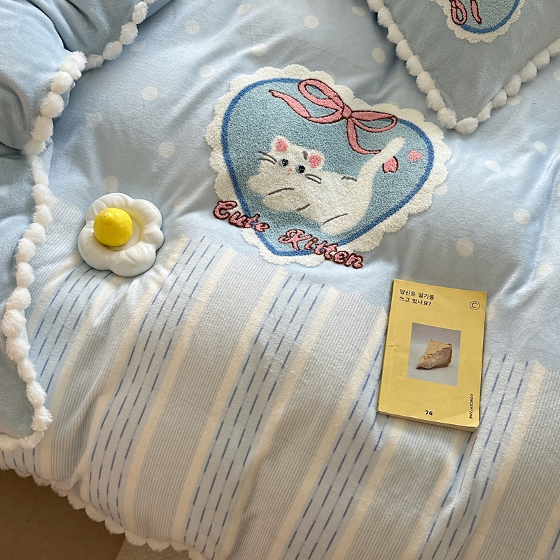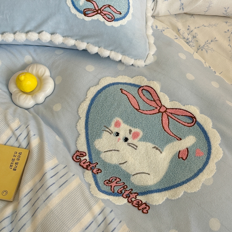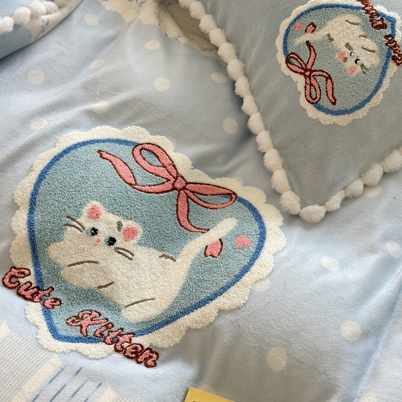 柚子YOUTH 2024新款毛球花边三拼牛奶绒四件套 猫之恋