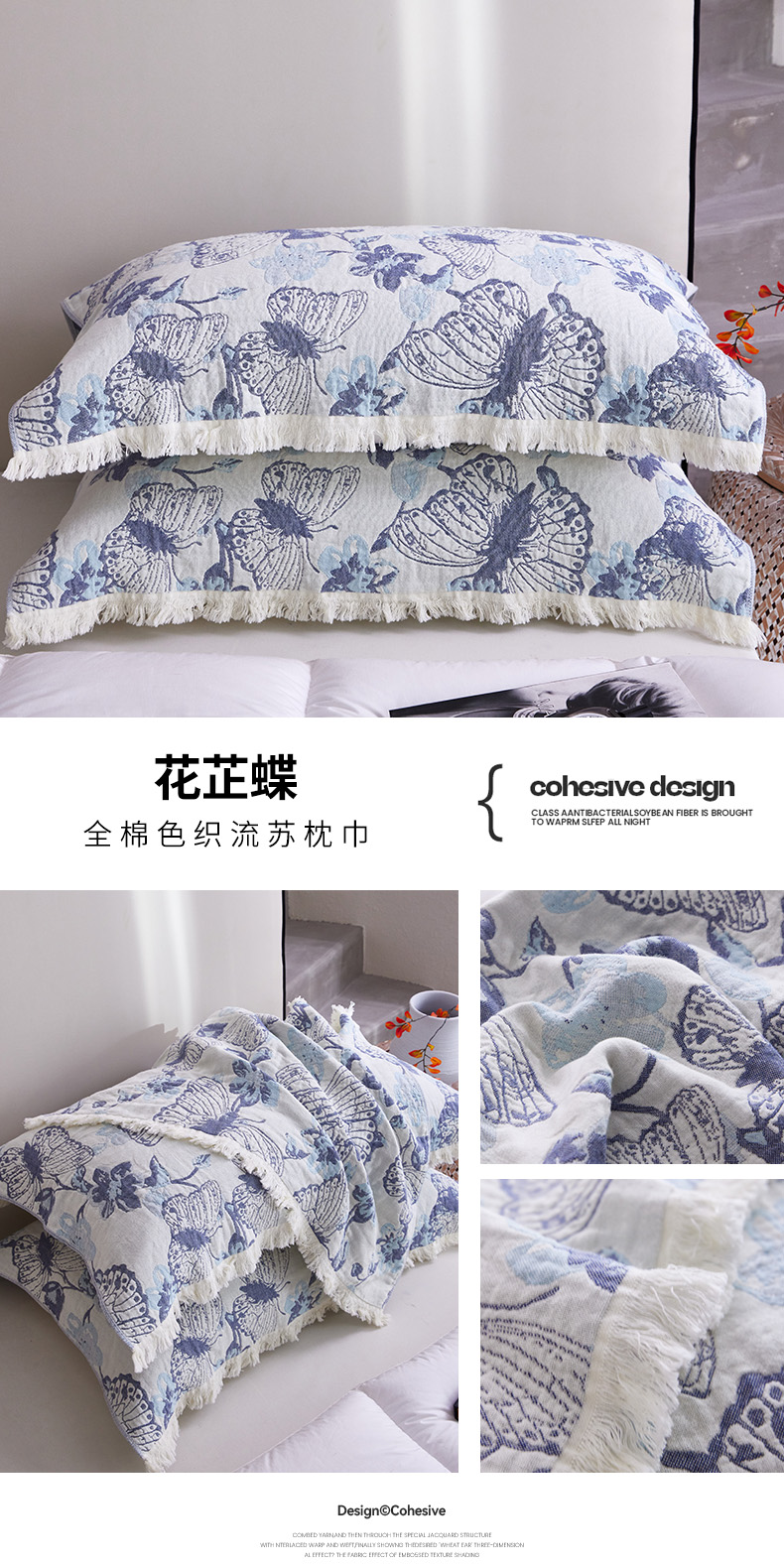 爱港家纺 2024新款流苏枕巾 高档纯棉枕巾 全棉防头油 保护枕芯 垫巾 花芷蝶
