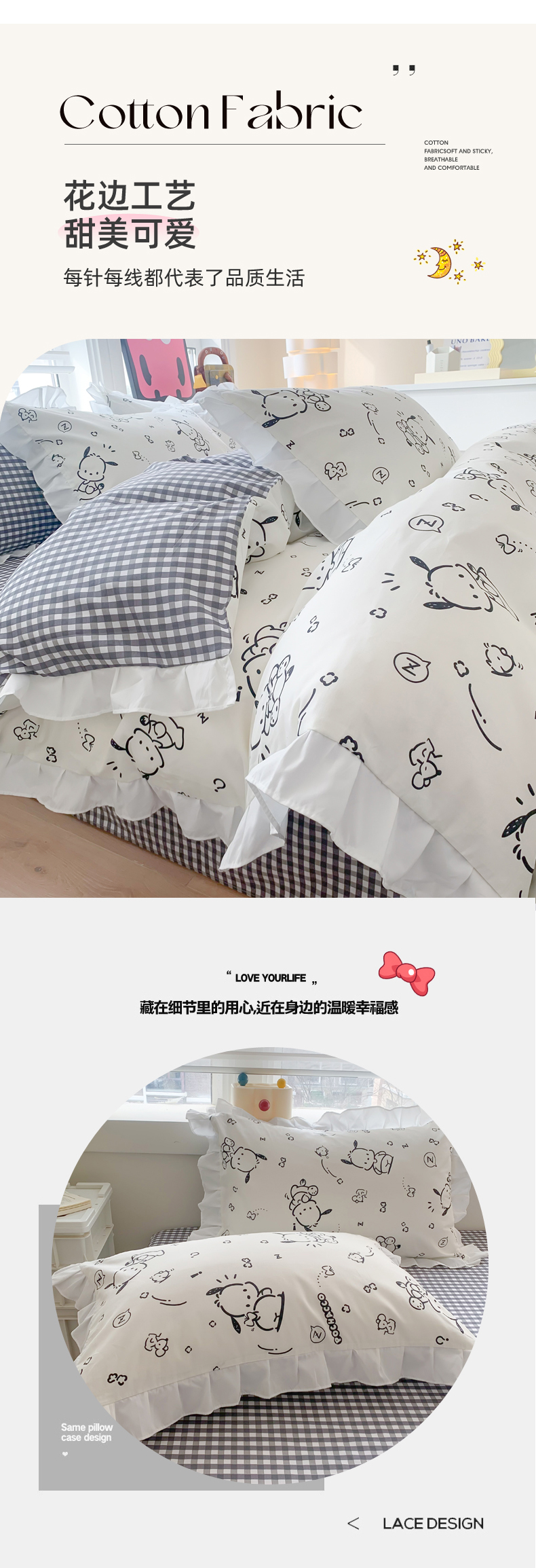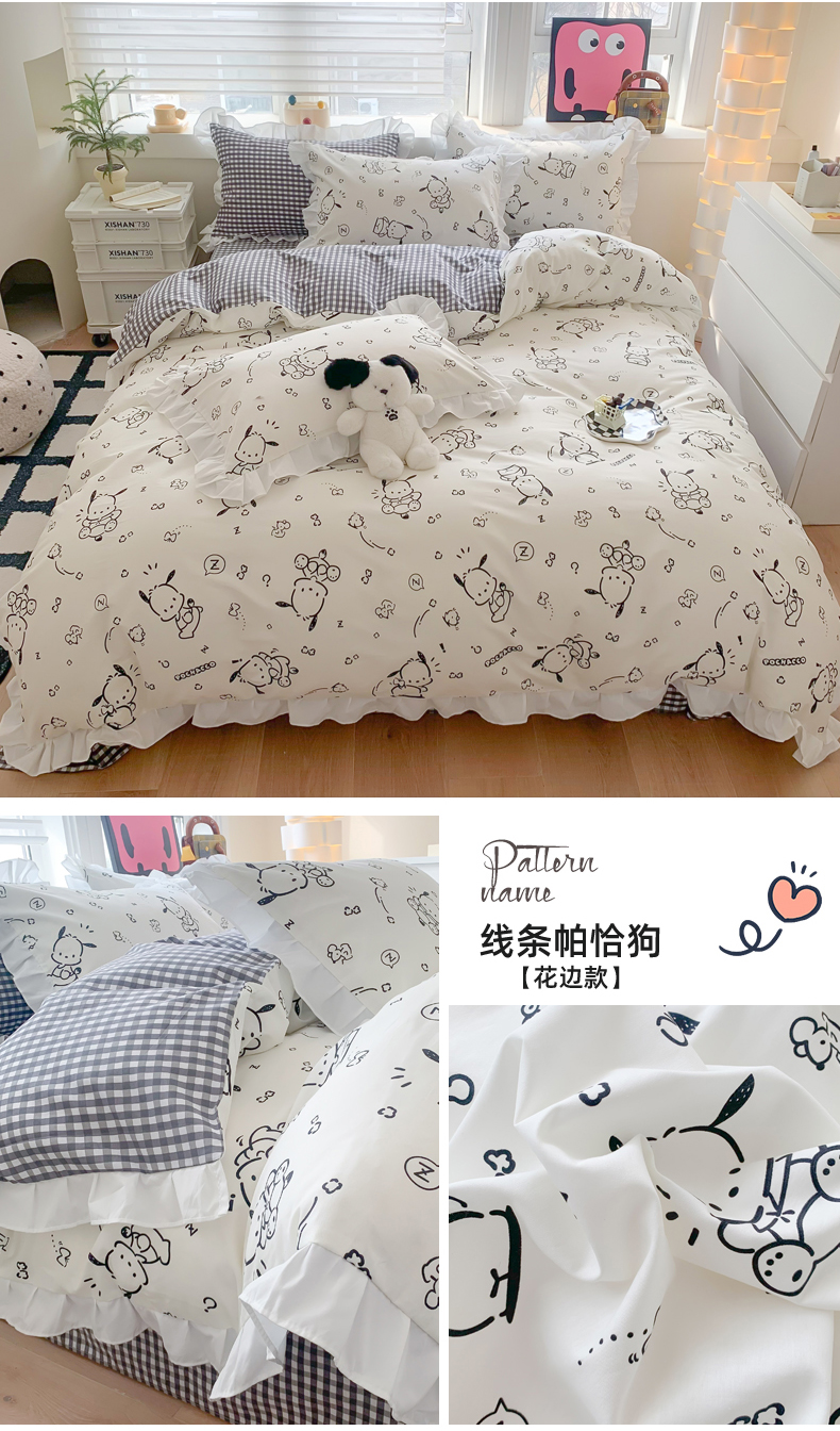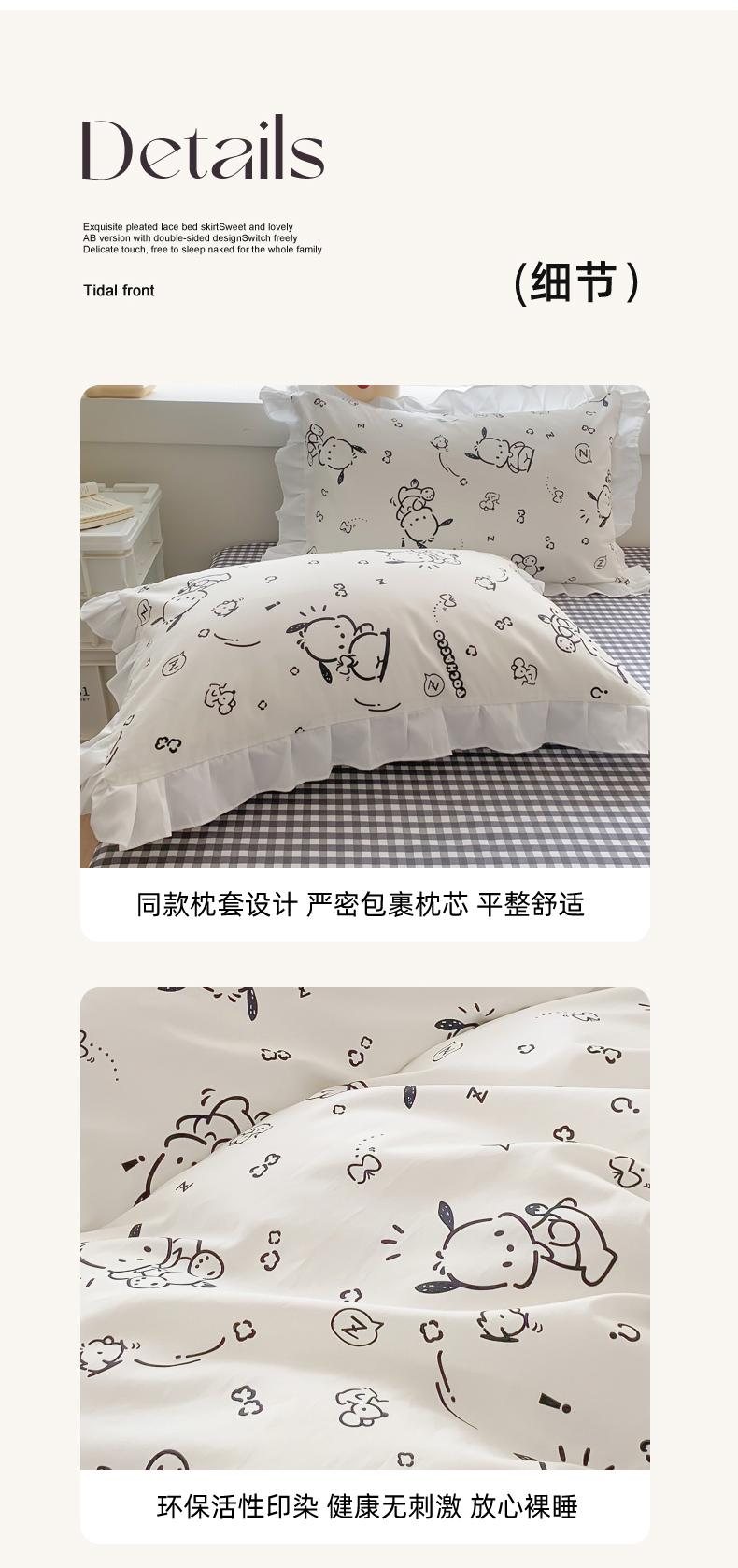 当前位置: 91家纺网 > 商品网购 > 床品套件 > 四件套 > 全棉普通四件套 > 玉元坊 2025新款三丽鸥系列白花边被套纯棉全棉床裙三件套四件套-帕恰狗白花边款式 花边款-线条帕恰狗