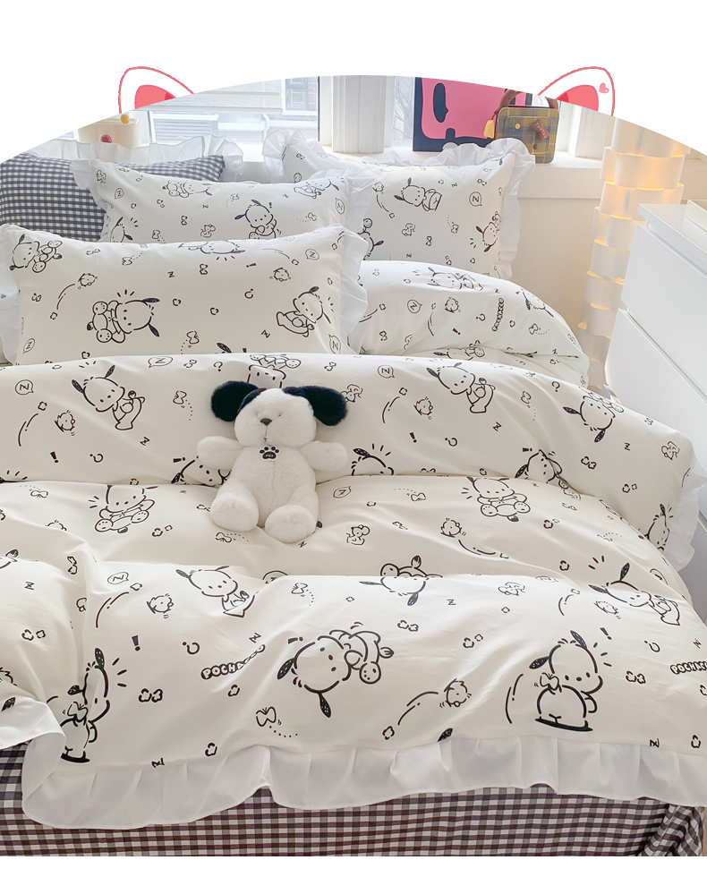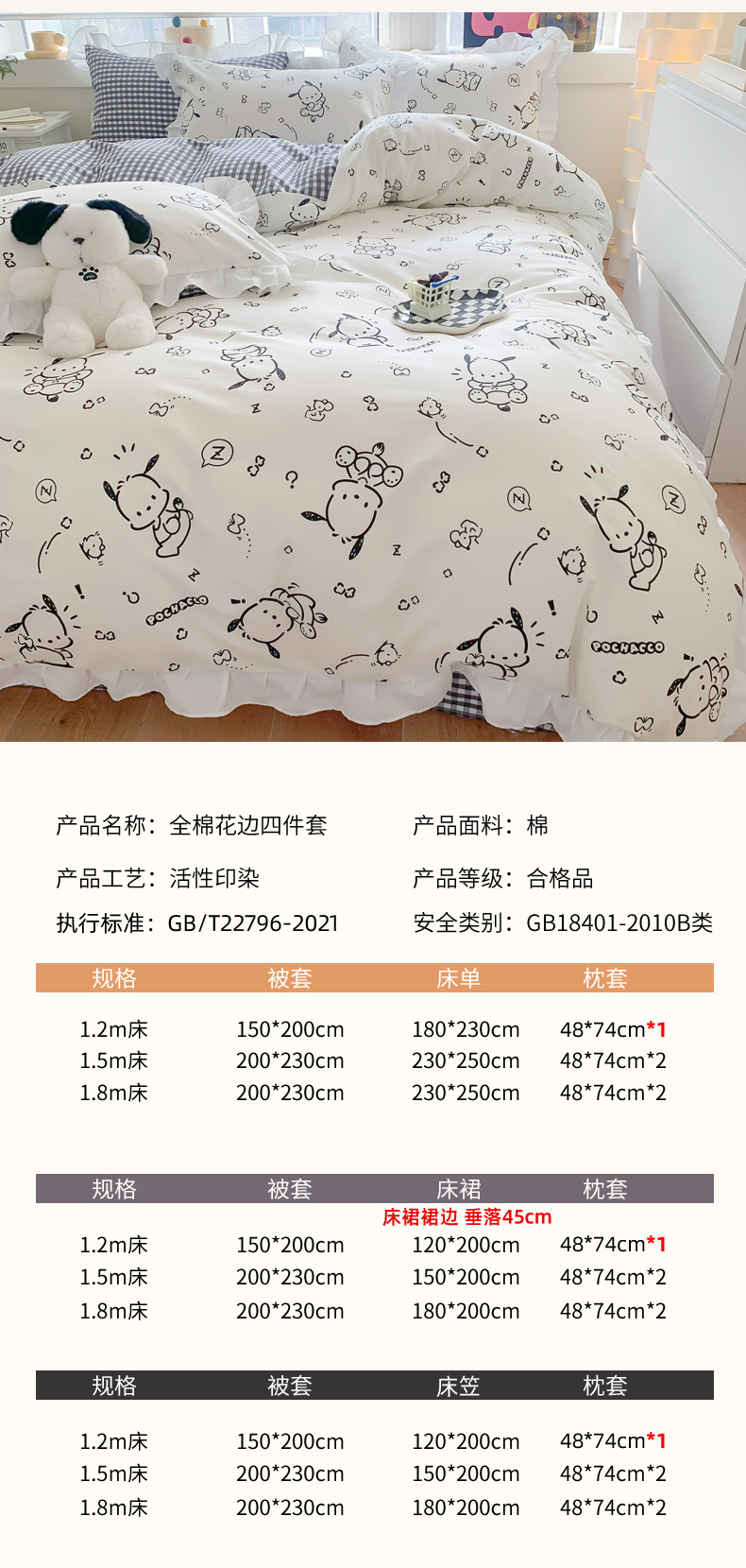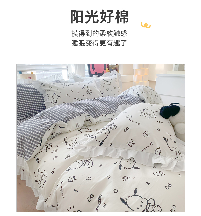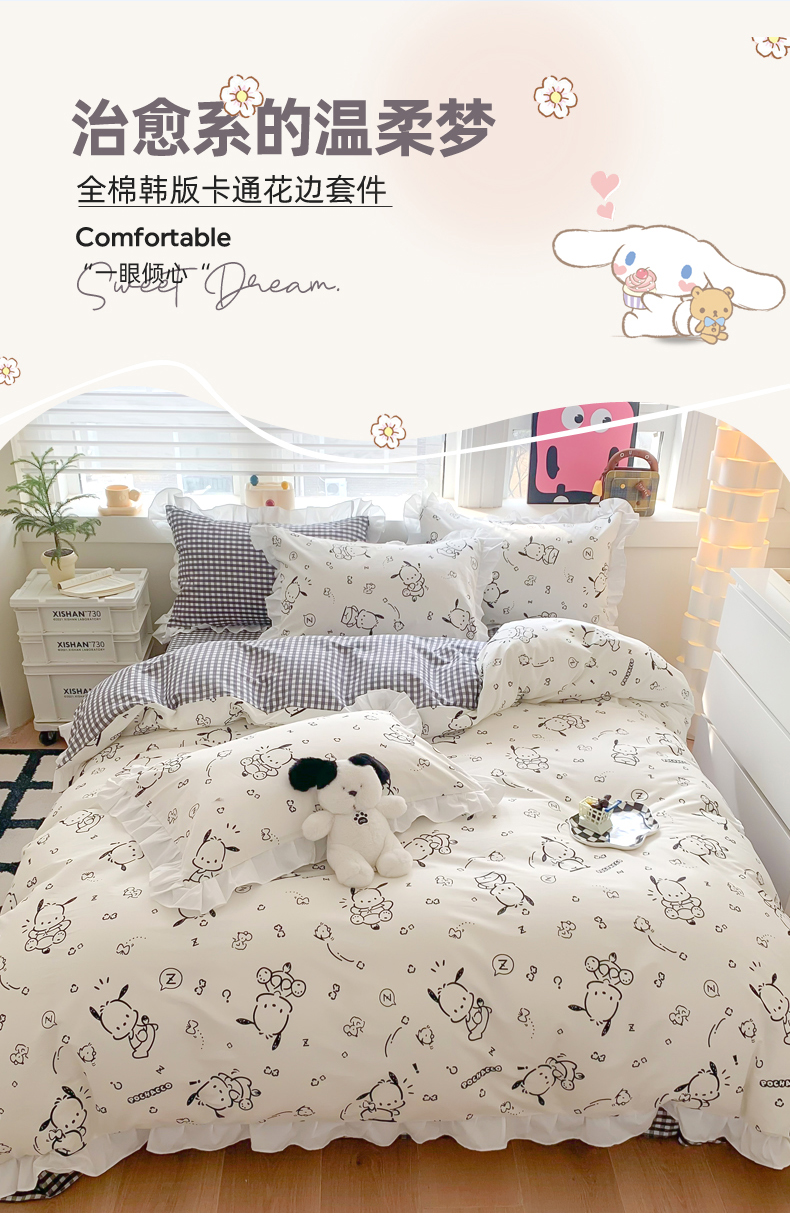 当前位置: 91家纺网 > 商品网购 > 床品套件 > 四件套 > 全棉普通四件套 > 玉元坊 2025新款三丽鸥系列白花边被套纯棉全棉床裙三件套四件套-帕恰狗白花边款式 花边款-线条帕恰狗