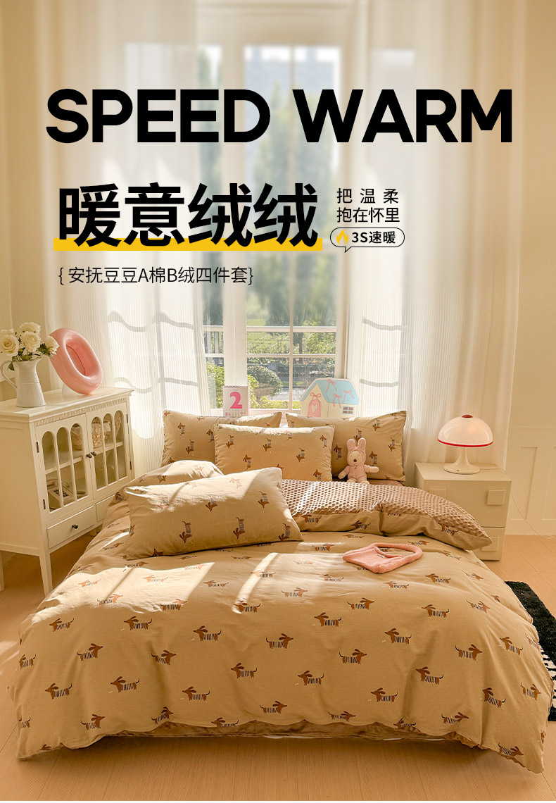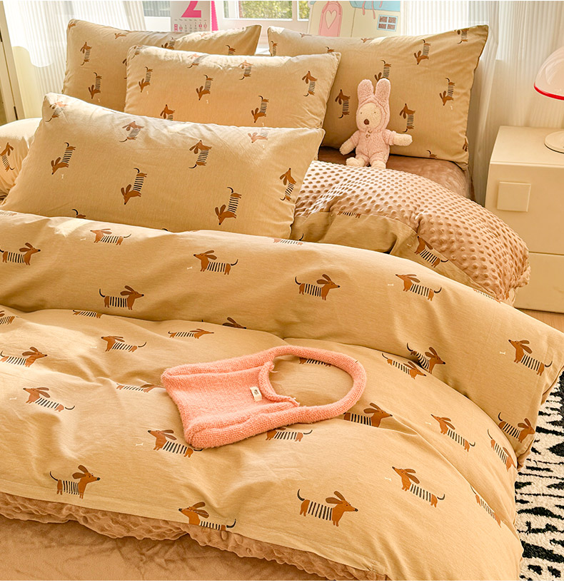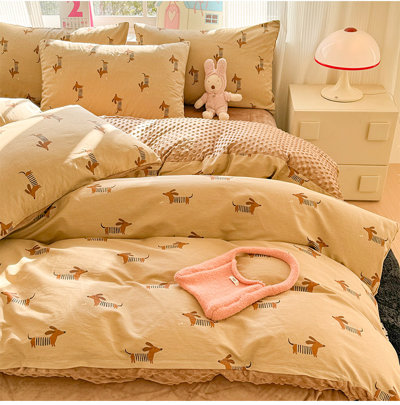 千朵 2025新款全棉加豆豆绒四件套 蜡肠狗