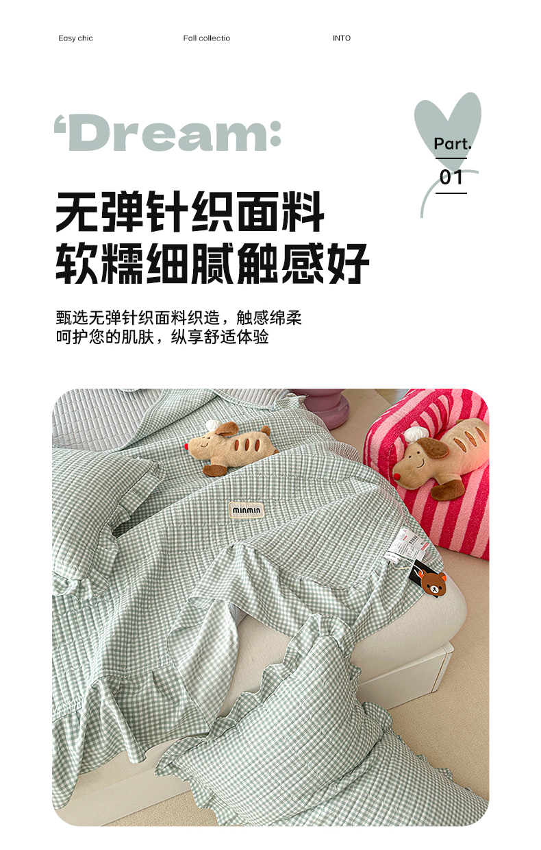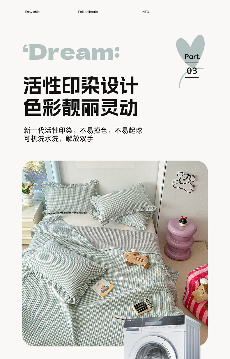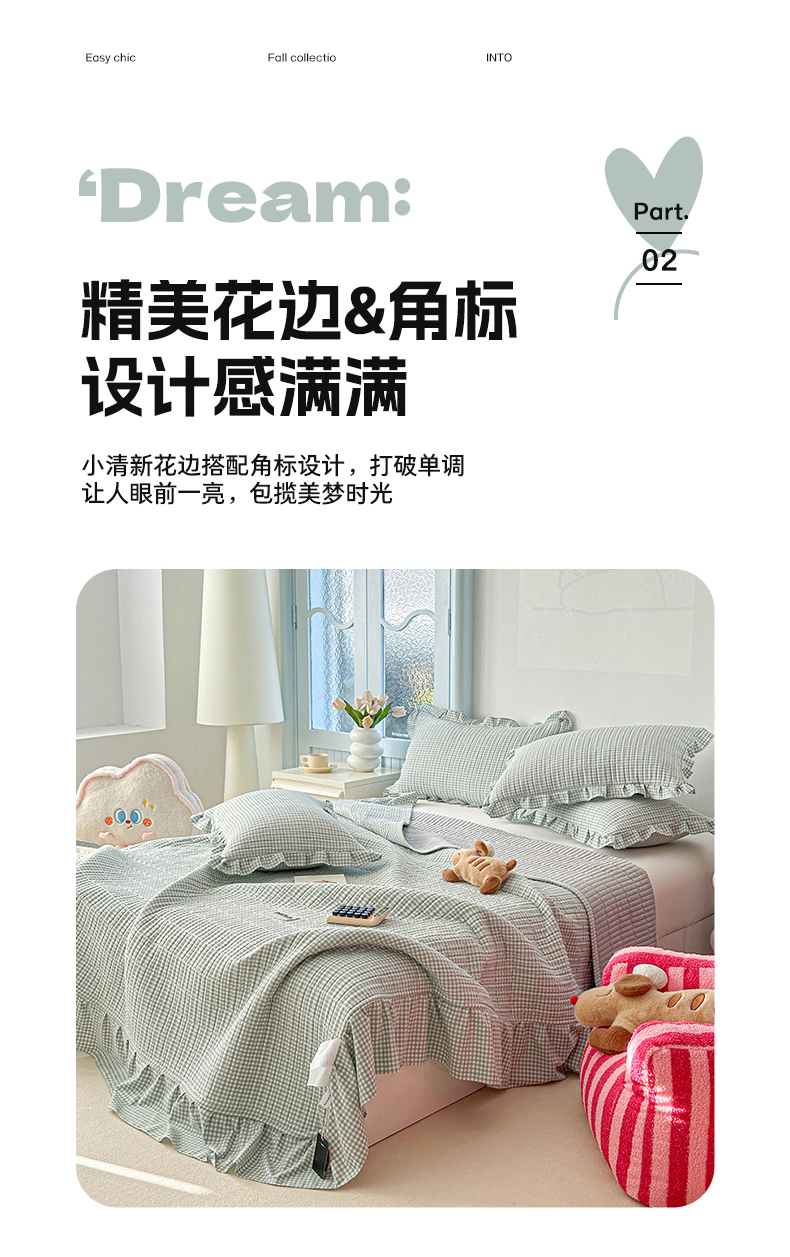 (总)源舜家纺 2025新款色织棉简约韩系花边床盖三件套,简约灰,简约粉,简约绿,简约驼,简约蓝