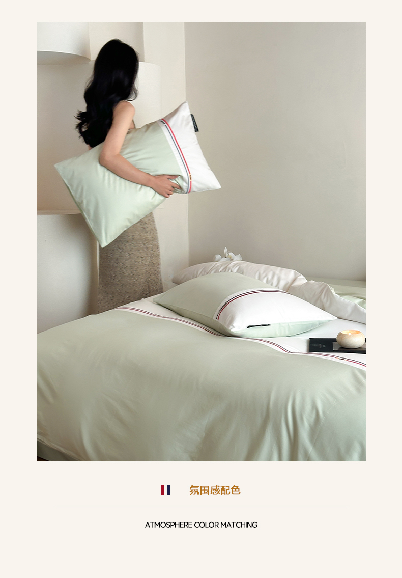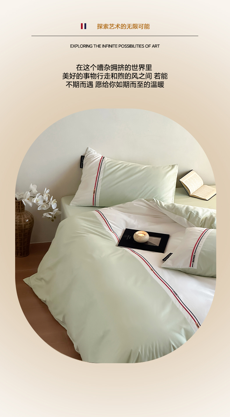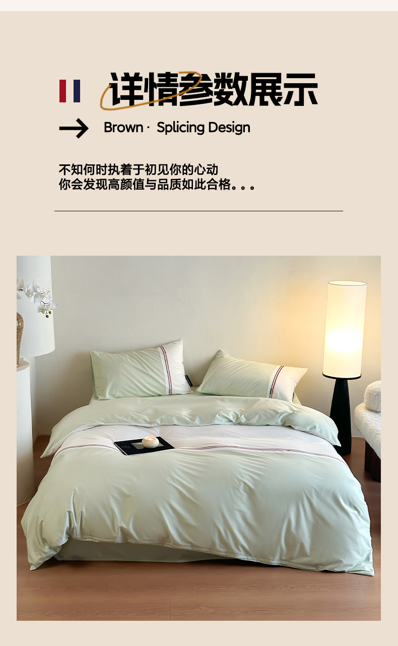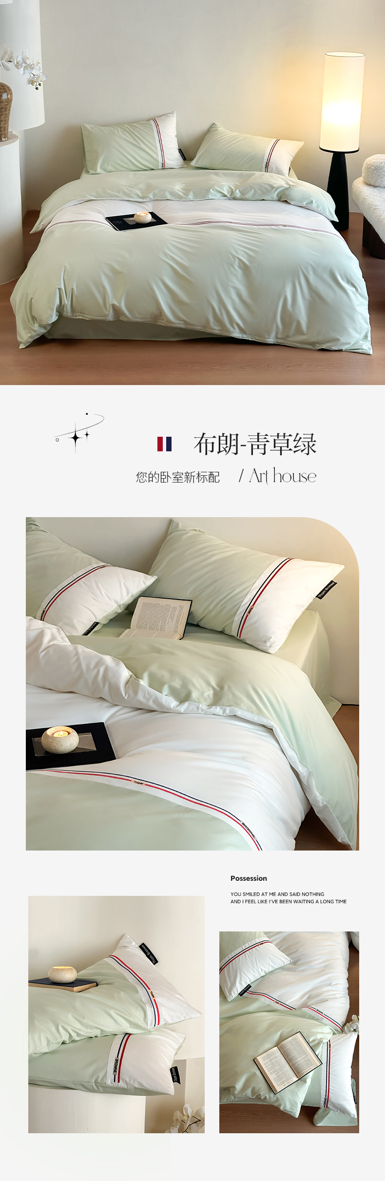 商品名称:卡巴伦家纺 2025新款全棉A类绣花拼接款四件套-布朗 布朗-青草绿
