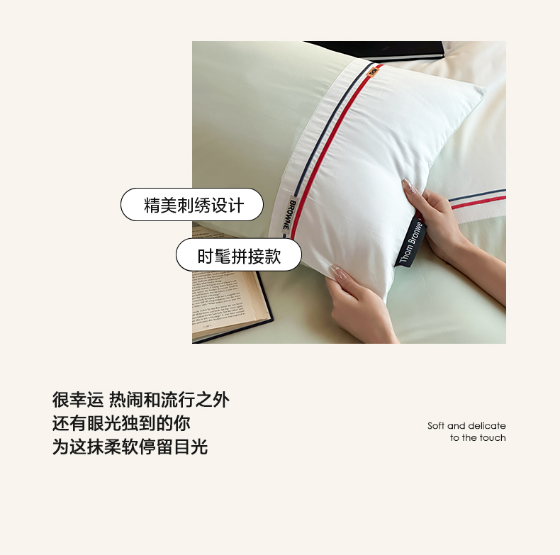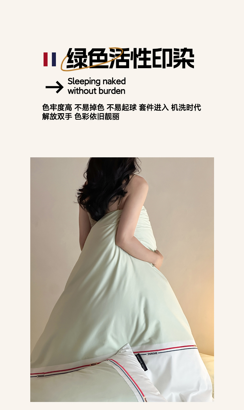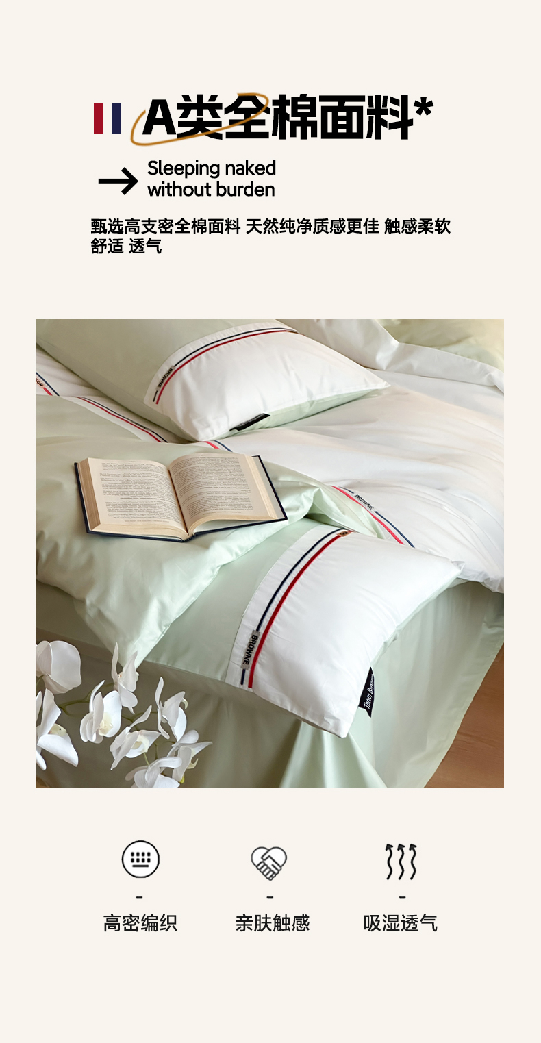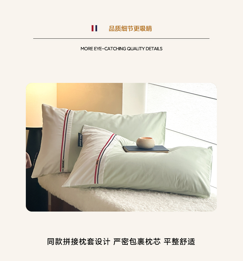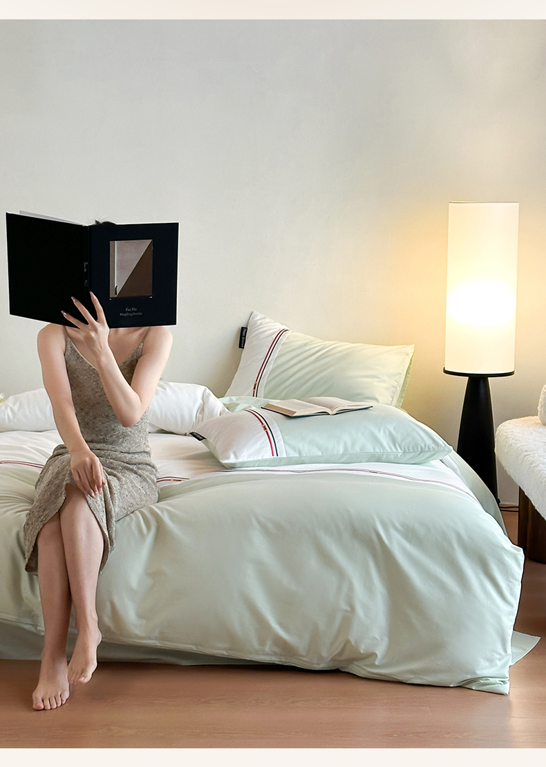 商品名称:卡巴伦家纺 2025新款全棉A类绣花拼接款四件套-布朗 布朗-青草绿