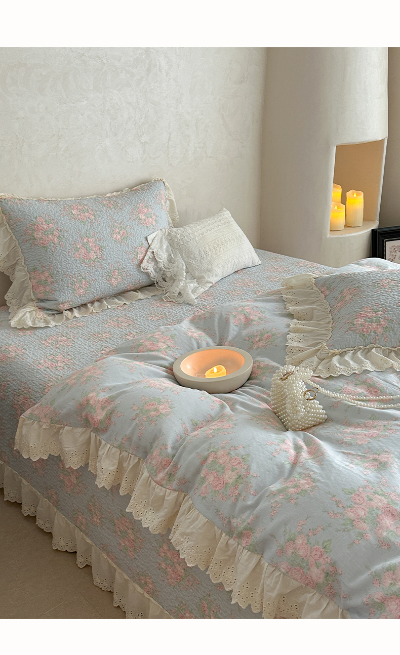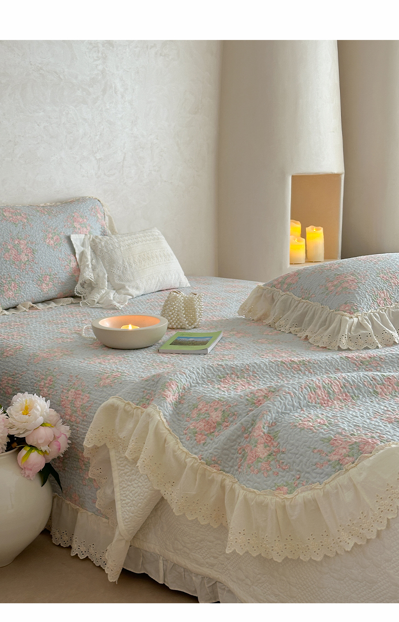 2025新款法式花边印花款全棉双层纱床盖三件套 欧月花影