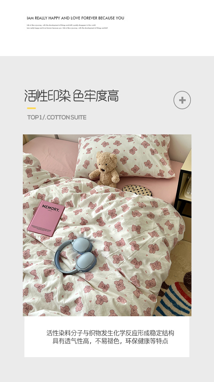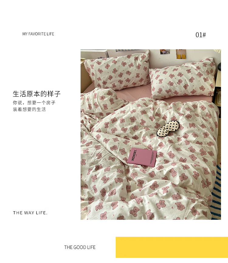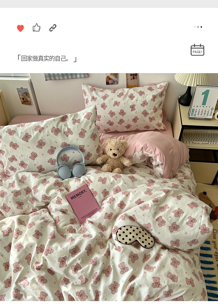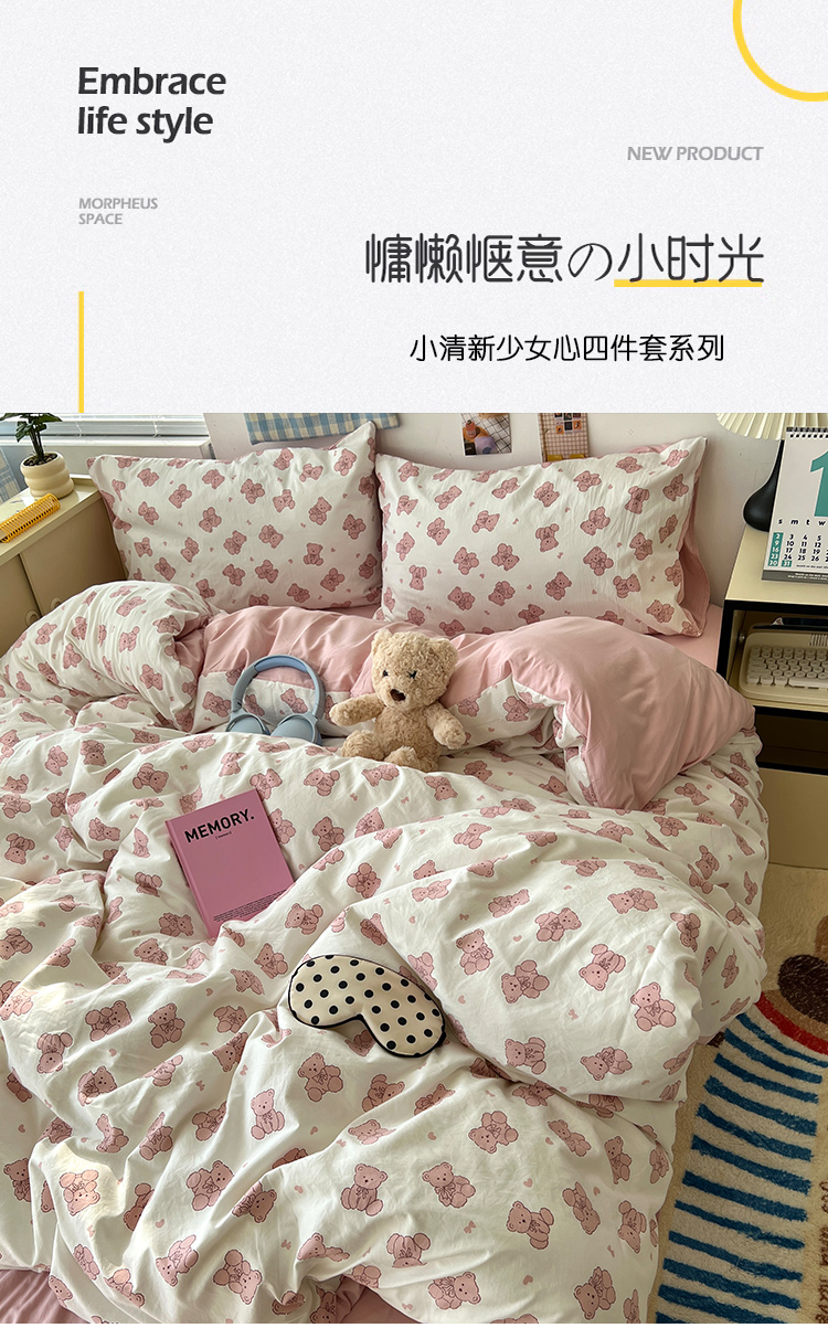 当前位置: 91家纺网 > 商品网购 > 床品套件 > 四件套 > 其它四件套 > 原素 2025软绵绵的双拼印花水洗棉四件套 韩系熊熊子