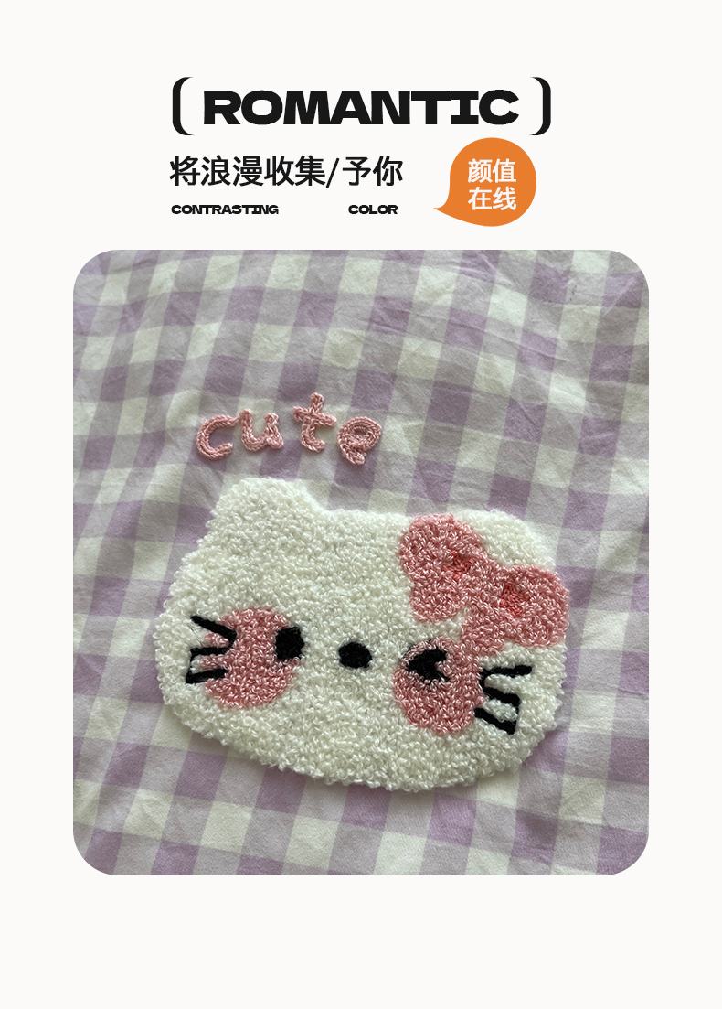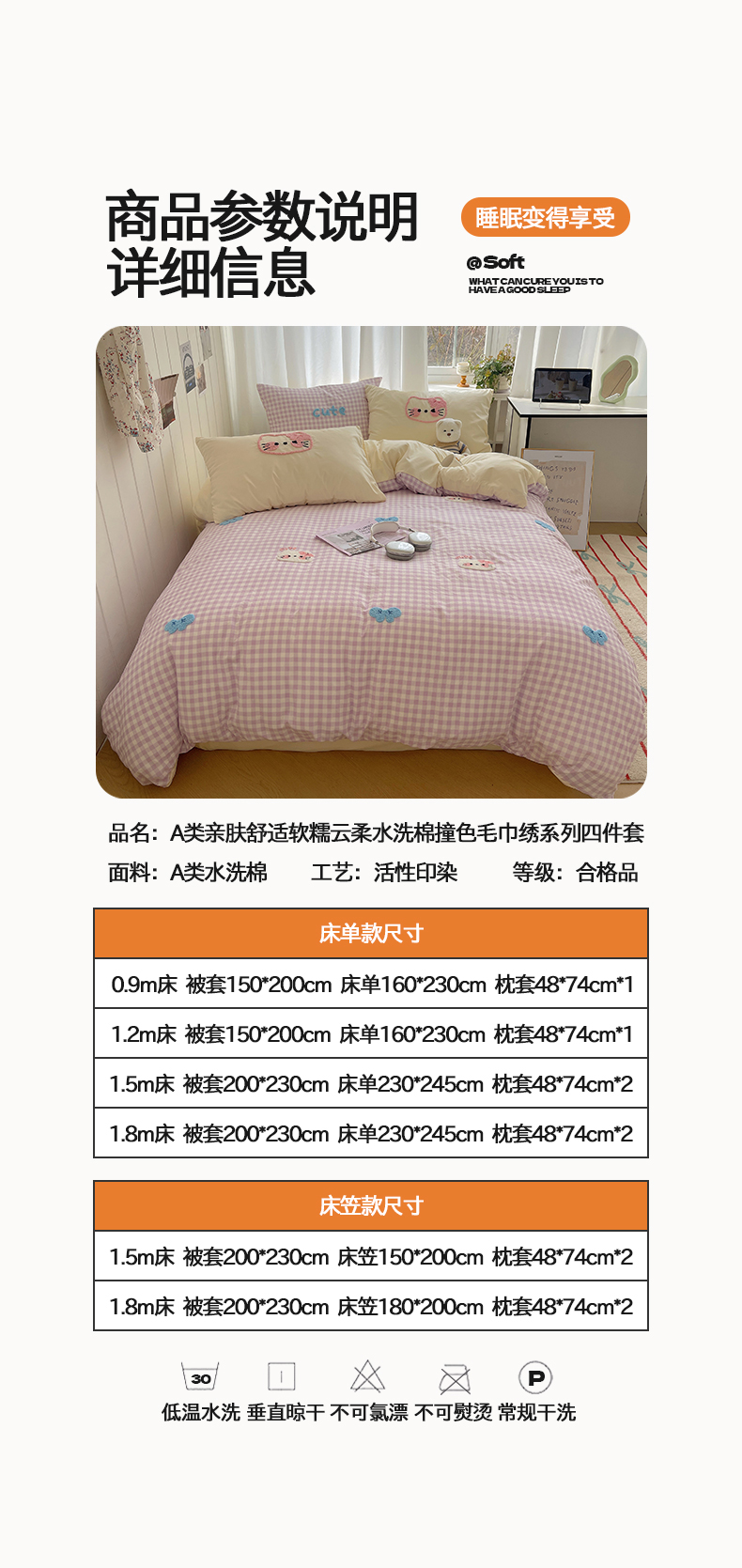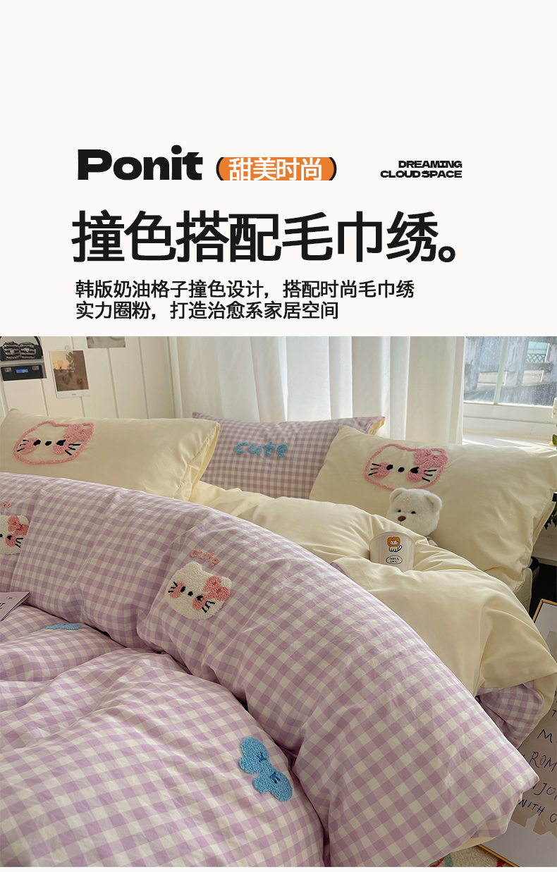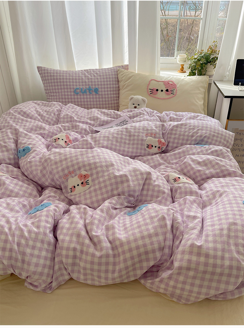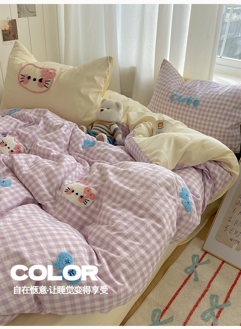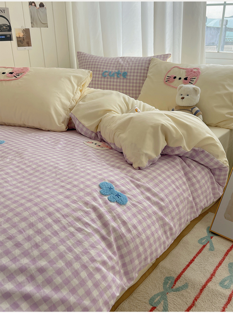 当前位置: 91家纺网 > 商品网购 > 床品套件 > 四件套 > 水洗棉四件套 > 桃心家居 2025新款A类亲肤舒适软糯云柔水洗棉奶油格子撞色毛巾绣猫咪蝴蝶结水洗棉系列四件套 云柔水洗棉-蝴蝶结猫咪紫黄
